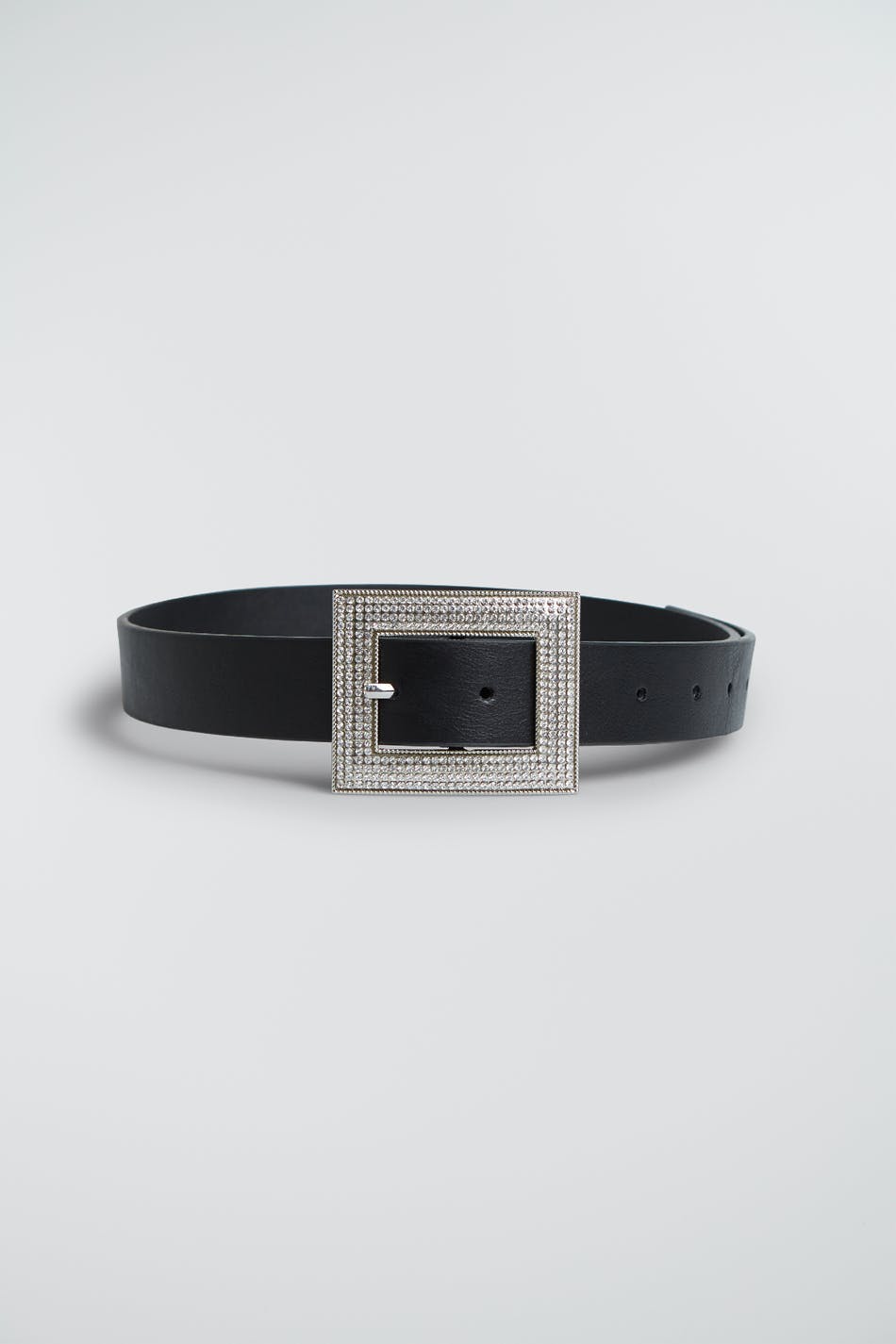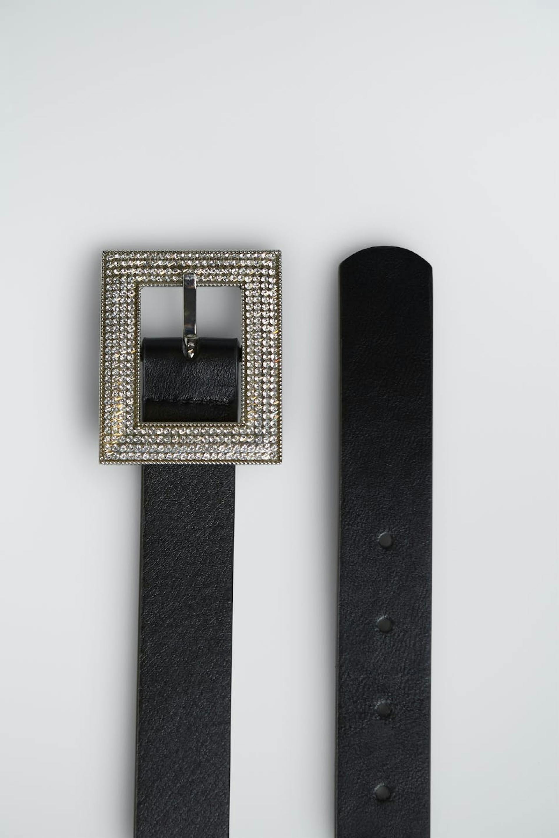 Belt with a big buckle with rhinestone. The belt is black. It is made of PU.