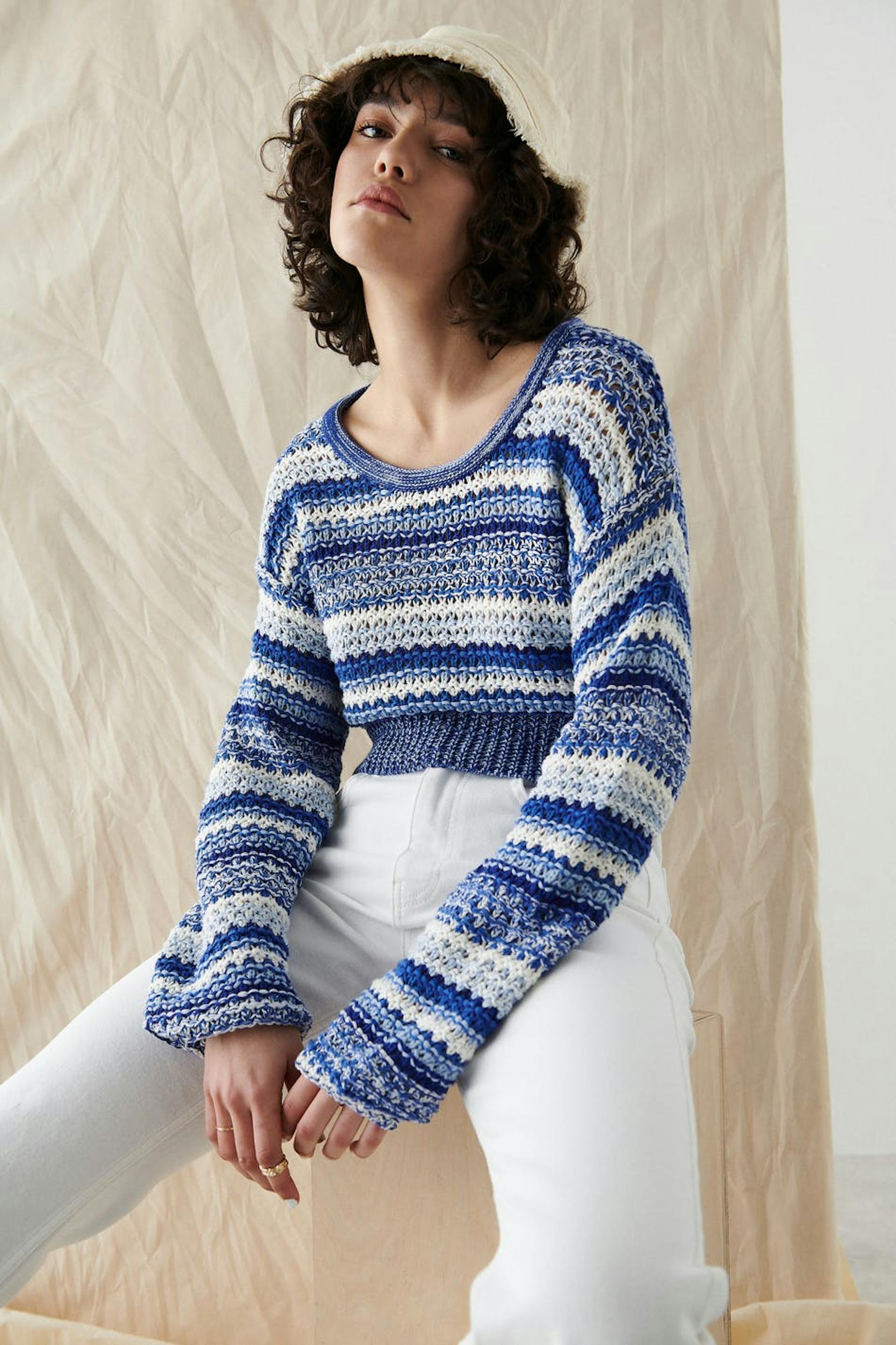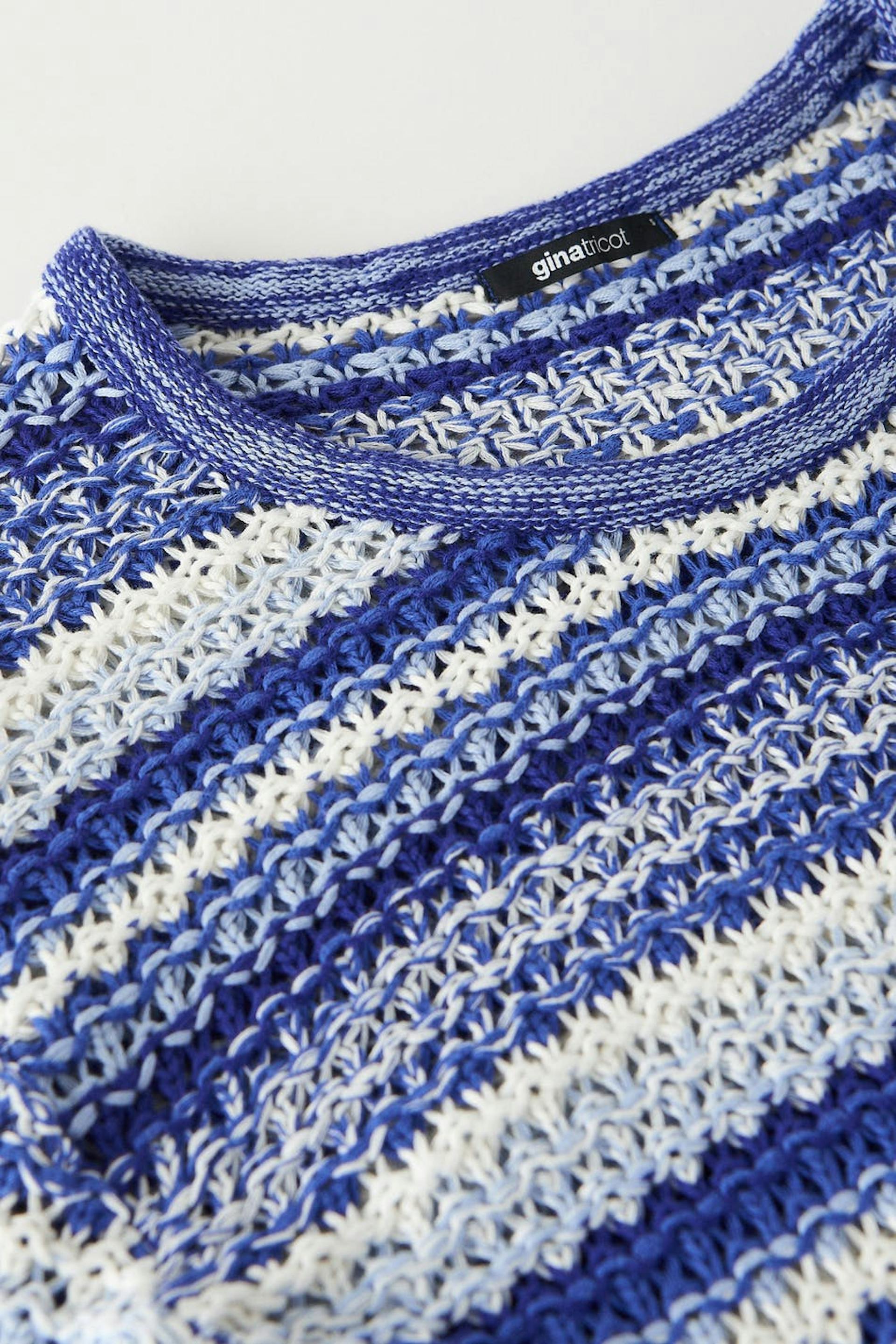 Striped knitted sweater with a rounded neckline. The sweat is blue and has a cropped length. It has a ribbed hem and dropped shoulders.