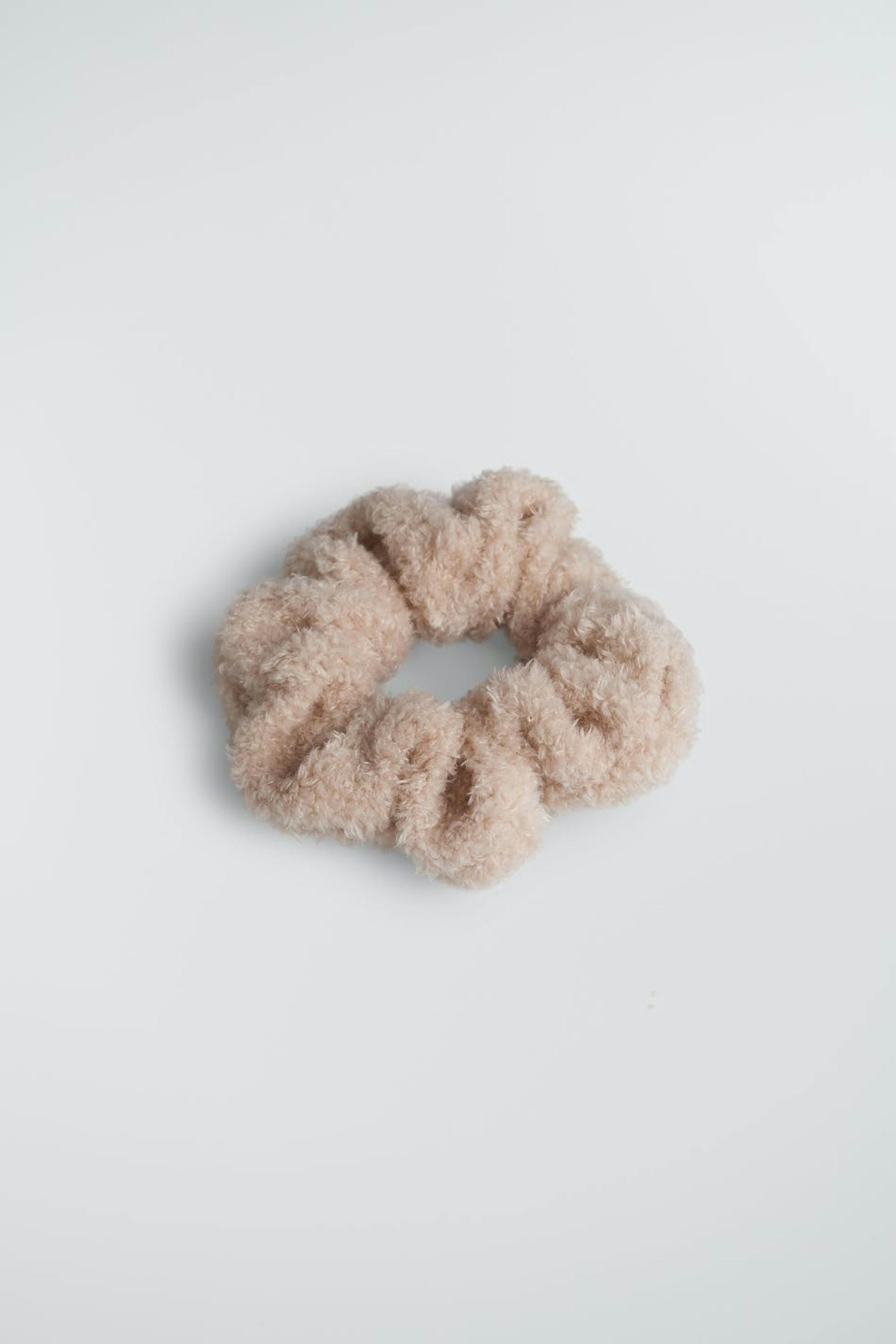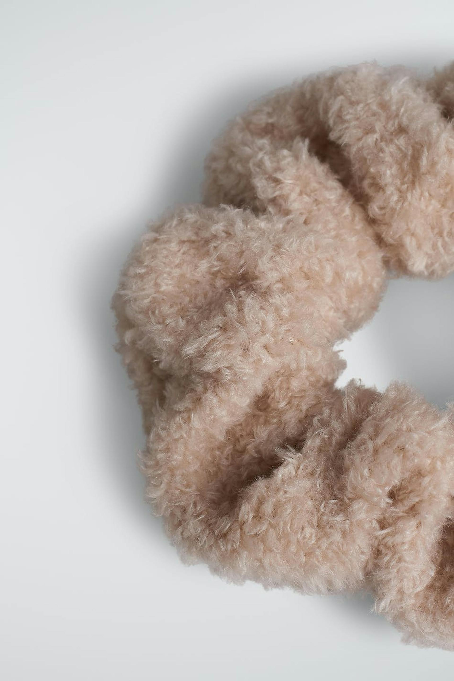 Haargummi mit einem Teddy-Material. Der Haarschmuck ist beige.