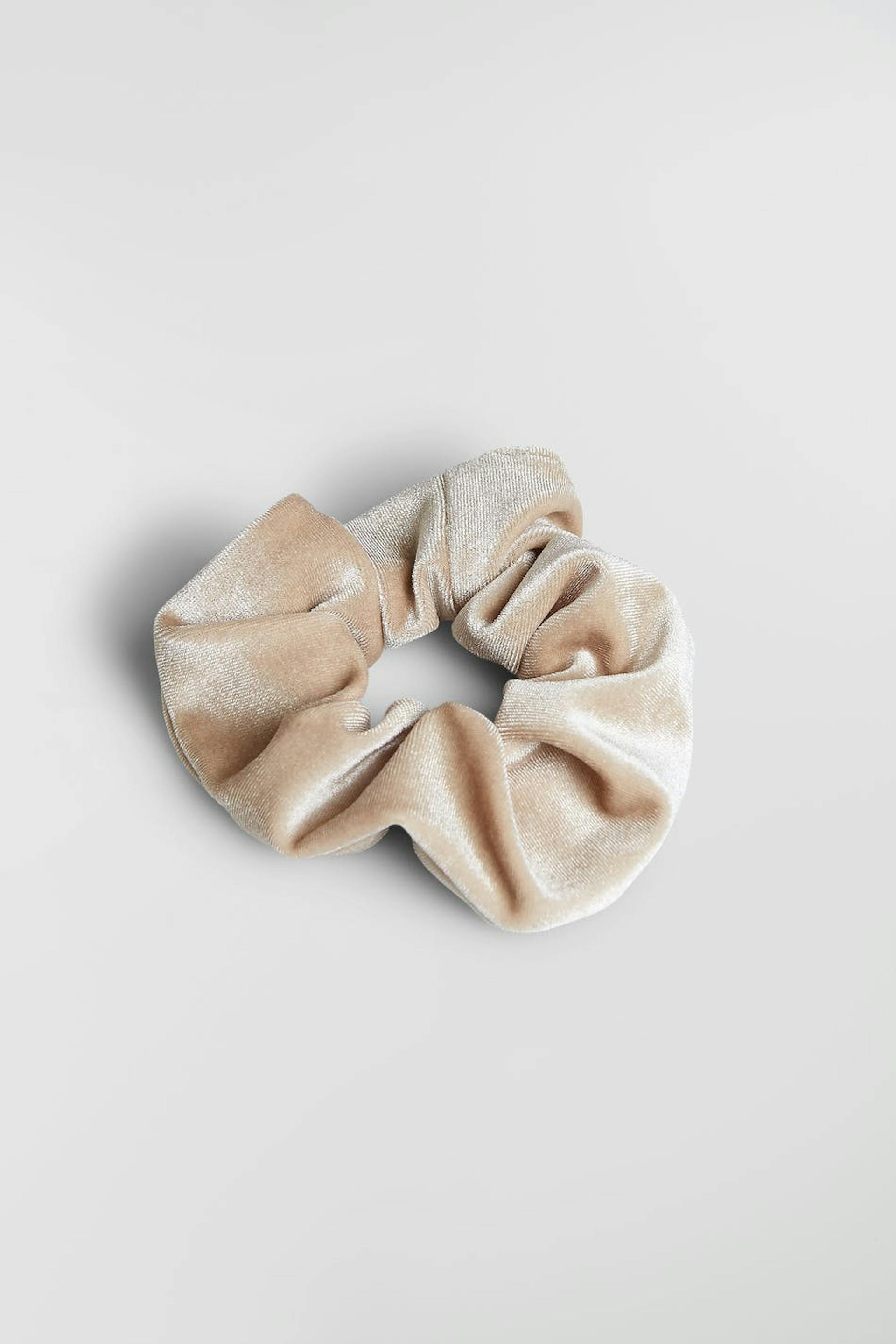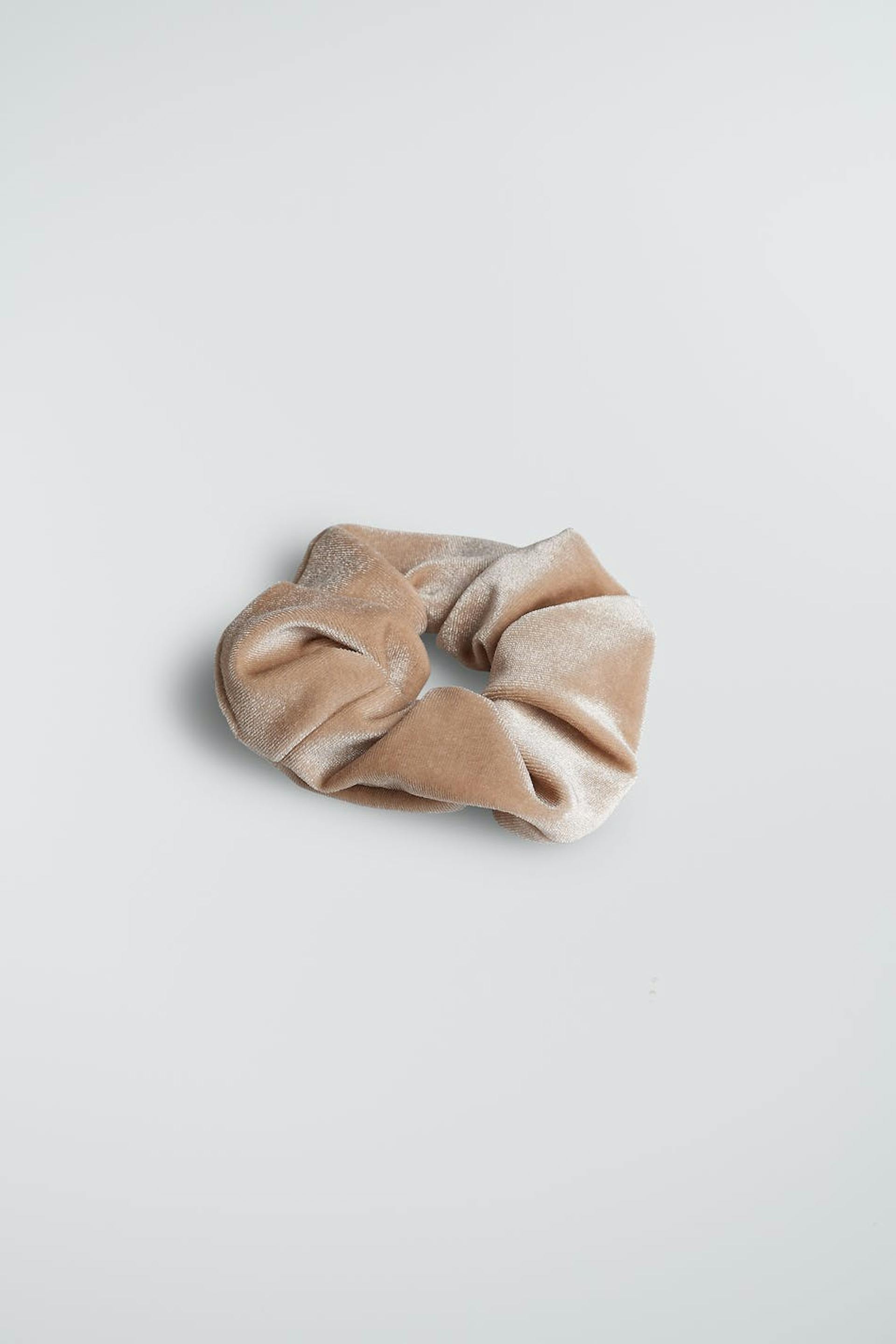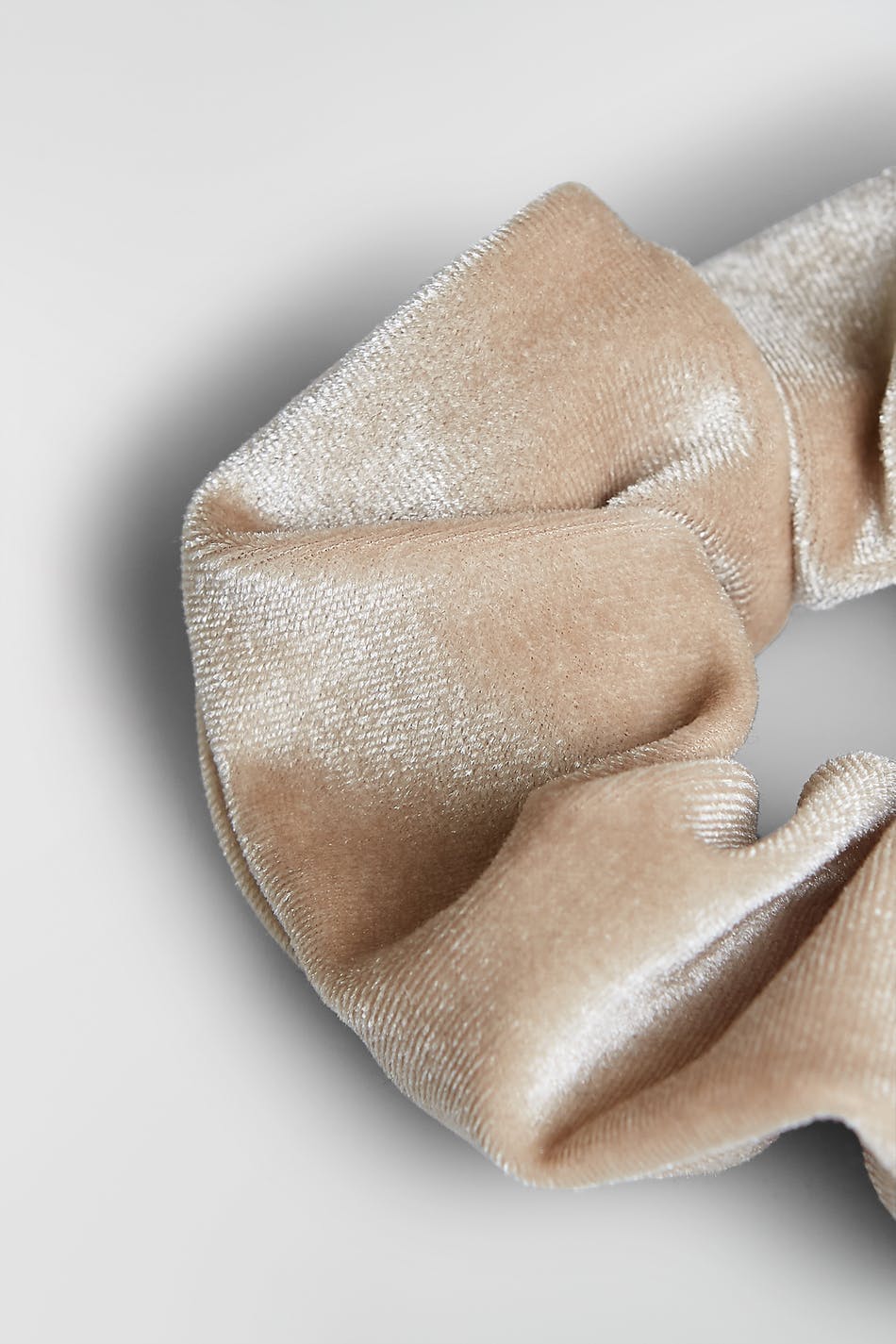 Champagnerfarbener Haargummi. Der Haarschmuck ist beige. Er ist hergestellt aus Samt.