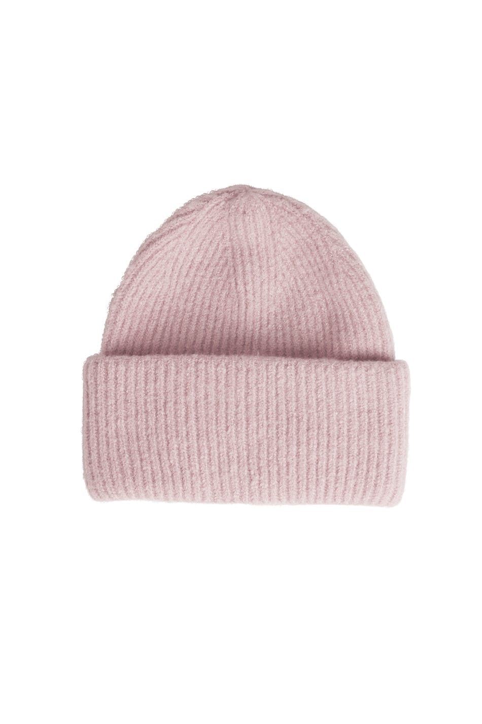 Beanie-Mütze mit einem Rippenstrick und gefaltetem Rand. Die Beanie-Mütze ist rosa.