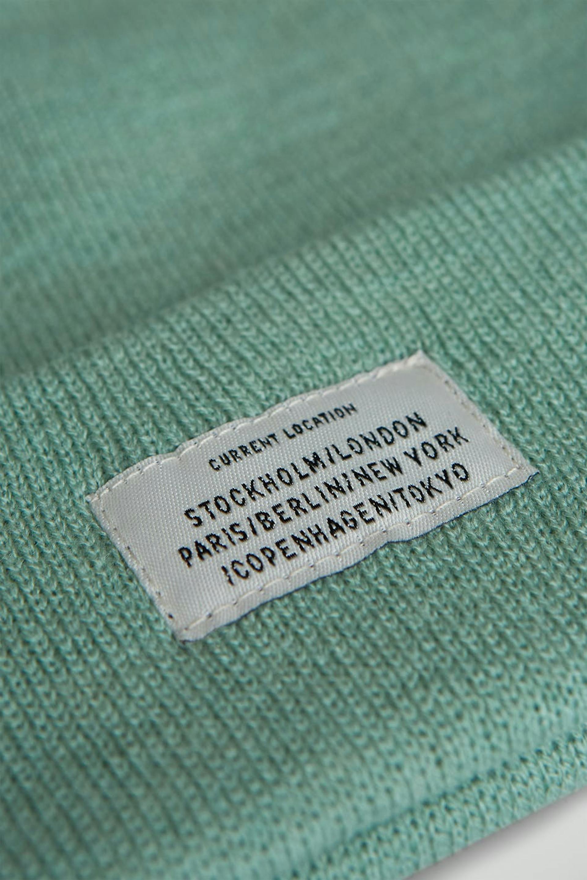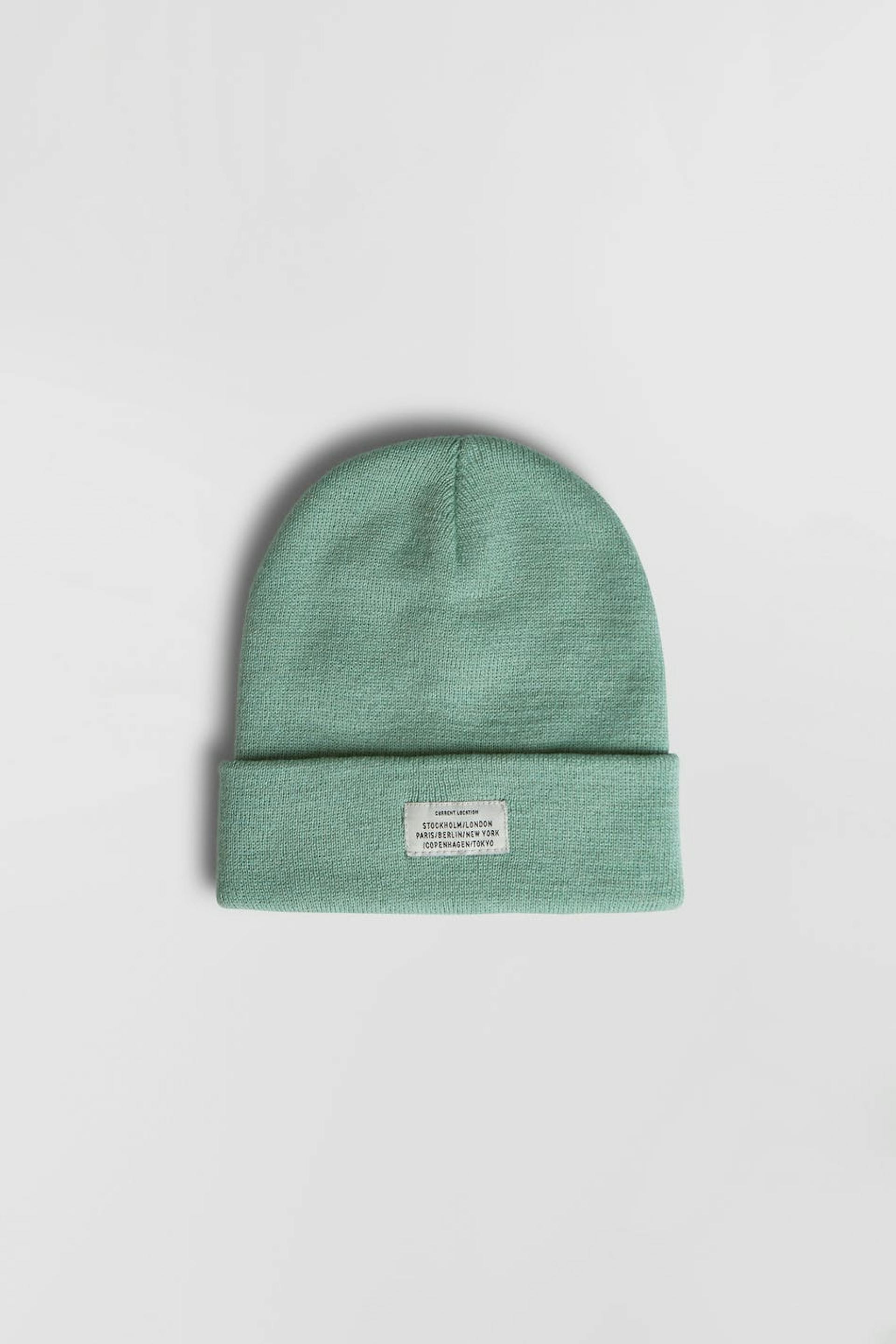 Beanie-Mütze mit gesticktem Text. Die Beanie-Mütze ist grün und hat eine gefaltete Kante.