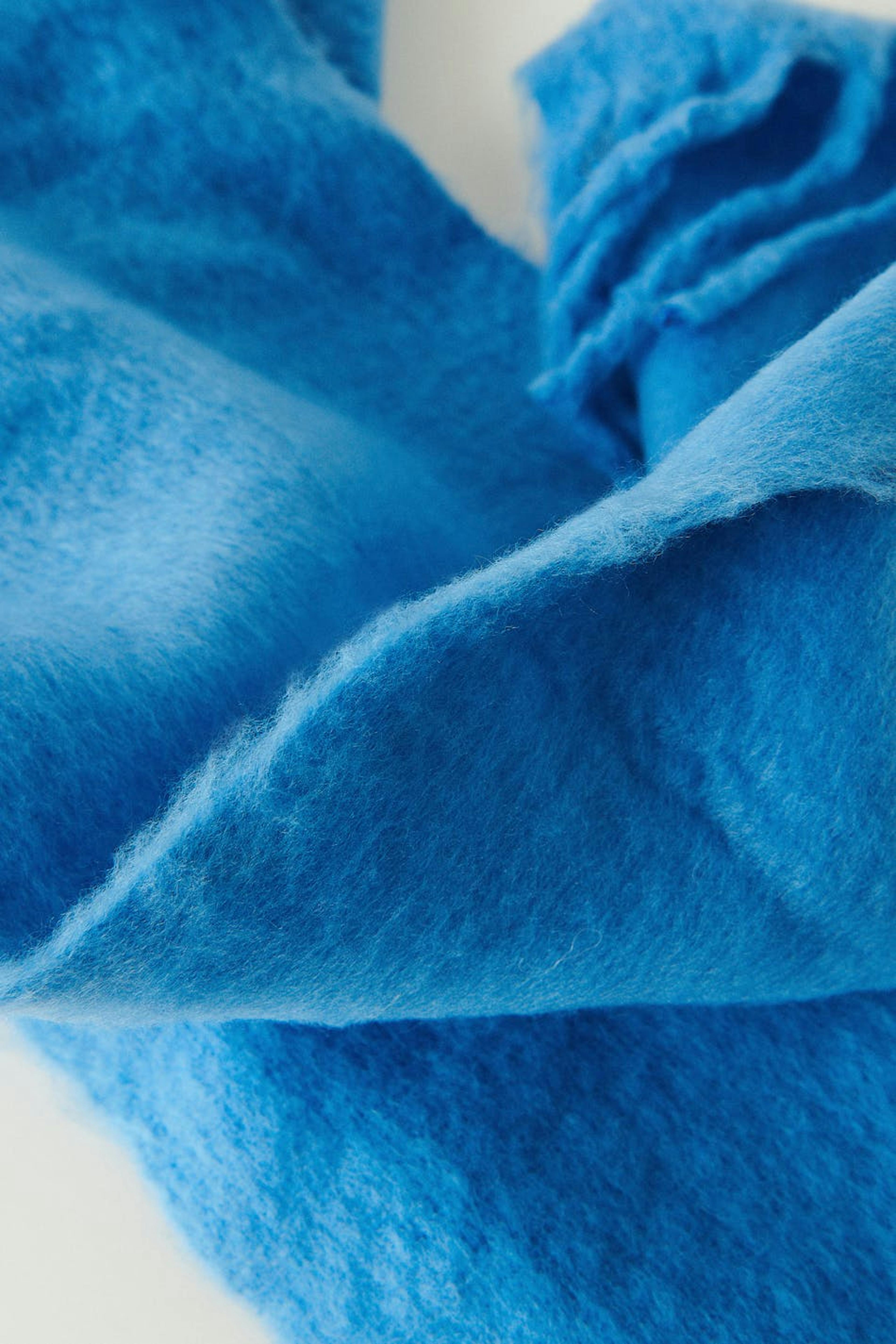 Weich gebürstet Schal mit Fransen am kurzen Ende. Der Schal ist blau.