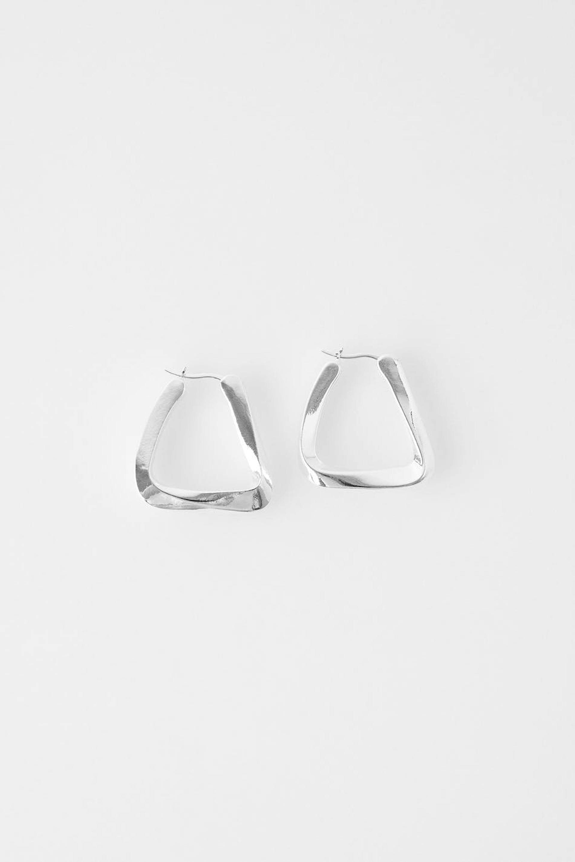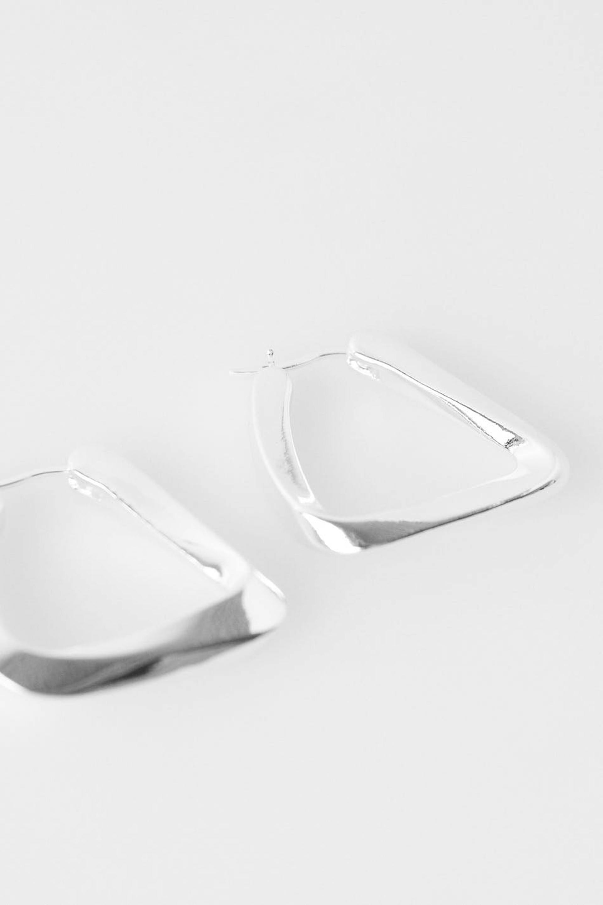 Eckige Ohrringe mit gedrehtem Design. Die Ohrringe sind silbern.