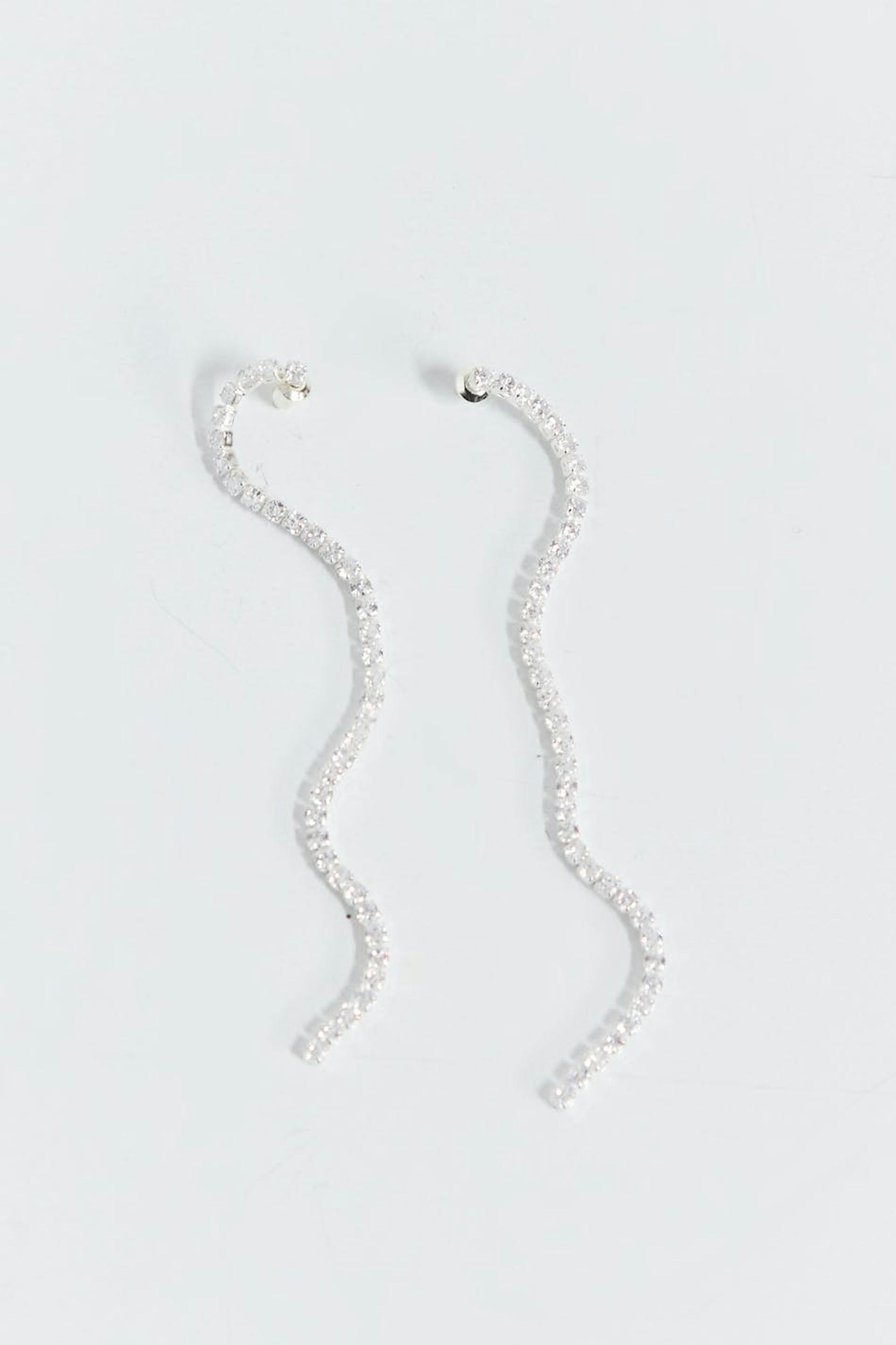 Lange Strass-Ohrringe mit dekorativen Steinen. Die Ohrringe sind silbern.