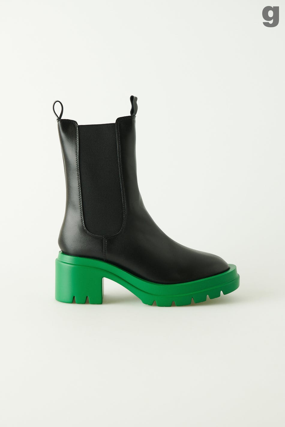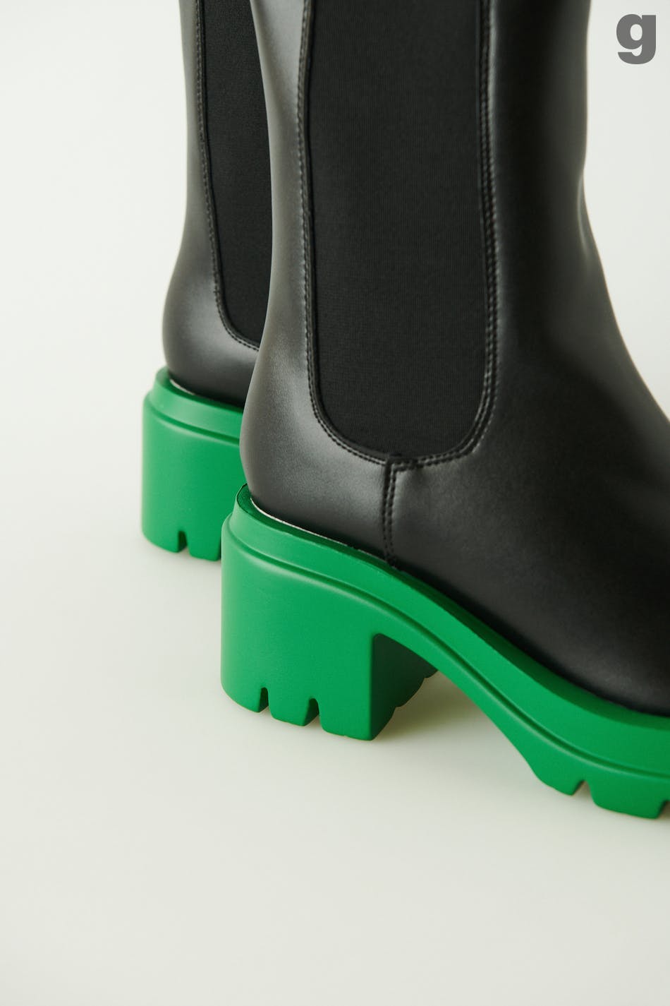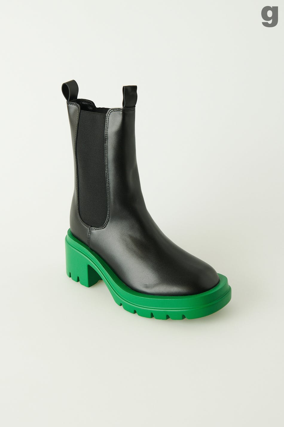Klobige Boots aus PU mit mittelhohem Schaft. Die Boots sind schwarz und haben grüne Sohlen. Sie haben Gummiband in den Seiten und Absatz.