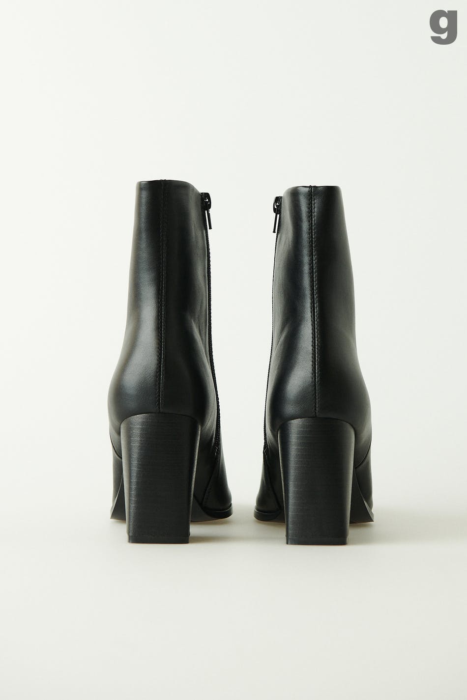 Boots aus PU mit einem hohen Absatz und Vorderkappe mit quadratischer Spitze. Die Boots sind schwarz und haben mittelhohen Schaft. Sie haben dekorative Säume vorne, viereckigen Absatz und Verschluss mit Reißverschluss auf der Innenseite.