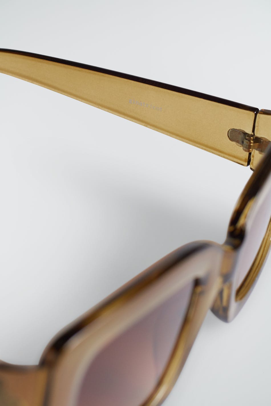 Rechteckige Sonnenbrillen mit einem großen Kunststoffrahmen. Die Sonnenbrillen sind grün.