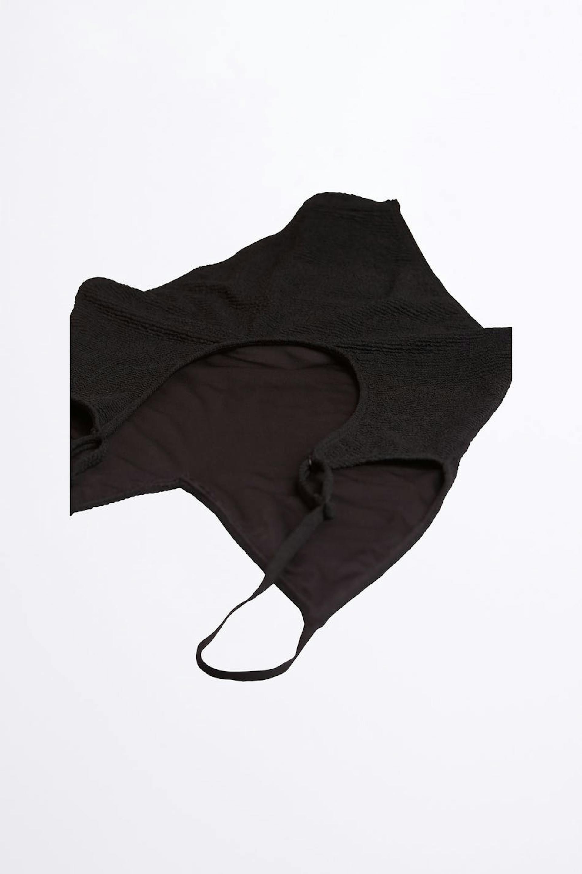 Badeanzug mit einem V-Ausschnitt. Der Badeanzug ist schwarz und hat einstellbare Trägerbänder.