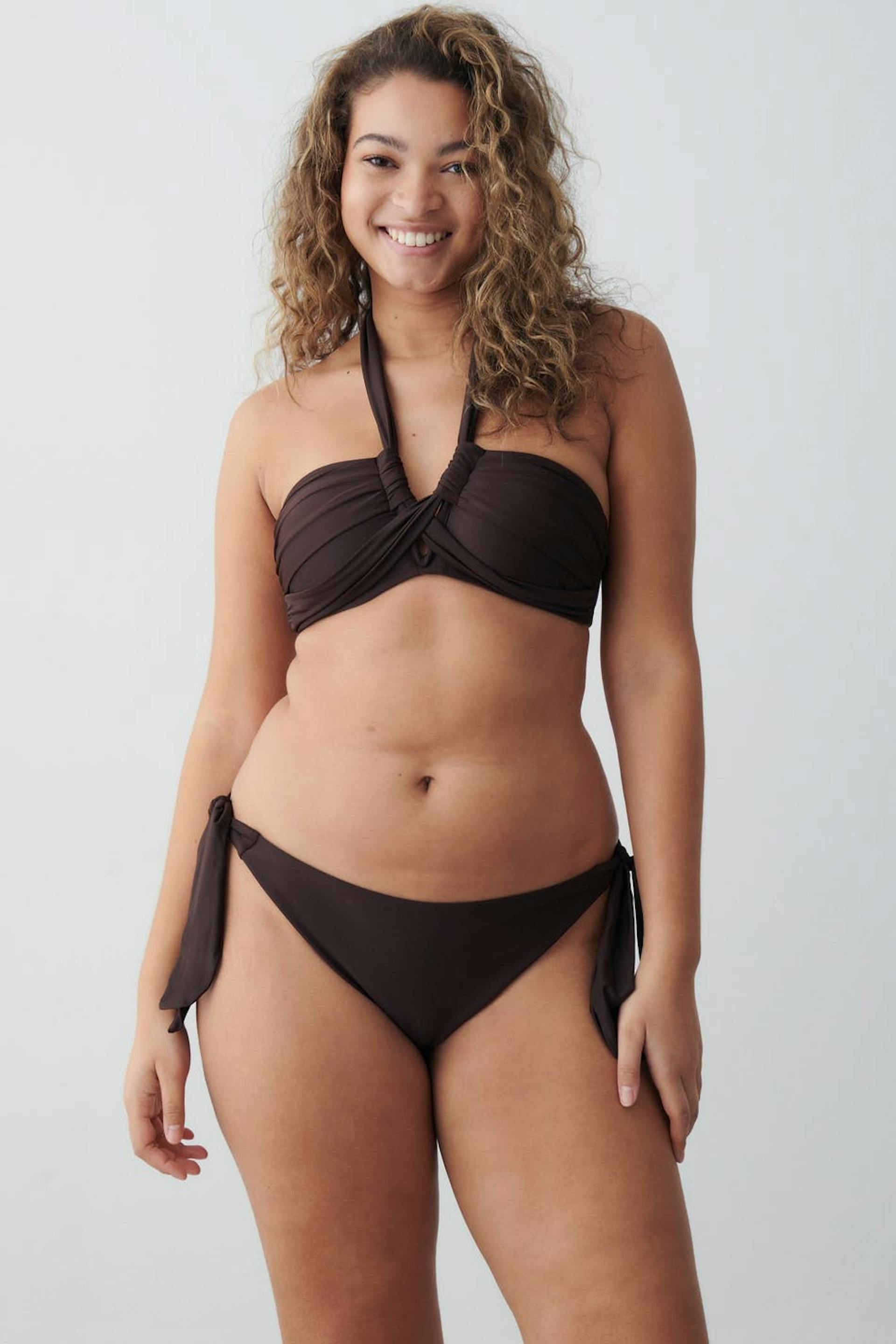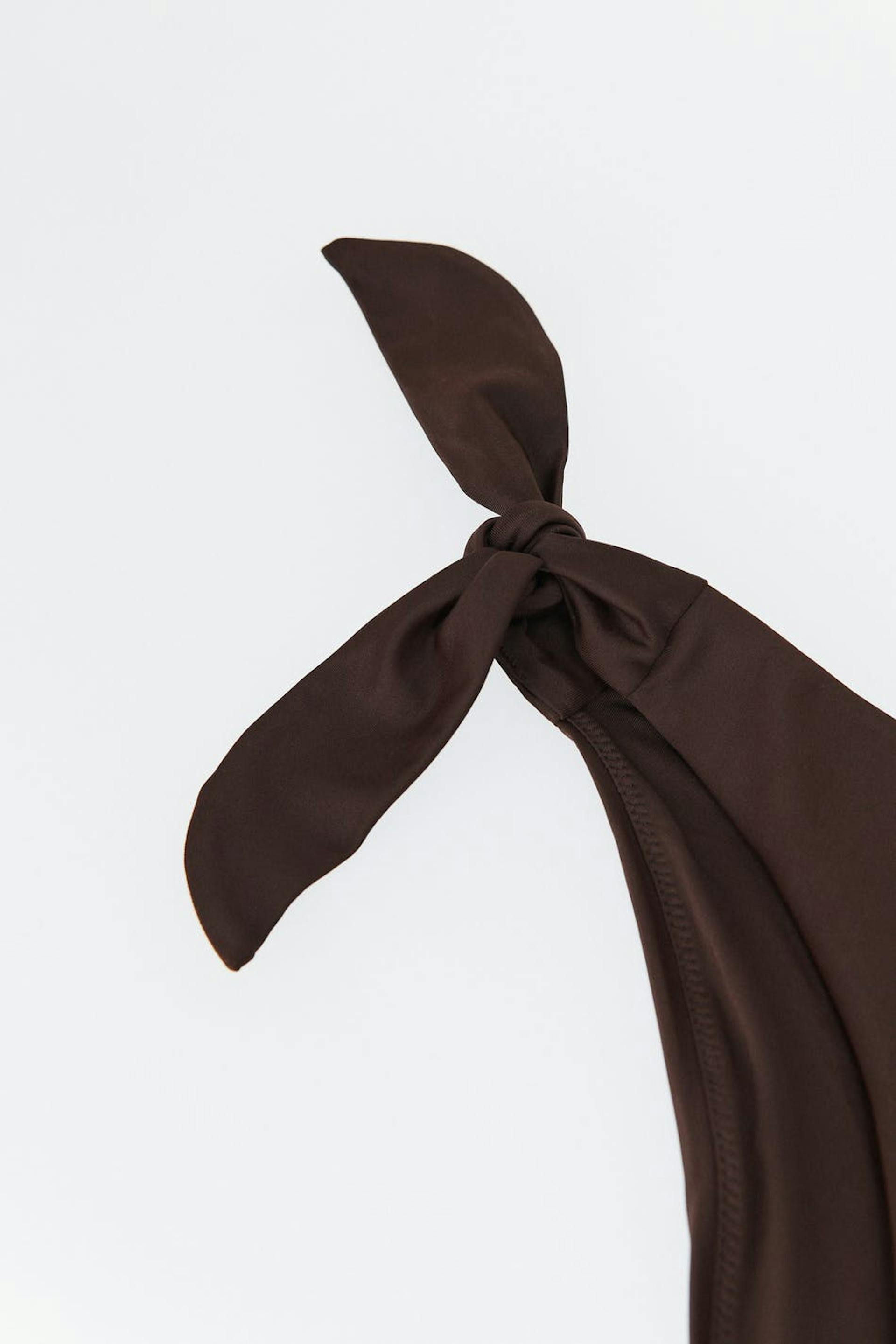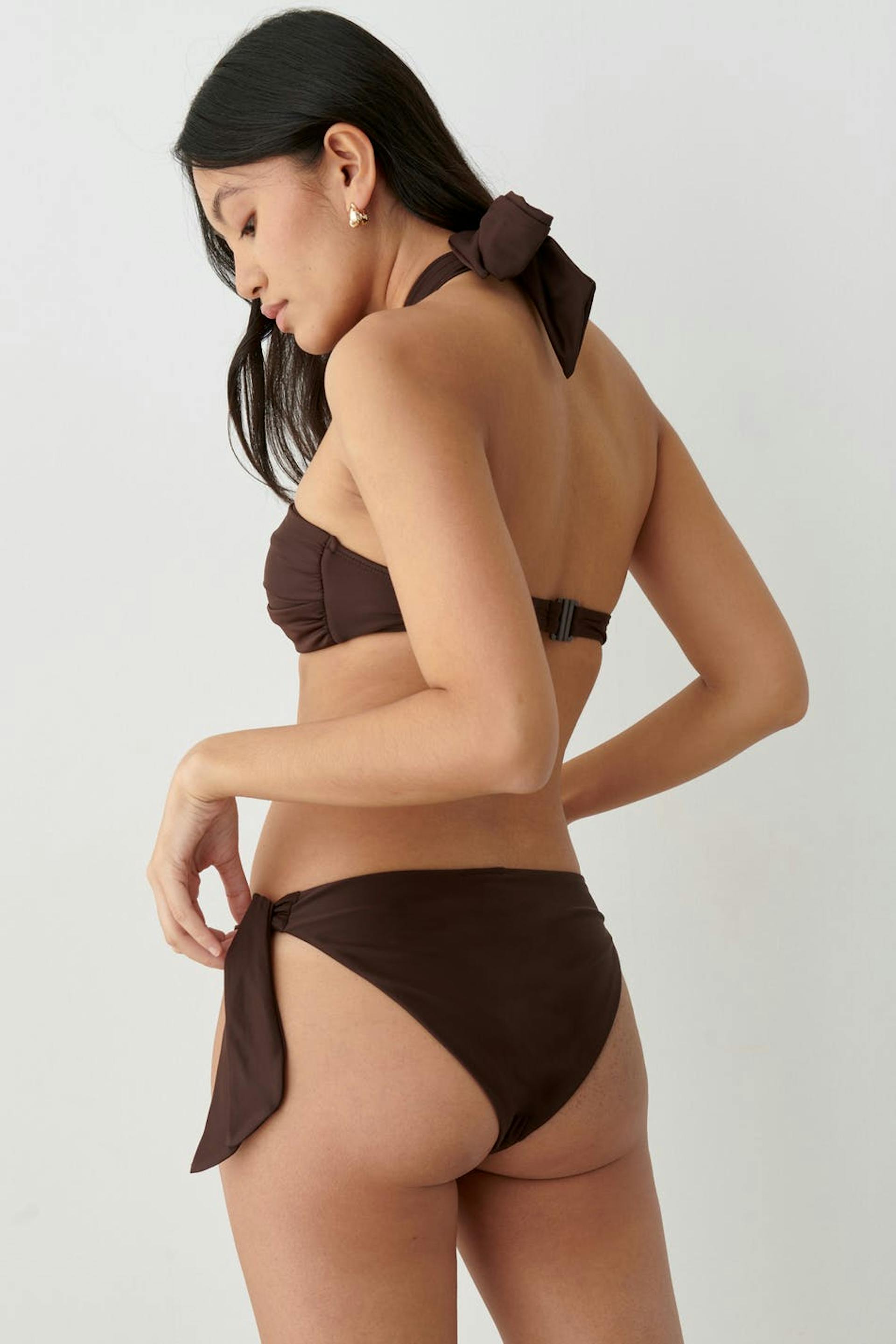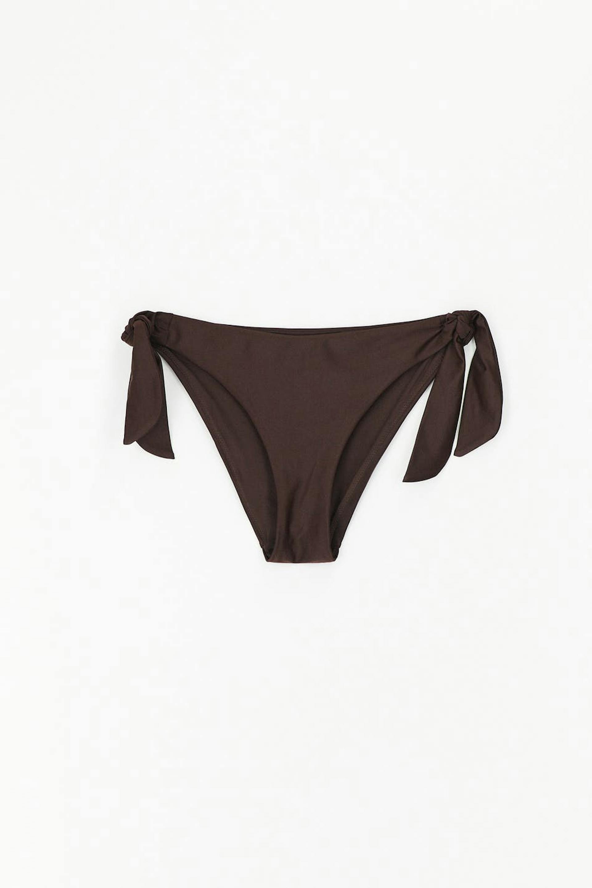 Vollständig gefütterte Bikini-Unterteile mit Krawatten in den Seiten. Die Höschen sind braun und haben weiches Gummiband an den Enden.