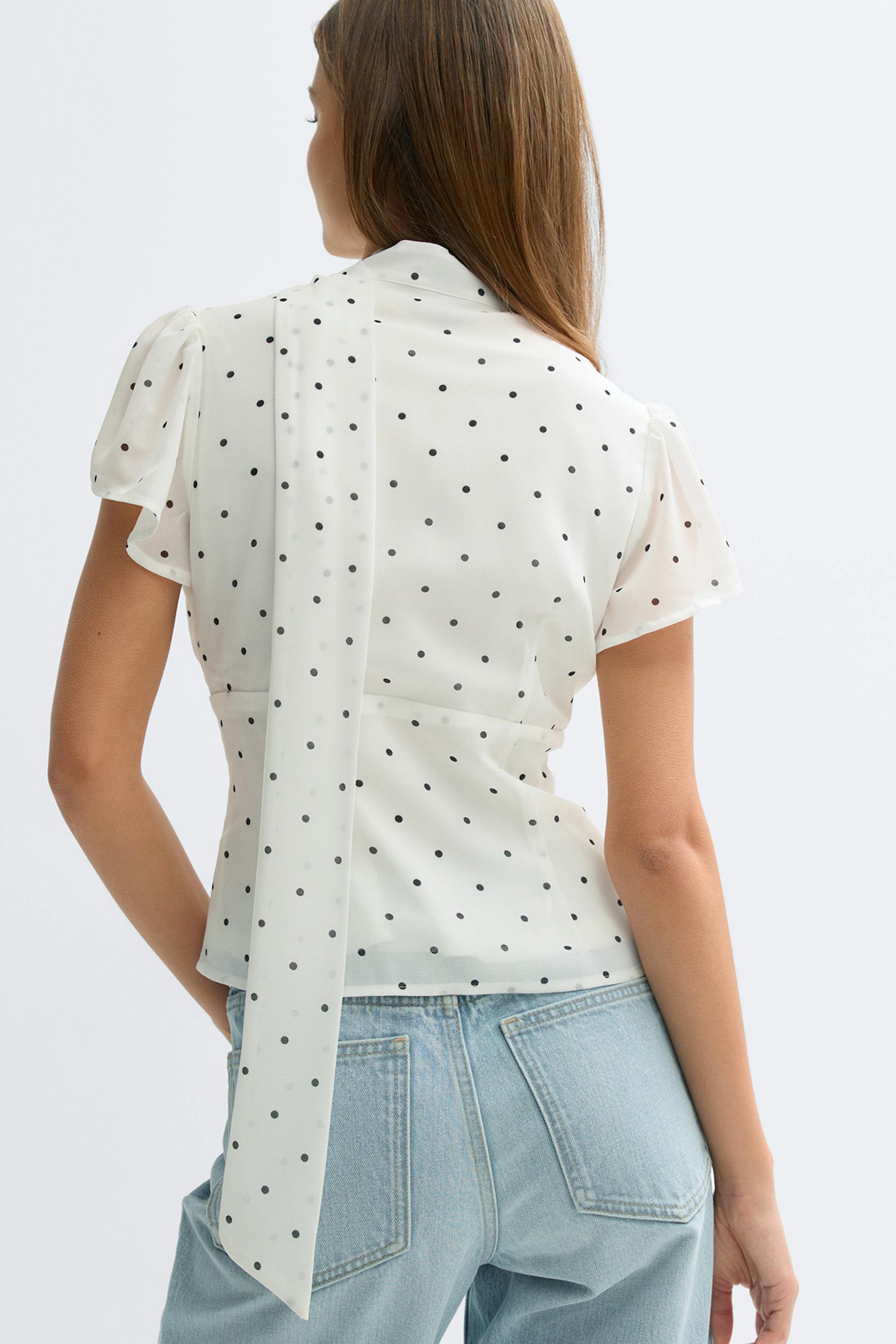 Weiße, durchsichtige, kurzärmelige Polka-Dot-Bluse mit schwarzen Punkten - hoher Halsausschnitt mit langem Schal zum Binden, Schlüsselloch auf der Vorderseite und Mieder mit verdeckten Knöpfen - kombiniert mit hellen, hoch sitzenden Jeans.