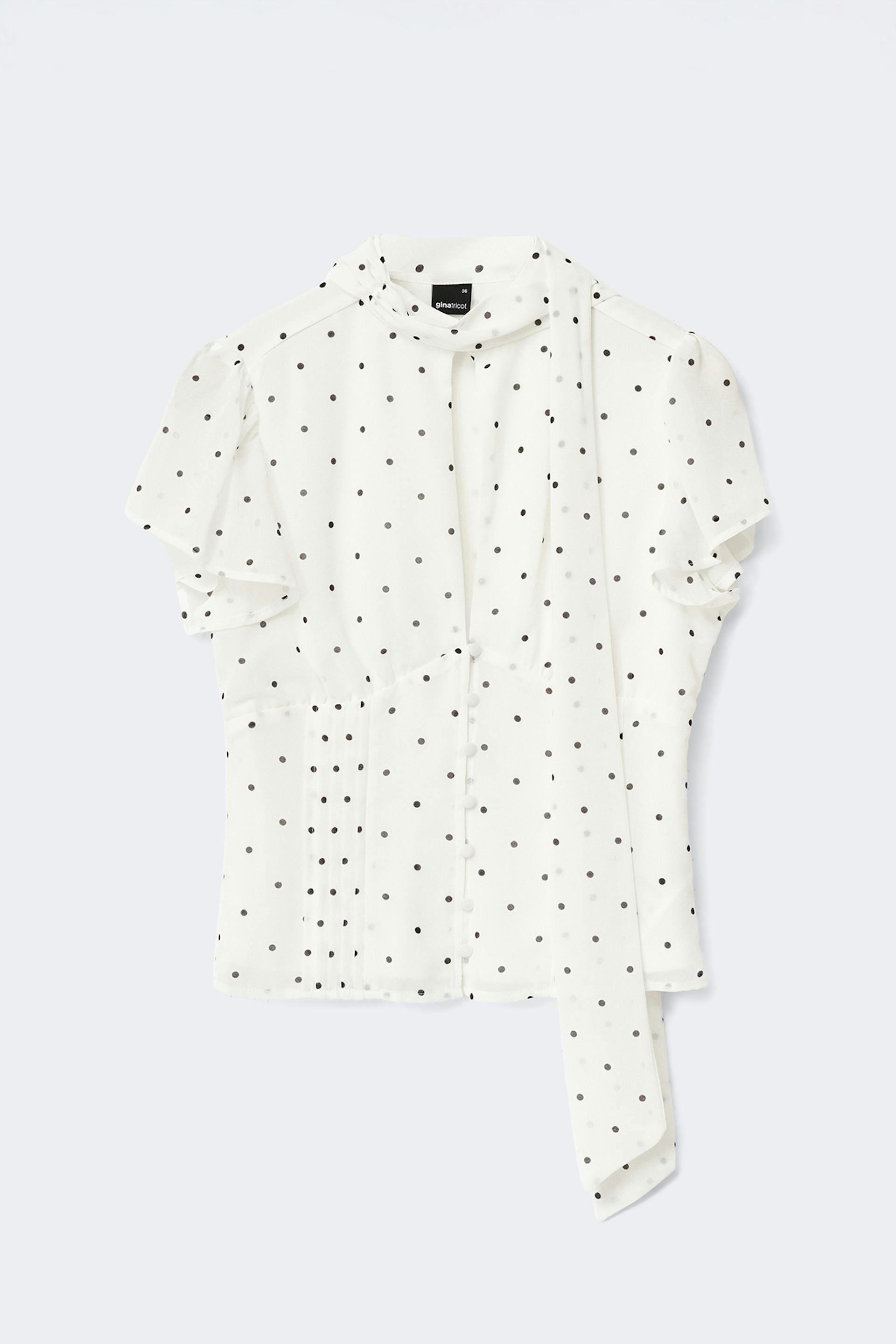 Gepunktete Bluse mit Schal-Detail. Die Bluse ist weiβ und kurzärmlig und hat Schlüssellochöffnung. Sie hat Knöpfe vorne, Kragen und figurbetonte Passform.