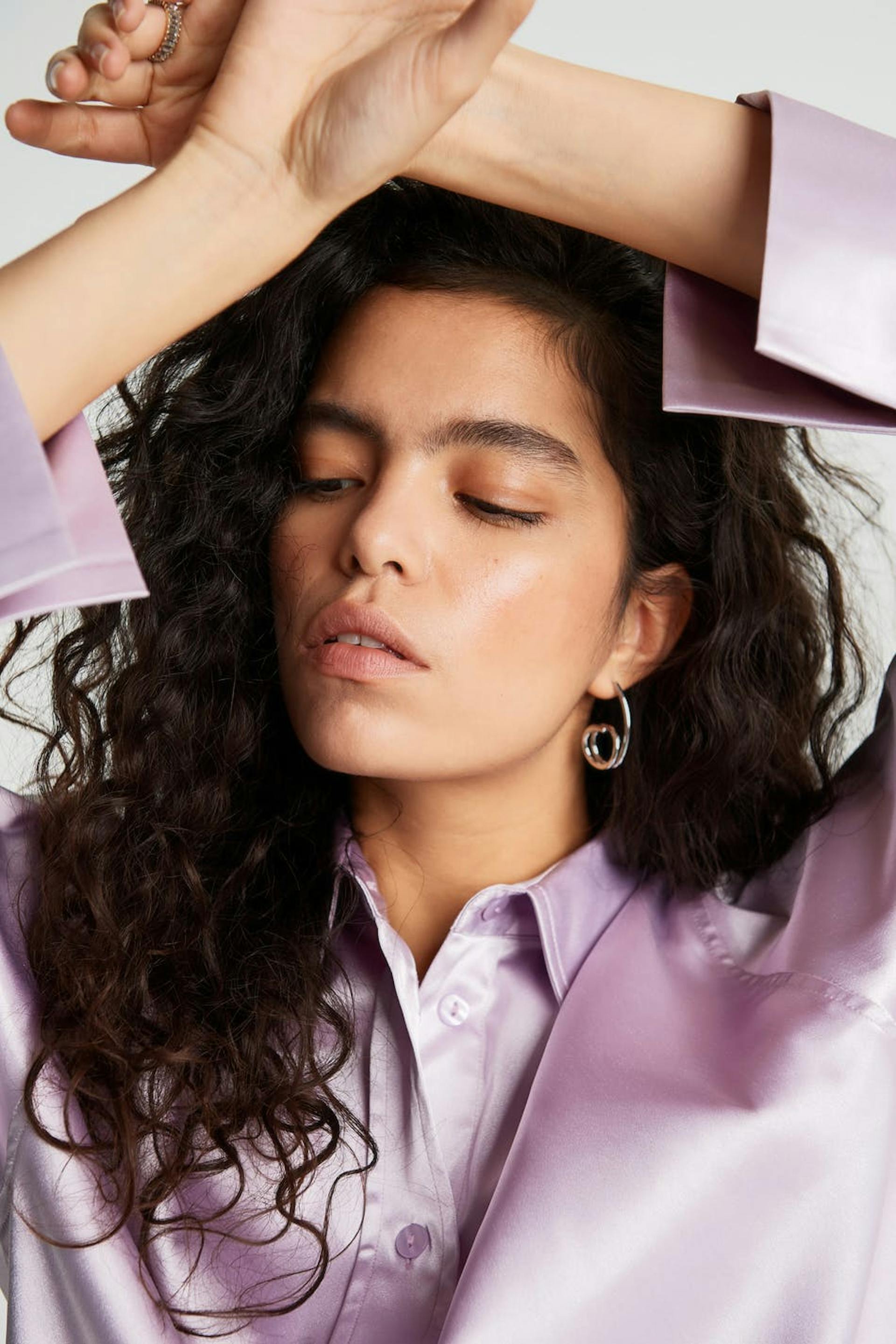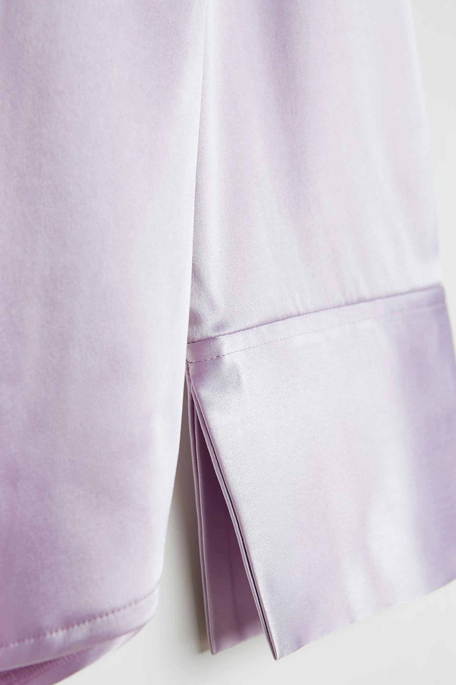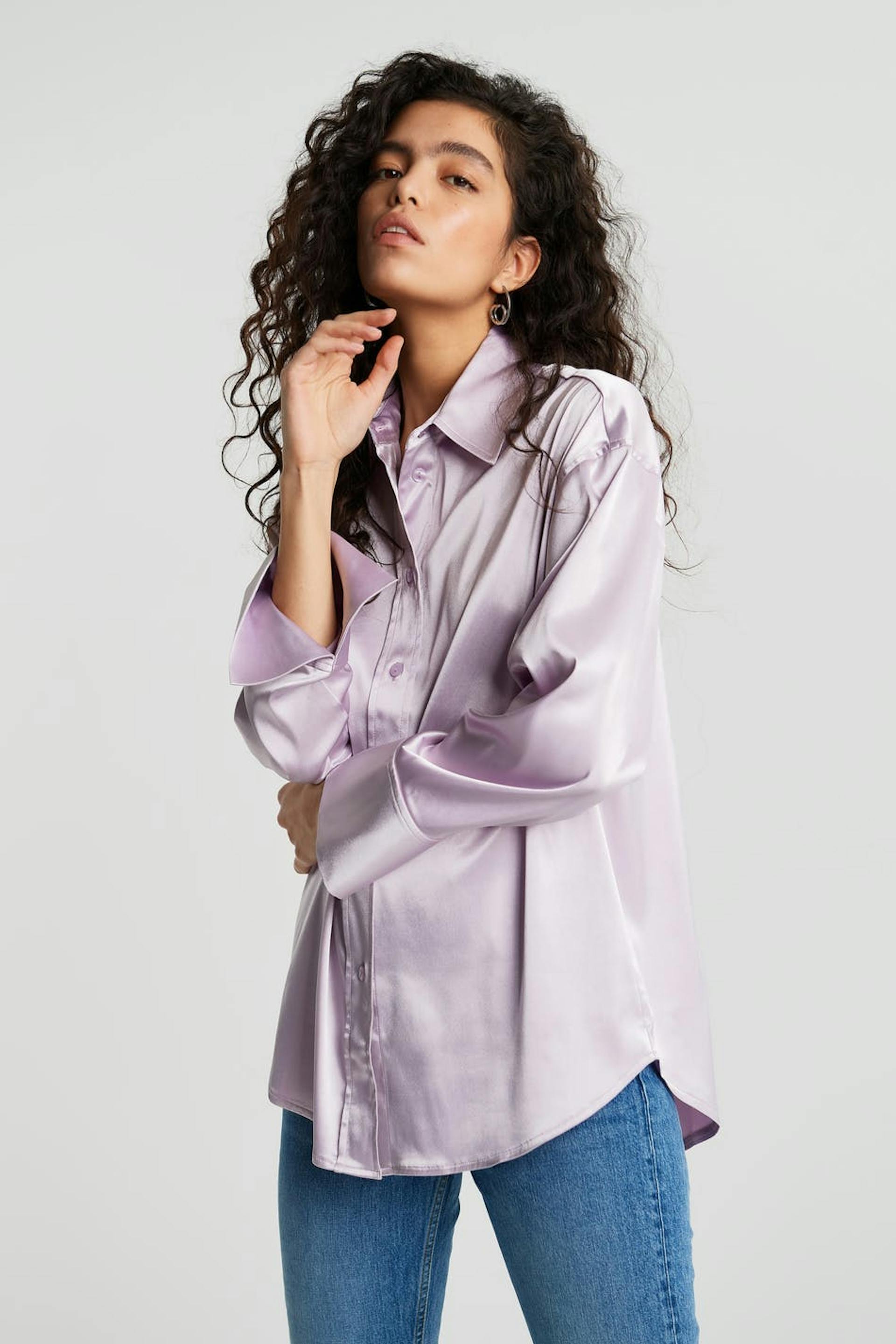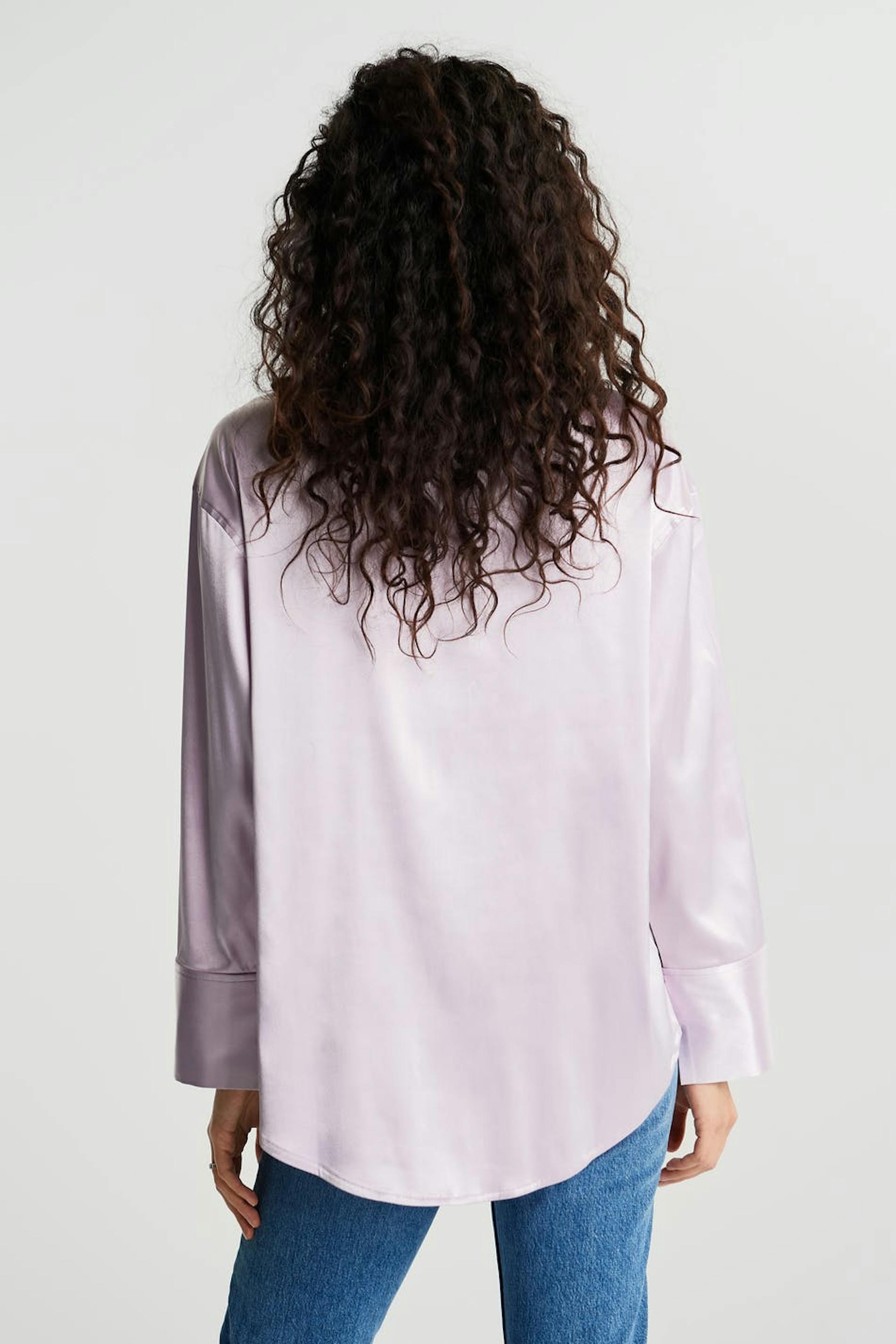 Luftiges Hemd mit einem Kragen. Das Hemd ist lila und auf der Rückseite abgerundet. Es ist hergestellt aus Satin.