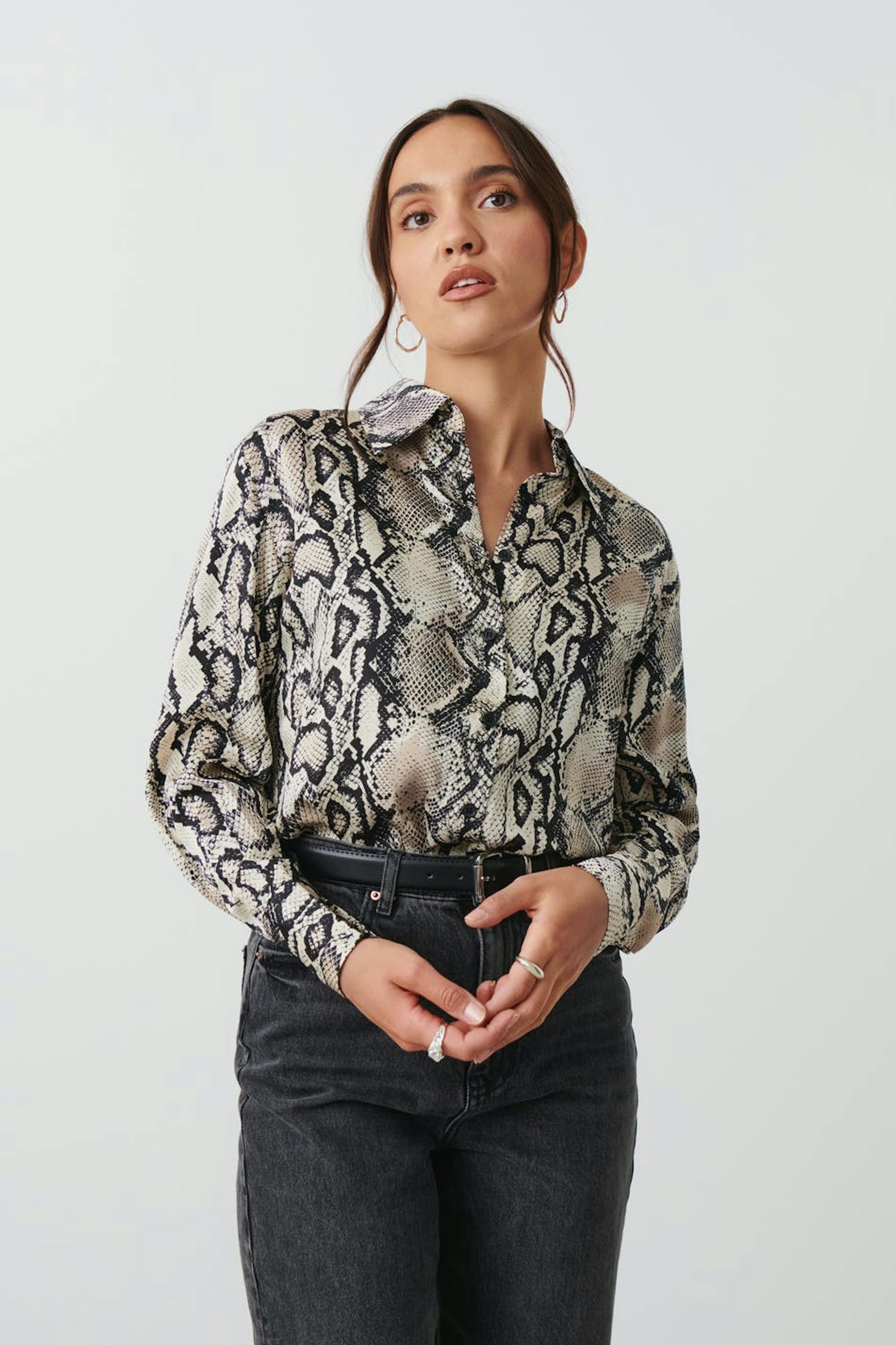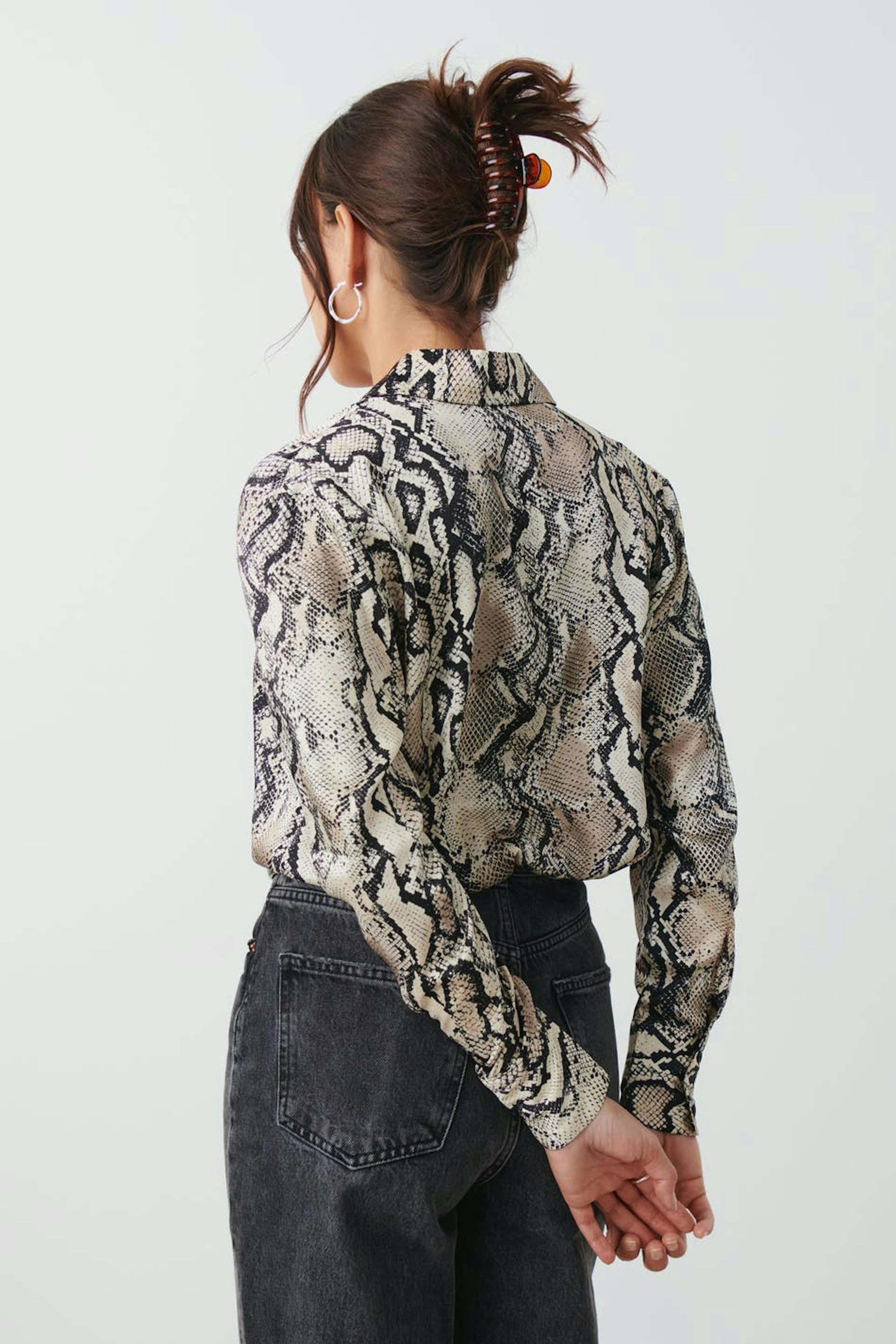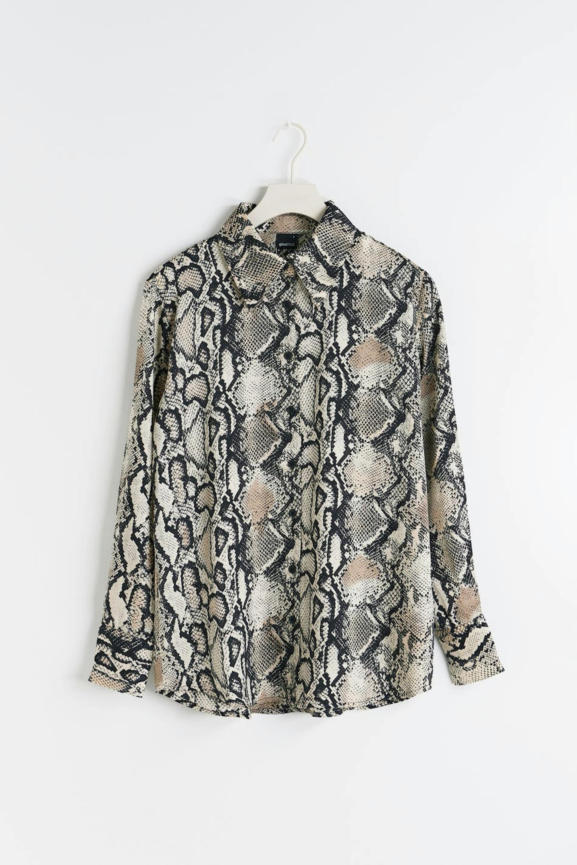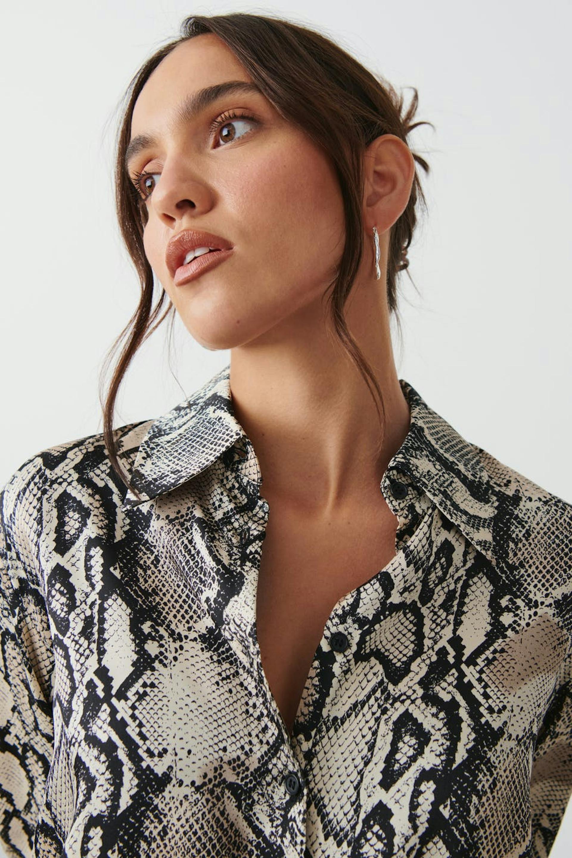 Hemd aus Satin mit lockerer Passform. Das Hemd ist schwarz und hat Knopfleiste vorne. Es hat Kragen und langen Ärmel mit Knopf und Manschette.
