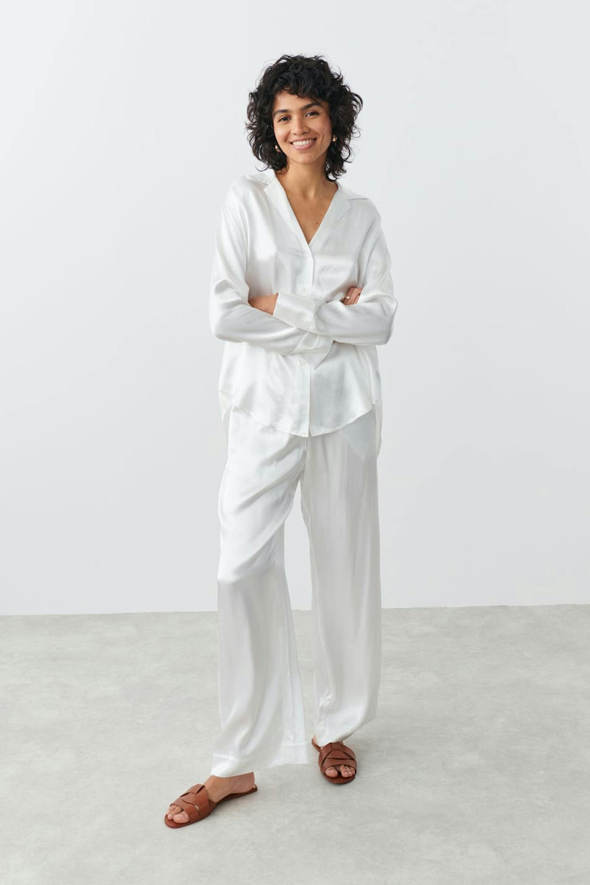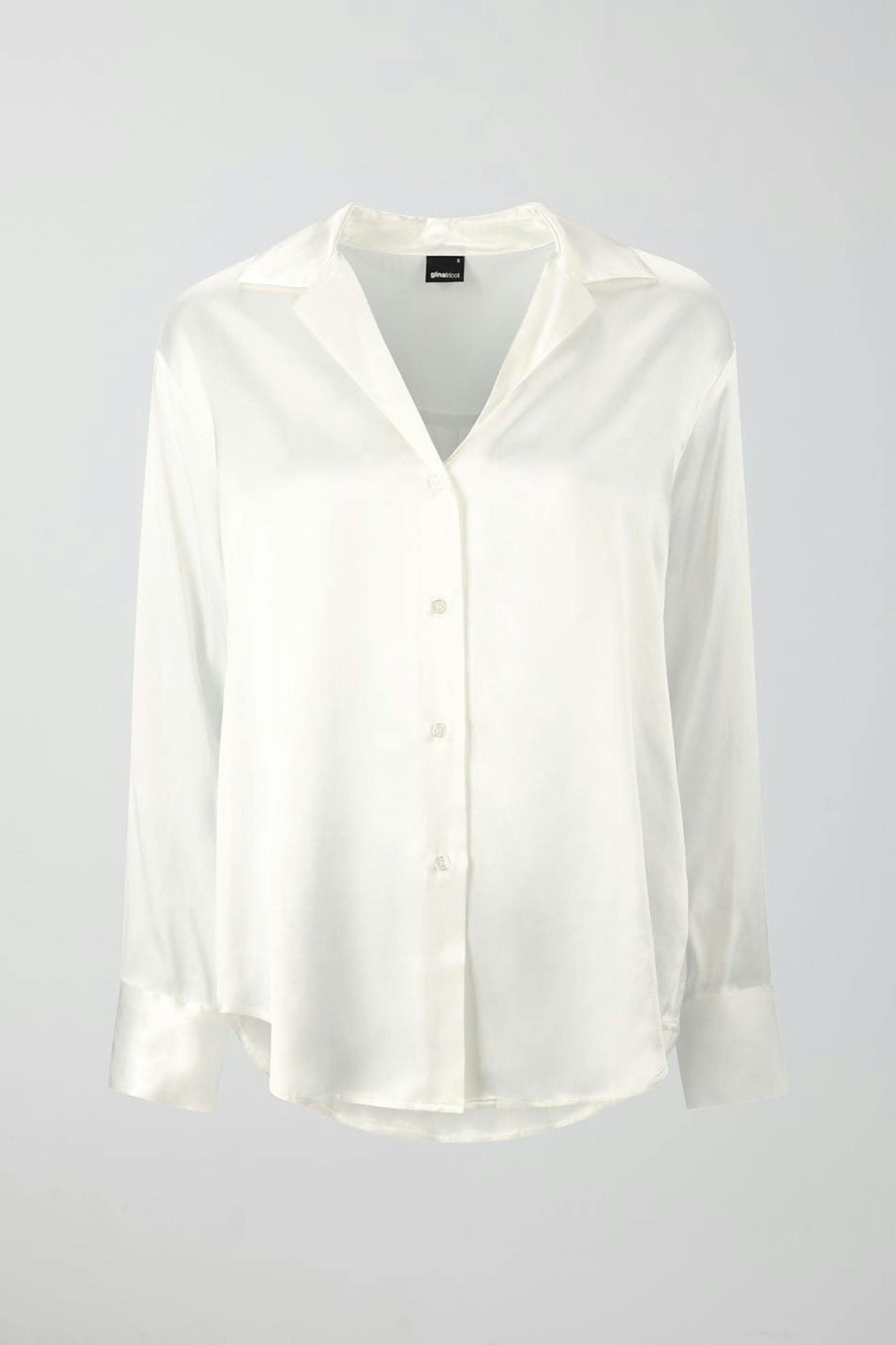 Satinhemd mit lockerer Passform. Das Hemd ist weiβ und hat Kragen mit Revers mit Kerbe. Es hat Knopfleiste vorne und langen Ärmel mit Knopf und Manschette.