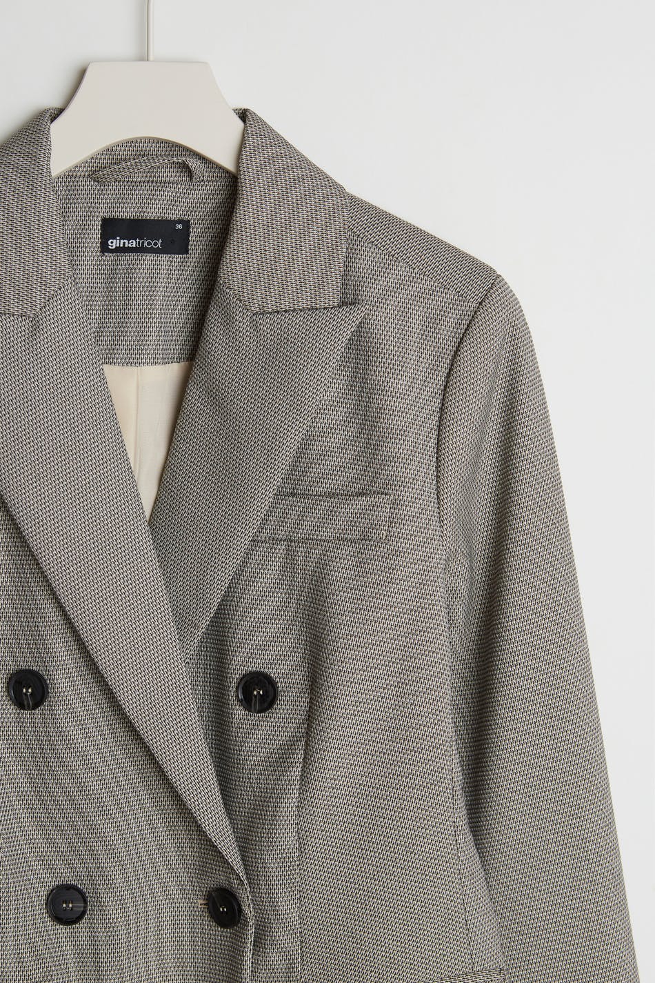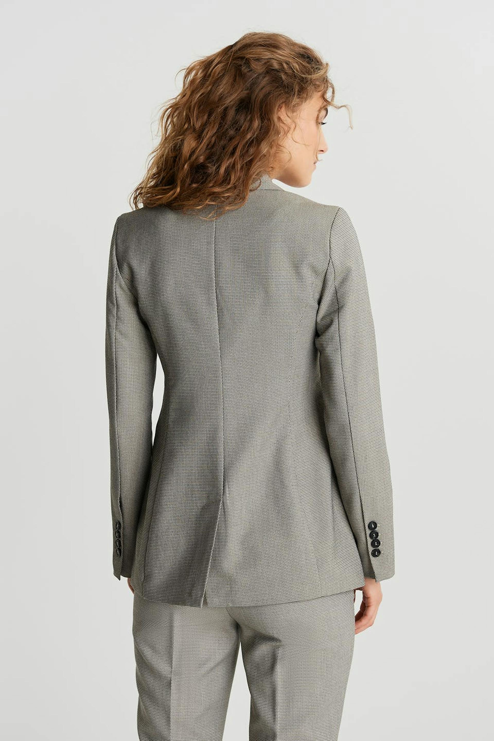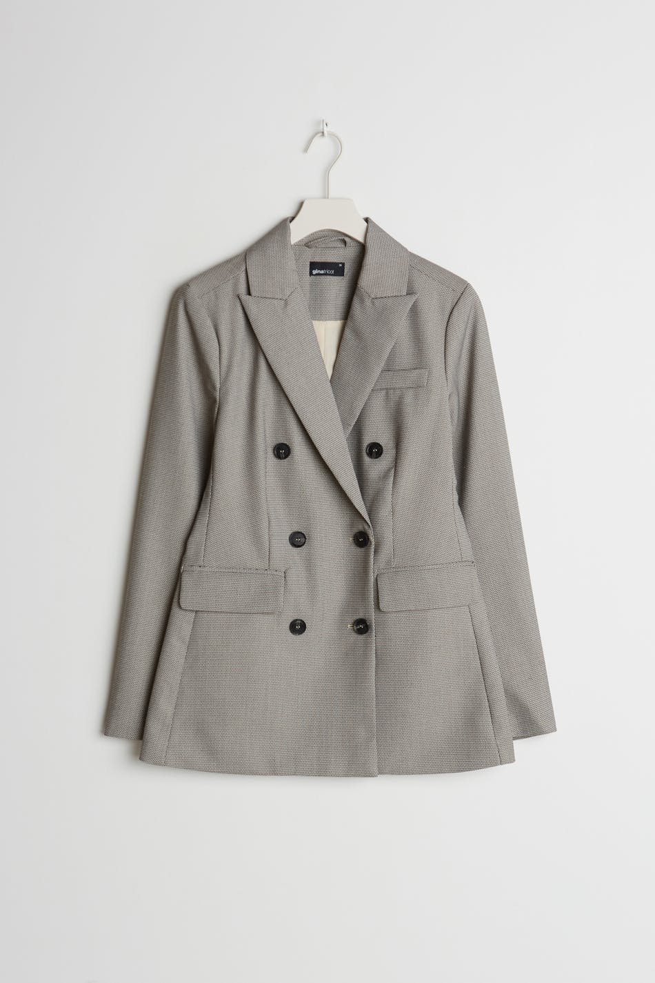 Zweireihig Sakko mit einer schmalen Passform. Das Sakko ist kariert und hat Schulterpolster. Es hat eingenäht Taschen mit Lid.