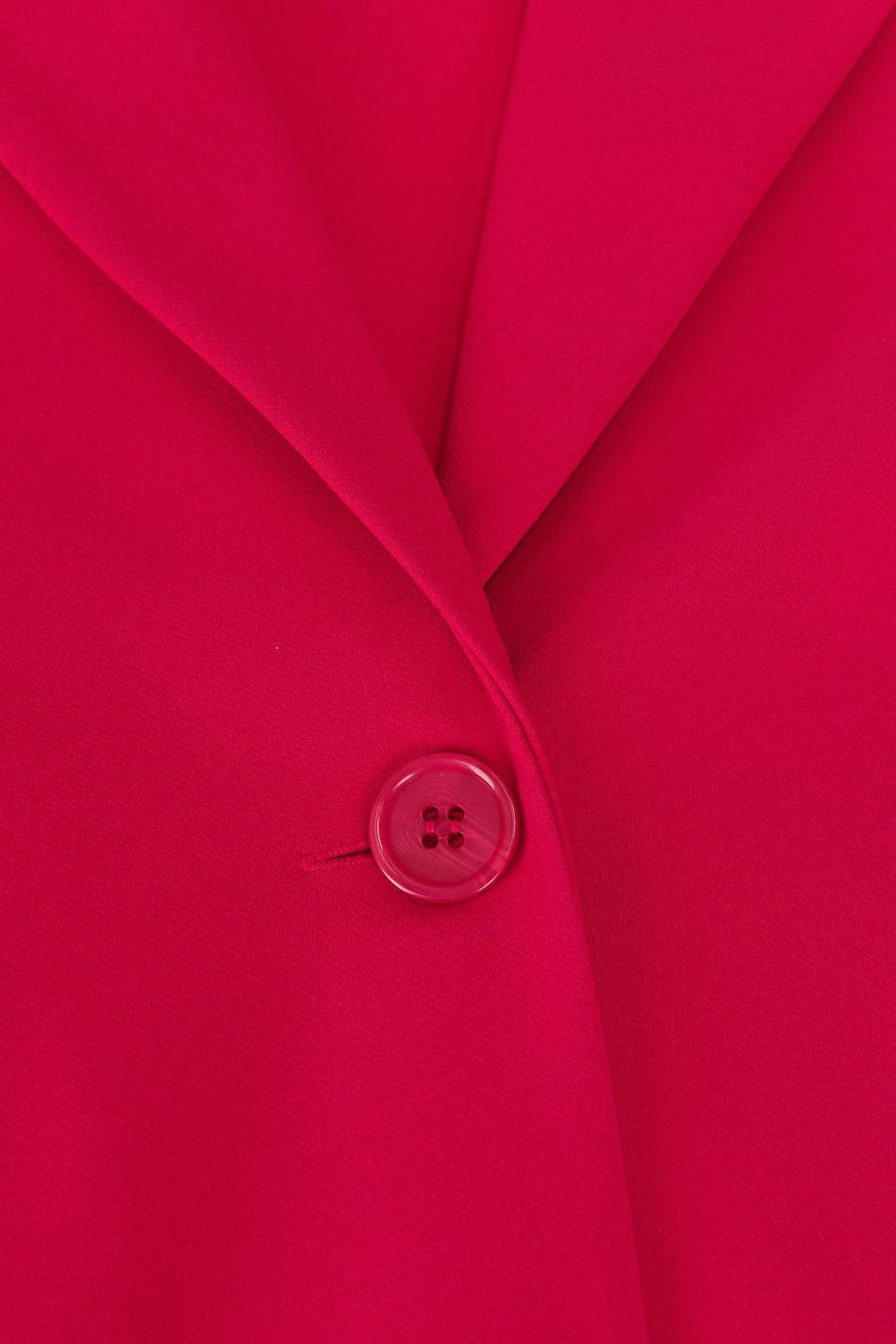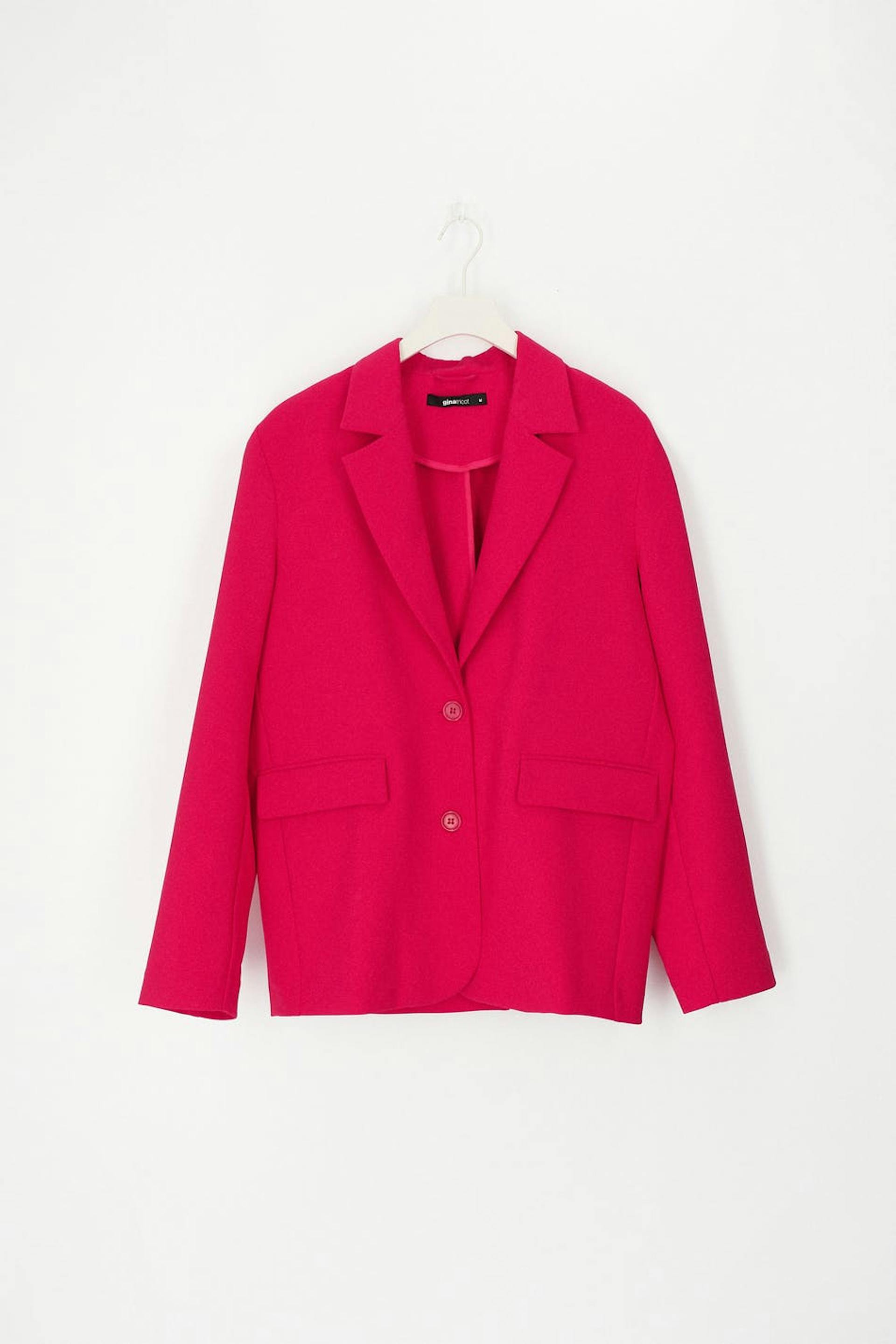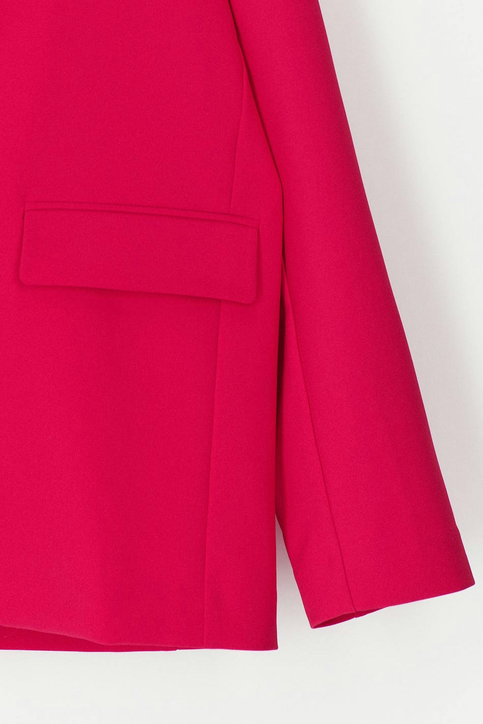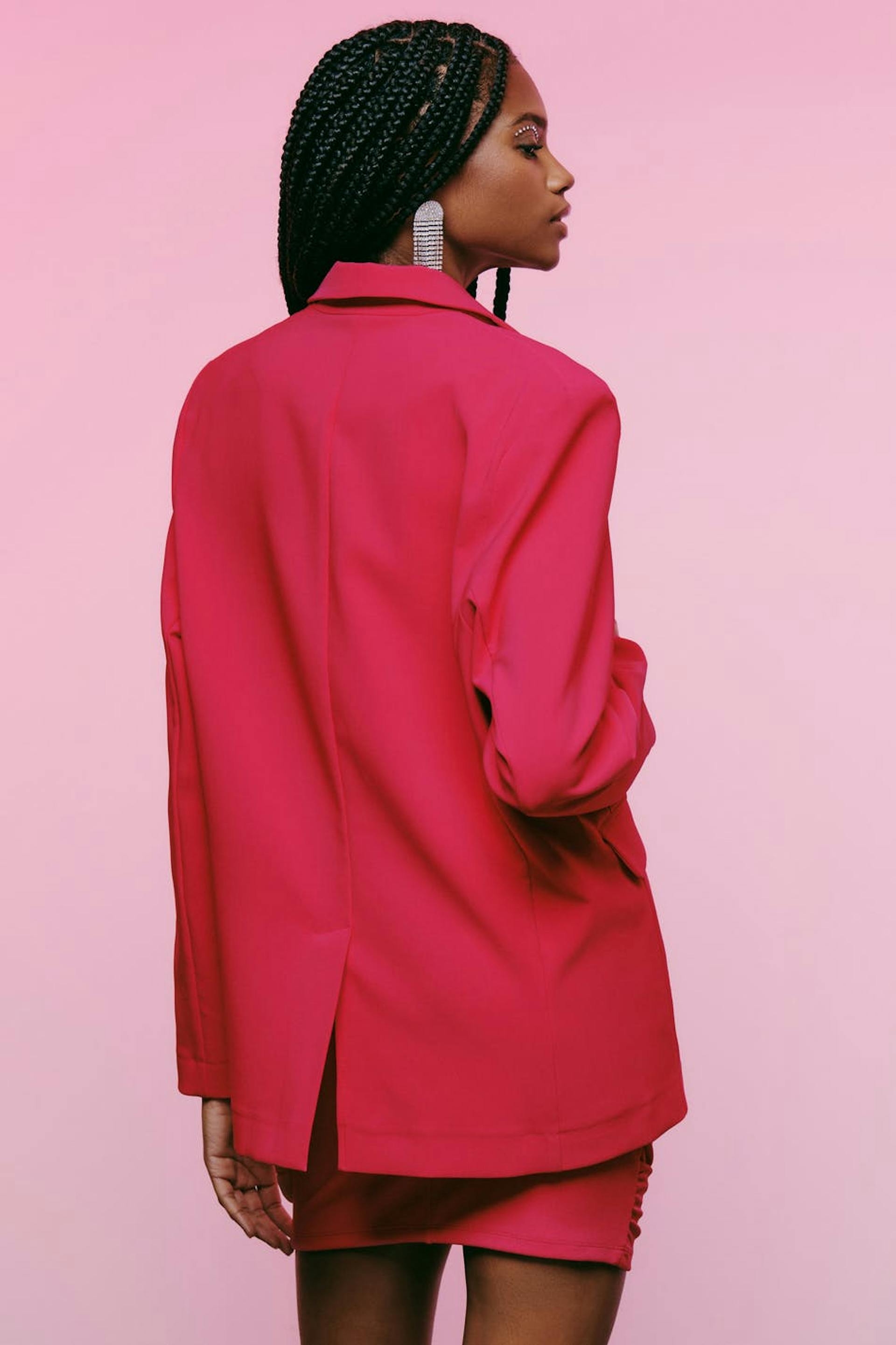 Oversize Blazer mit Schlitz auf der Rückseite. Die Blazer sind rosa und haben Knopfleiste vorne. Sie haben Kragen mit Revers und rahmengenähte Taschen in den Seiten.