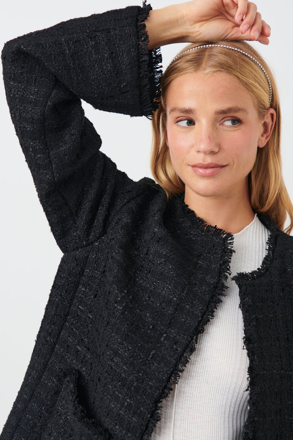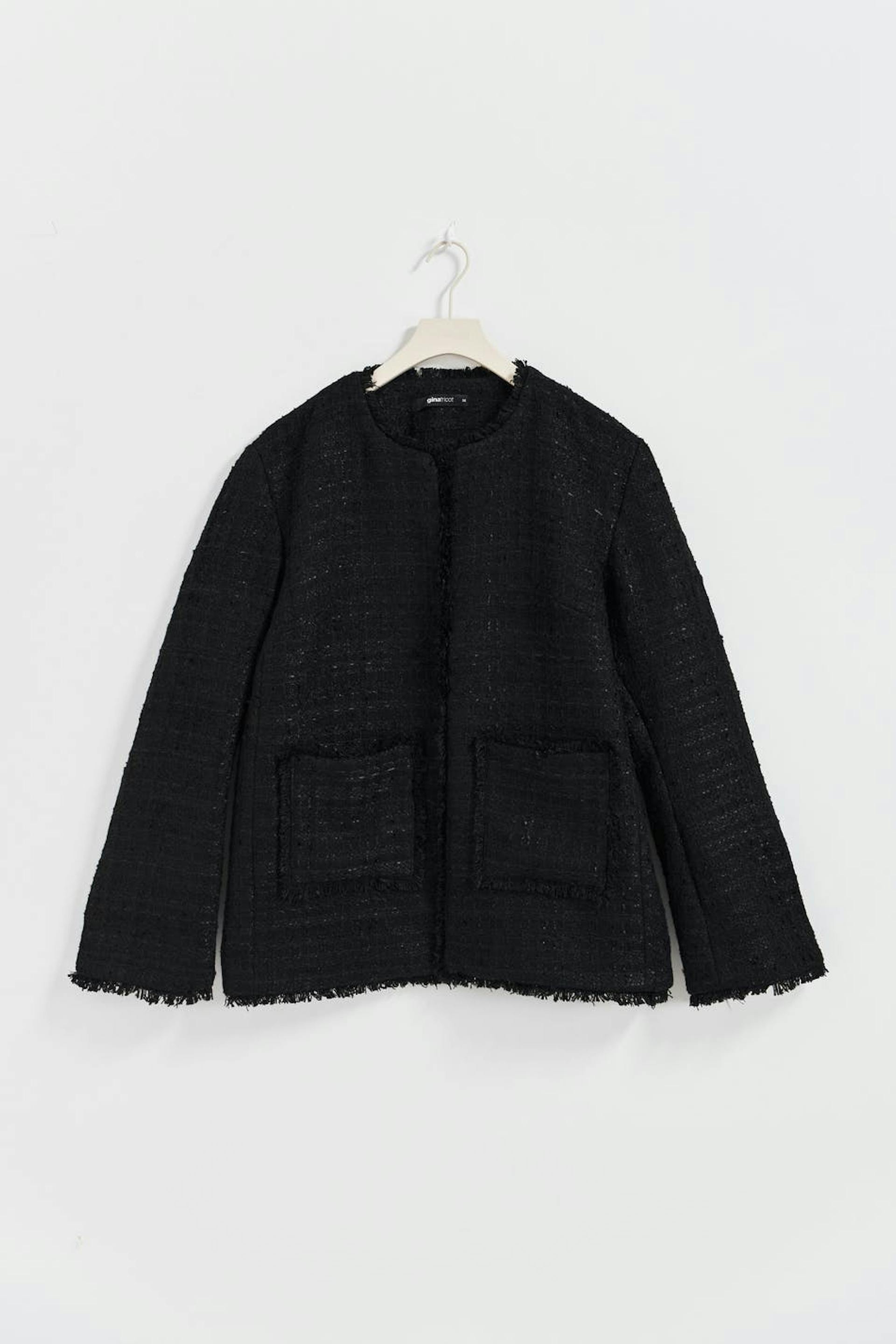 Tweedjacke mit Taschen vorne. Die Tweedjacke ist schwarz und hat rohe Kanten.