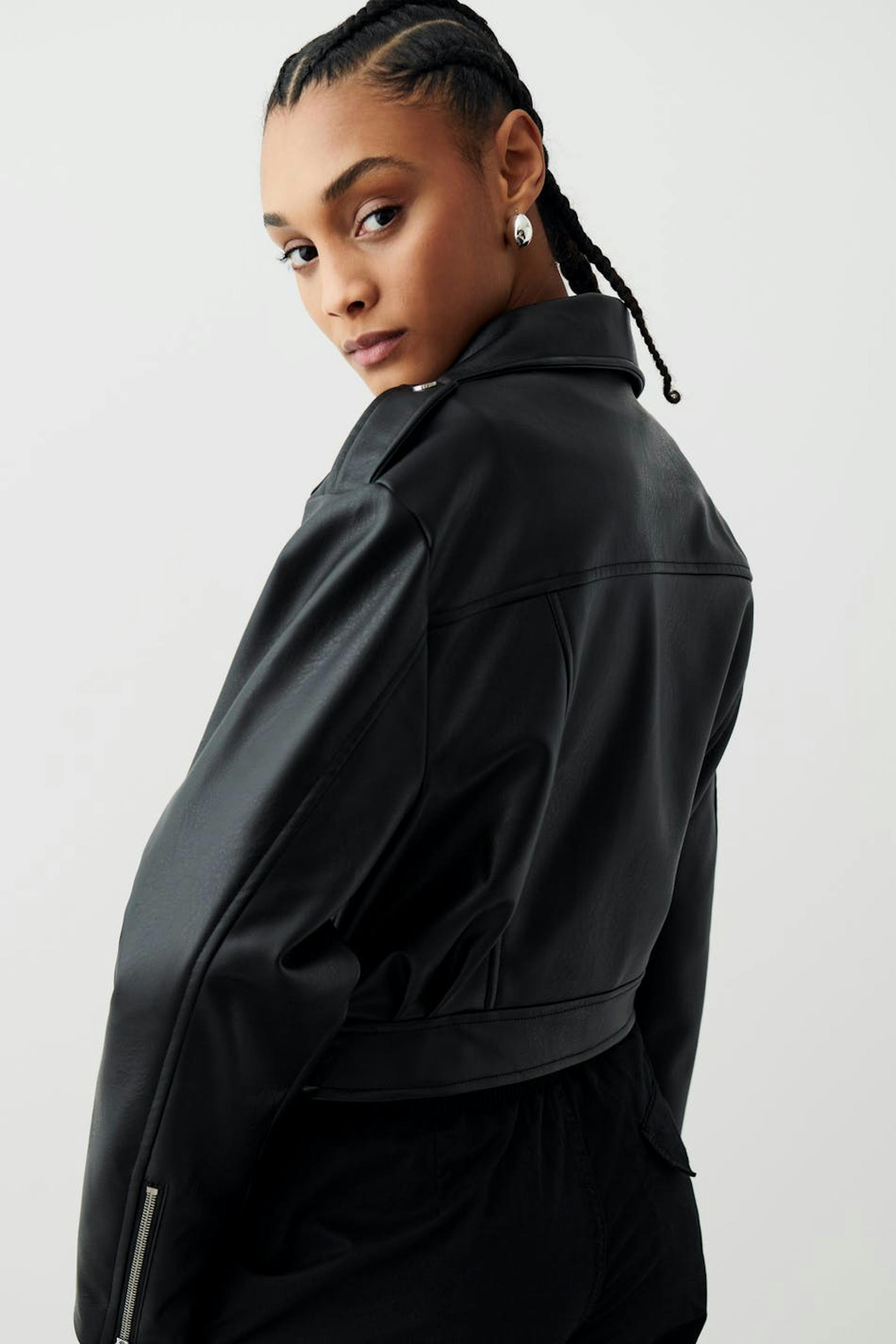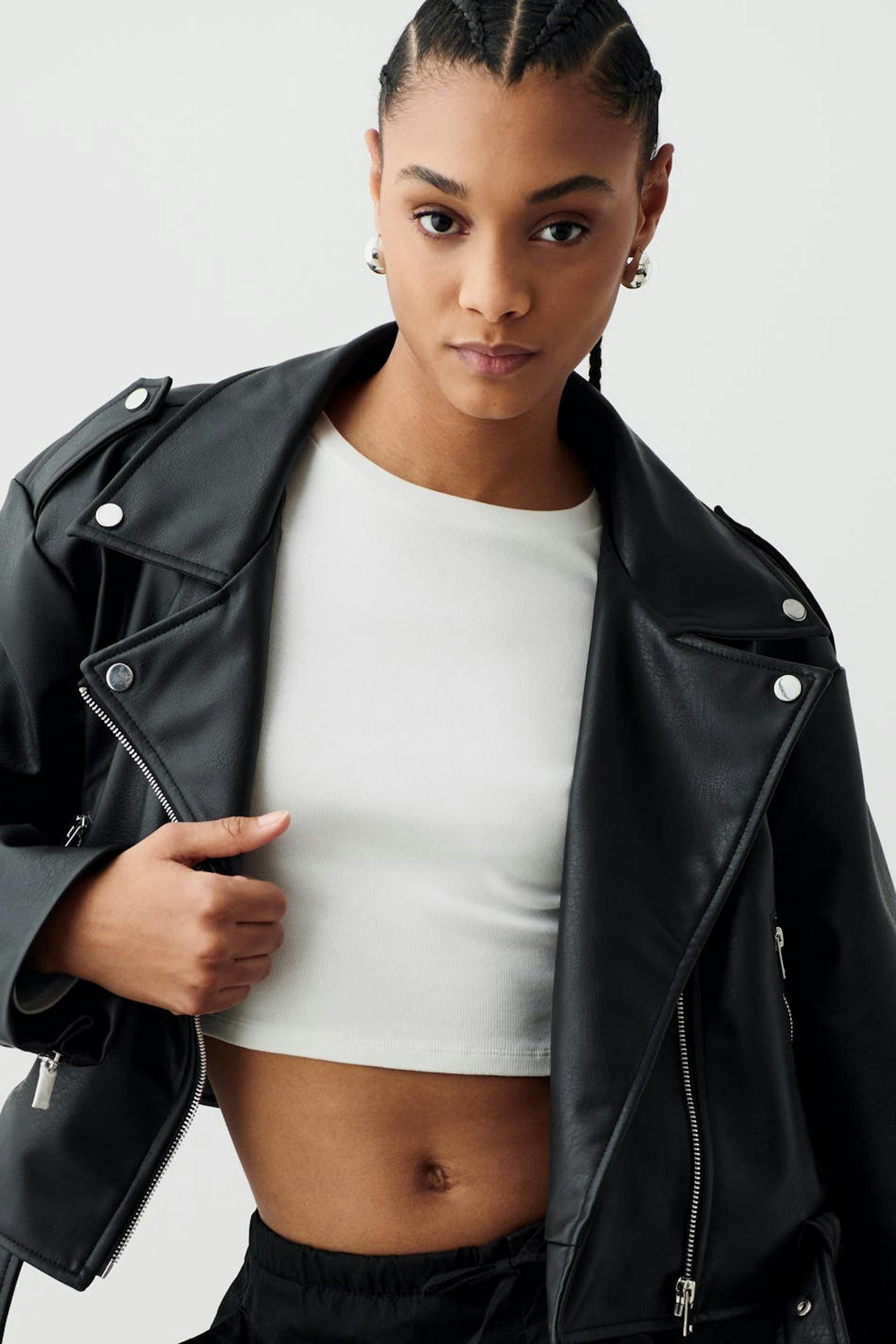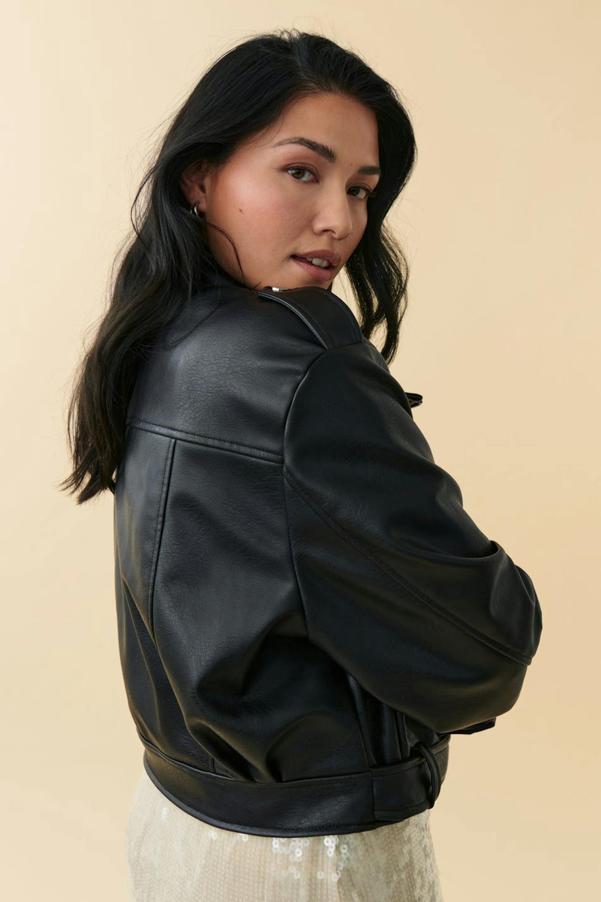 Oversize Lederjacke aus PU mit Reißverschluss vorne. Die Jacke ist schwarz und hat verstellbaren Gürtel mit Metallverschluss unten. Sie hat Kragen, Revers mit dekorativen Knöpfen, Schulterklappen, Seitentaschen mit Reißverschluss und Reißverschluss an den Ärmelenden.