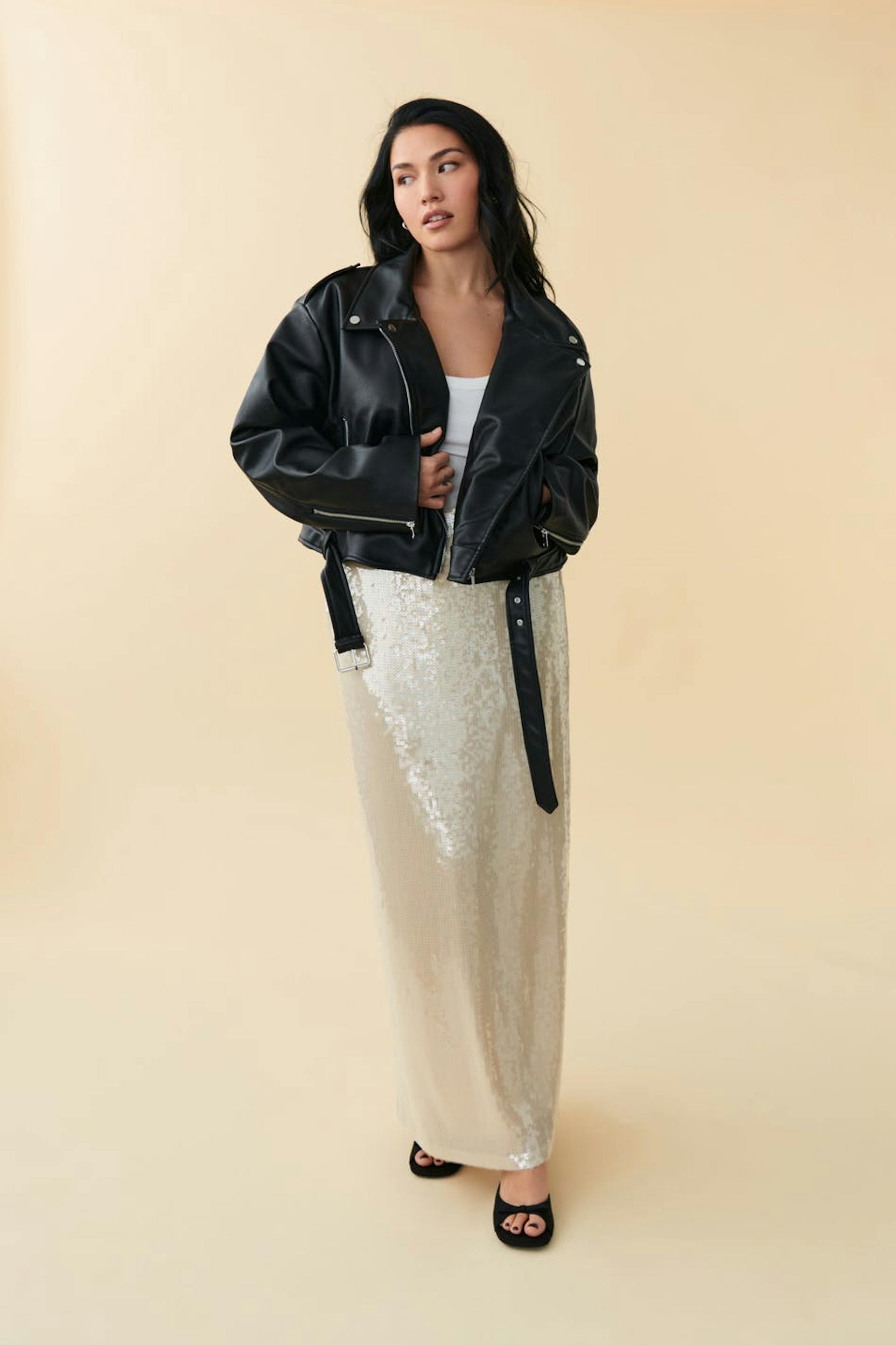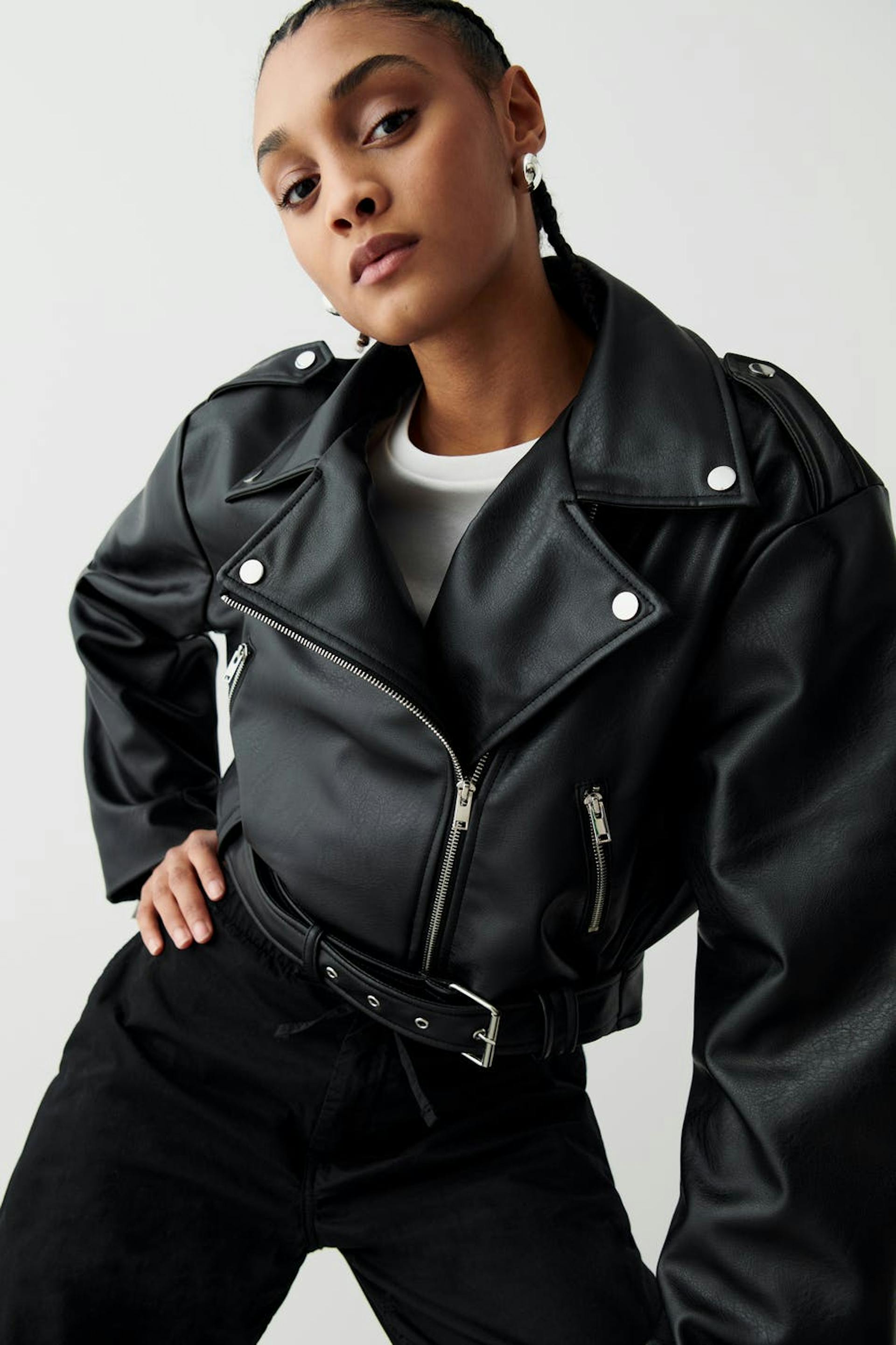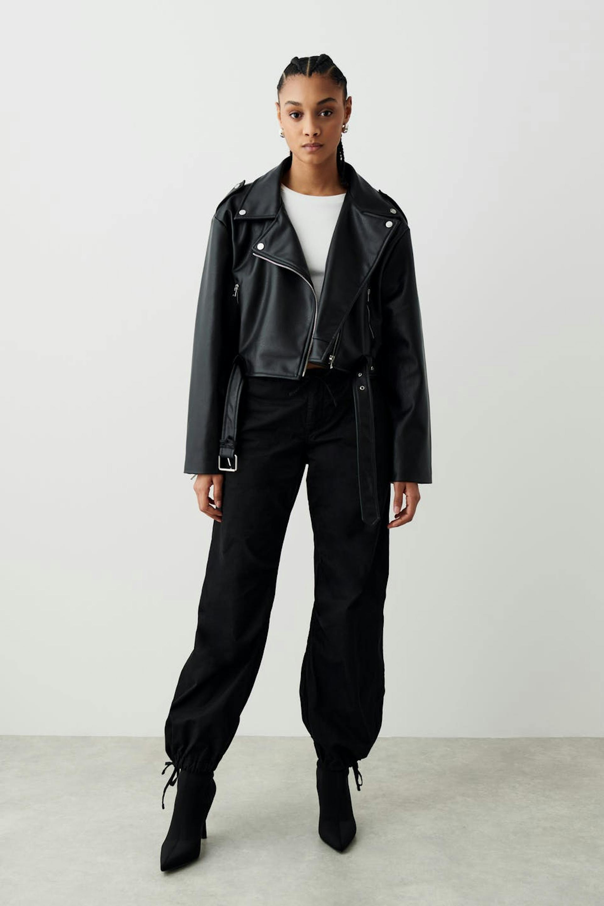 Oversize Lederjacke aus PU mit Reißverschluss vorne. Die Jacke ist schwarz und hat verstellbaren Gürtel mit Metallverschluss unten. Sie hat Kragen, Revers mit dekorativen Knöpfen, Schulterklappen, Seitentaschen mit Reißverschluss und Reißverschluss an den Ärmelenden.