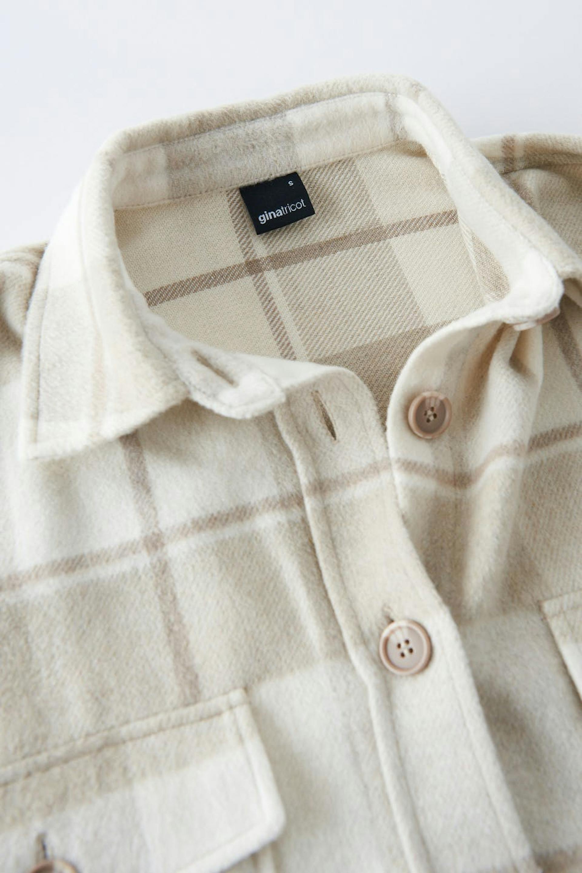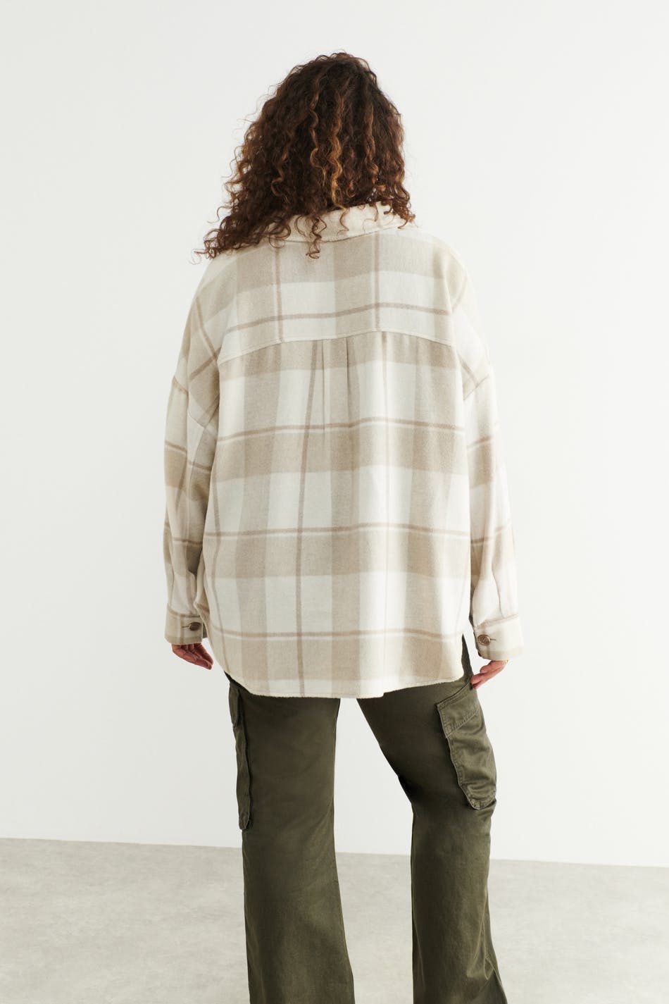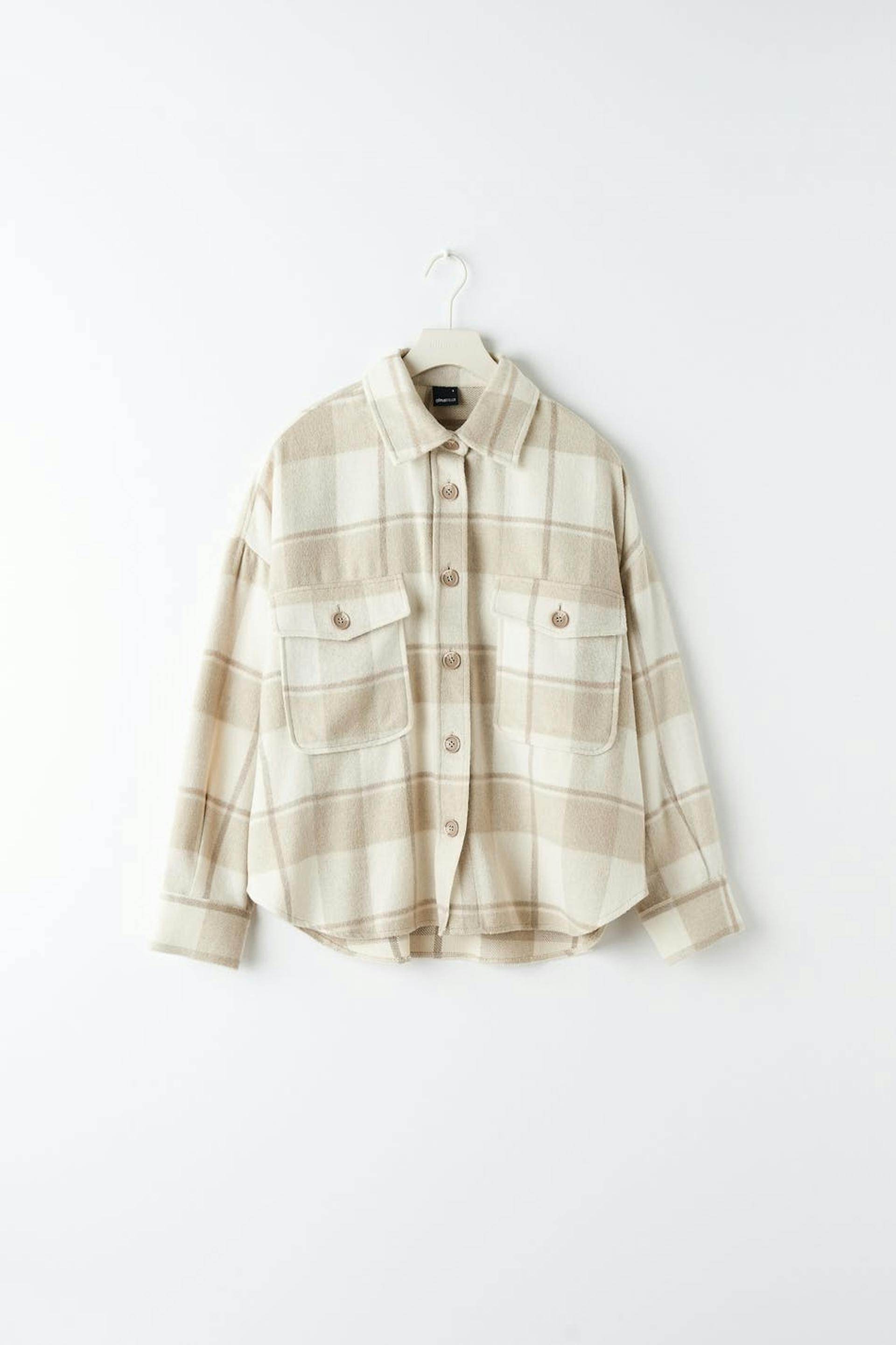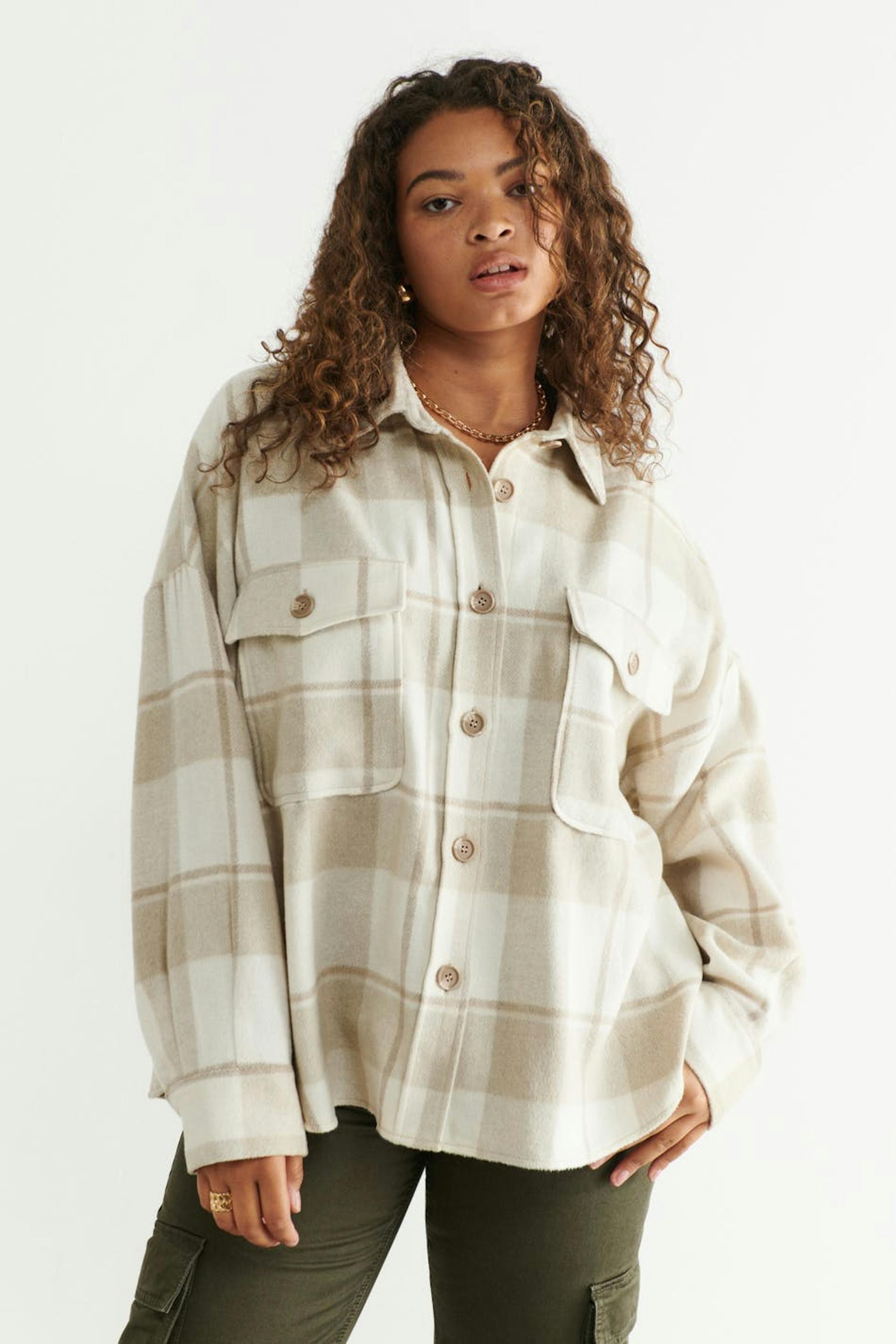 Kariert Hemdjacke aus Flanell mit einer Oversize-Passform. Das Shacket ist beige und hat Brusttaschen. Es hat Knopfleiste vorne, Kragen und Passe mit Falte auf der Rückseite.