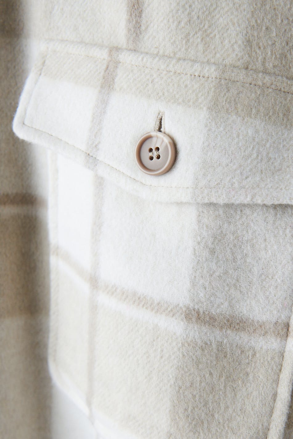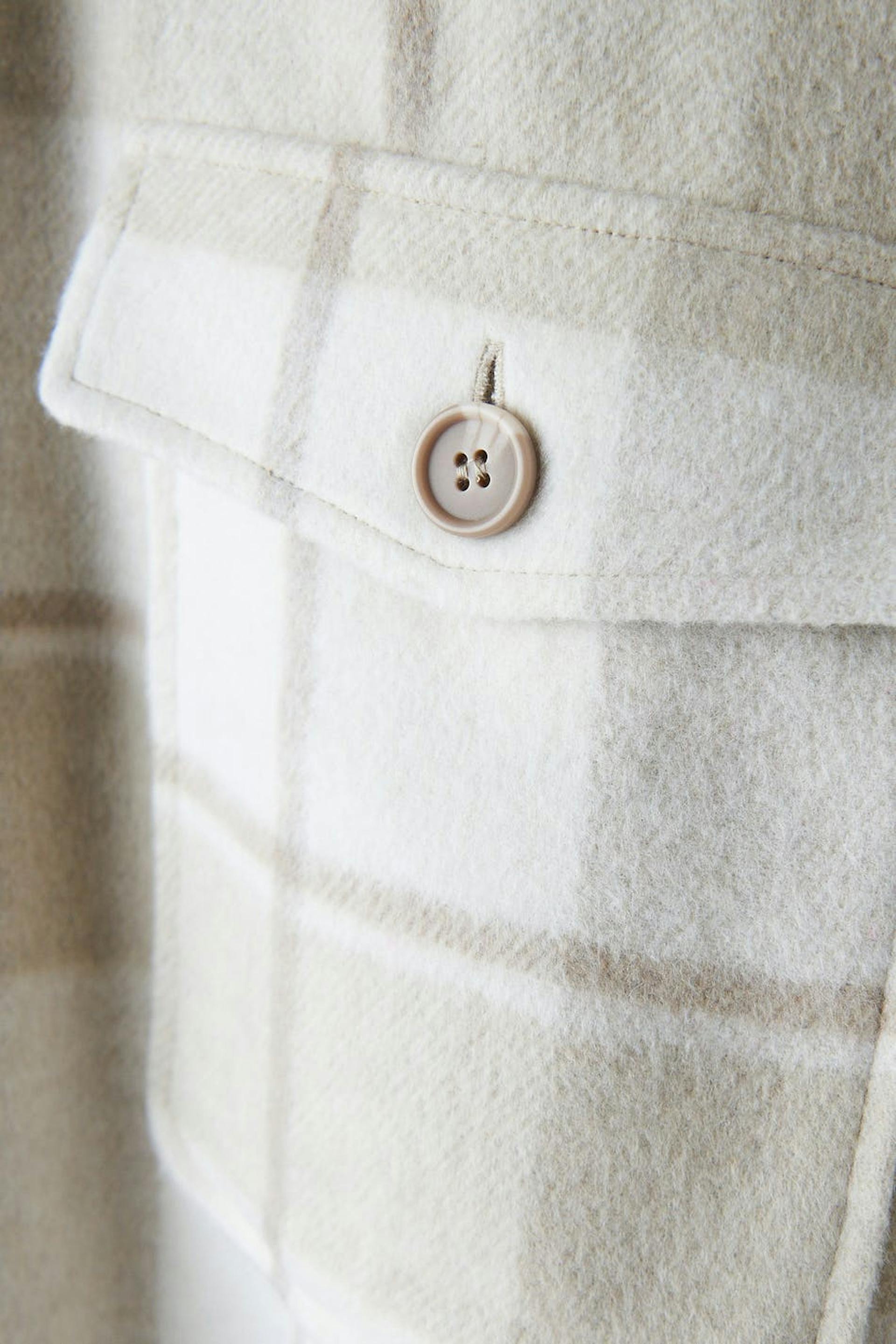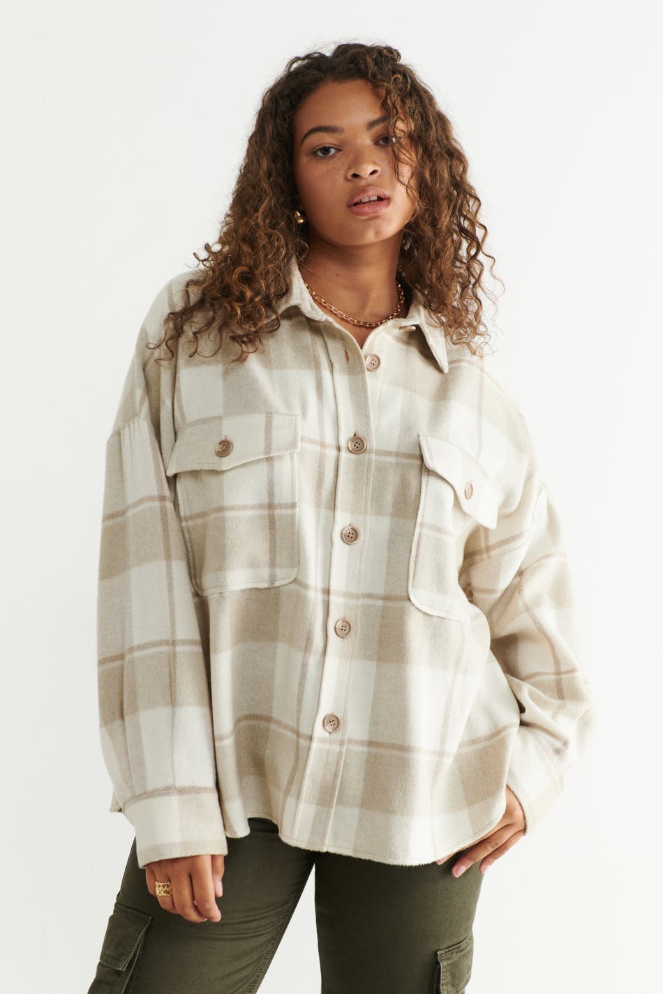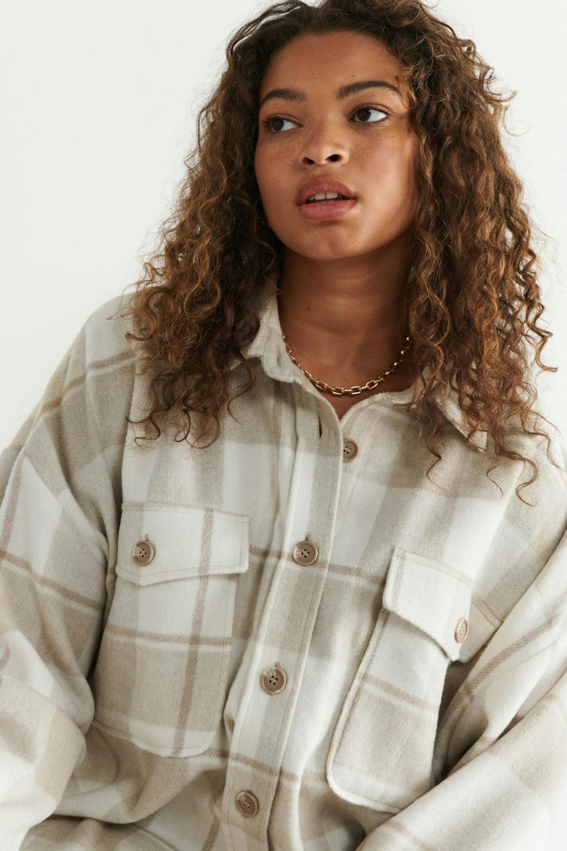 Kariert Hemdjacke aus Flanell mit einer Oversize-Passform. Das Shacket ist beige und hat Brusttaschen. Es hat Knopfleiste vorne, Kragen und Passe mit Falte auf der Rückseite.