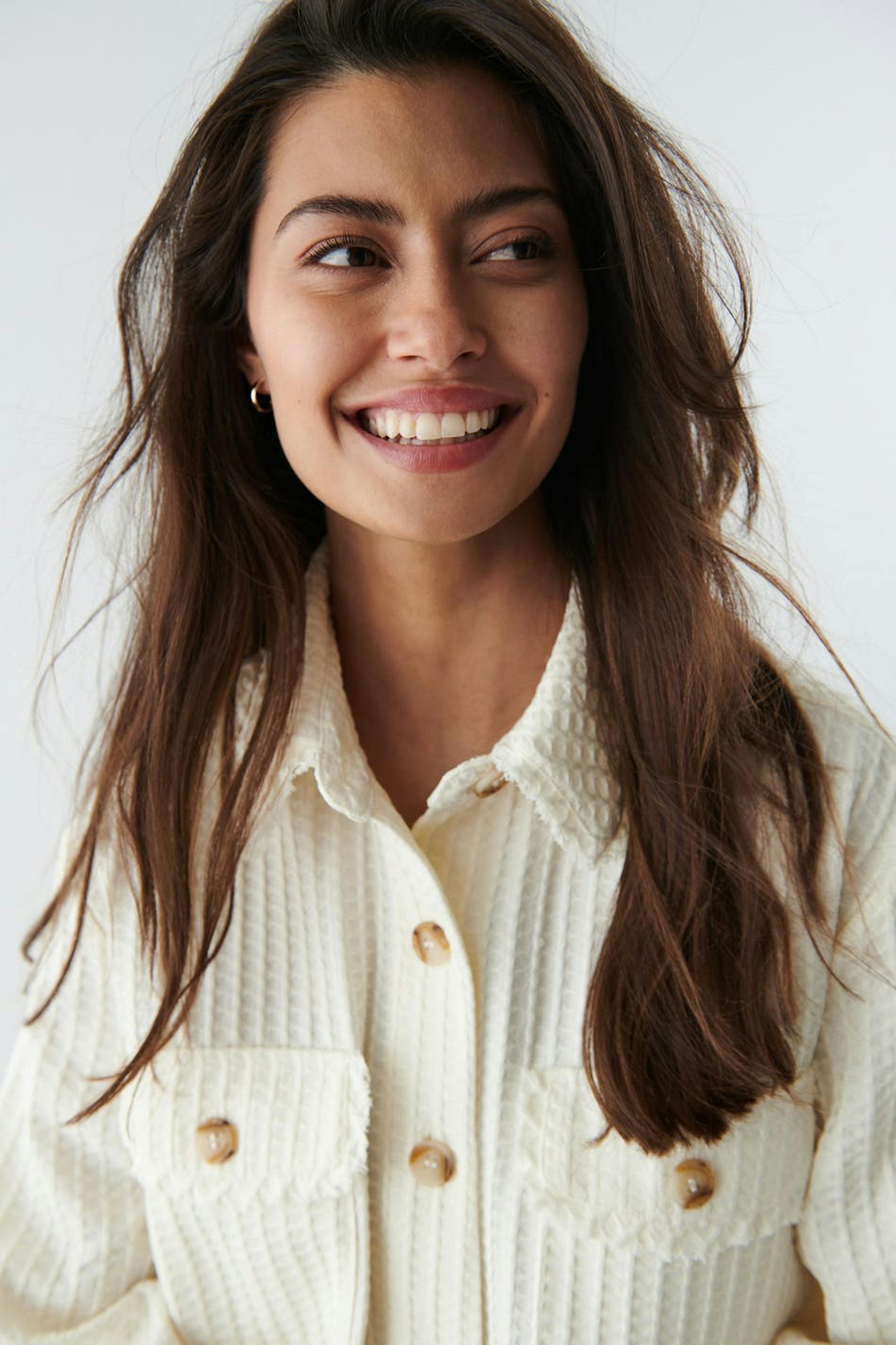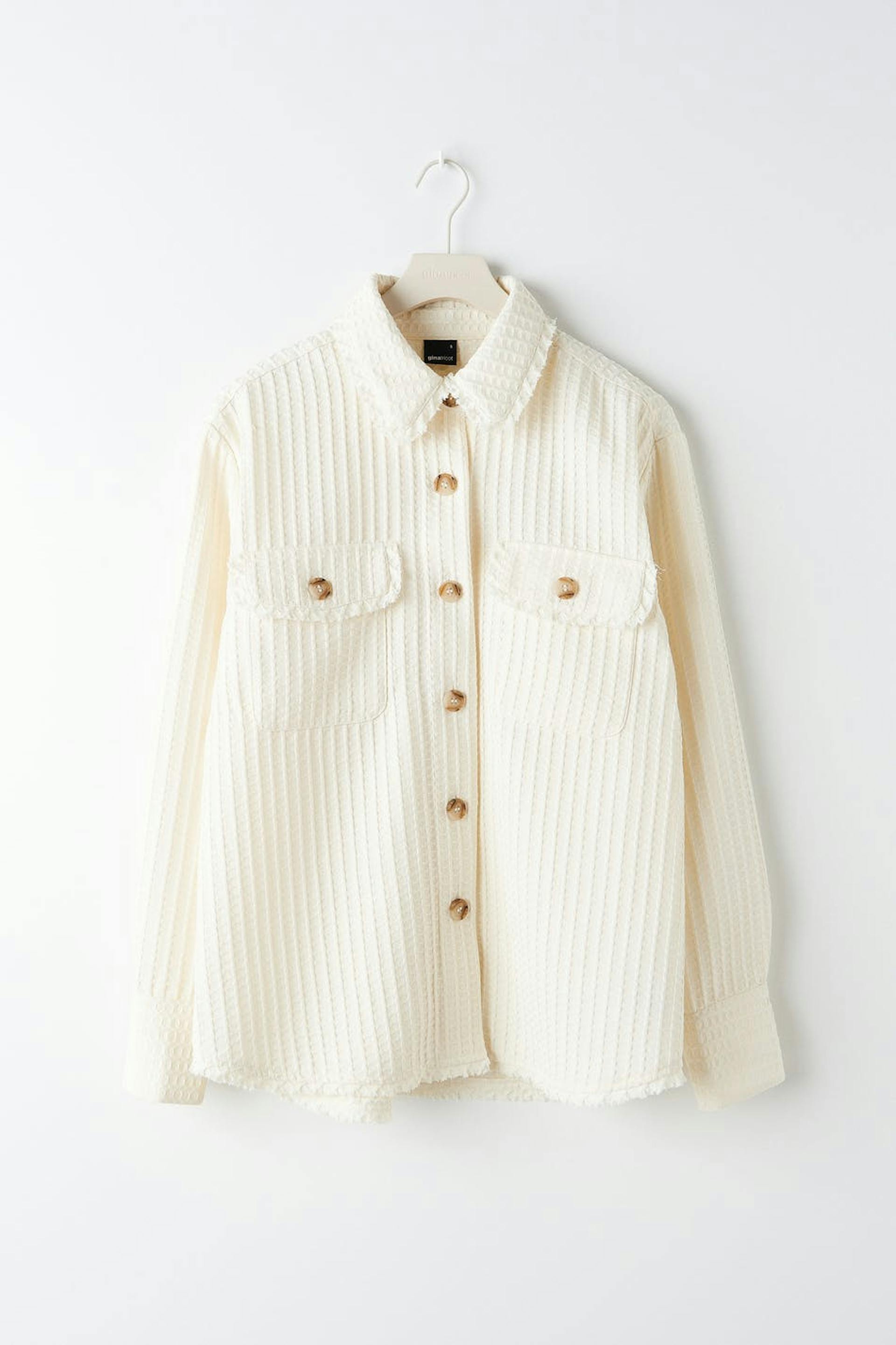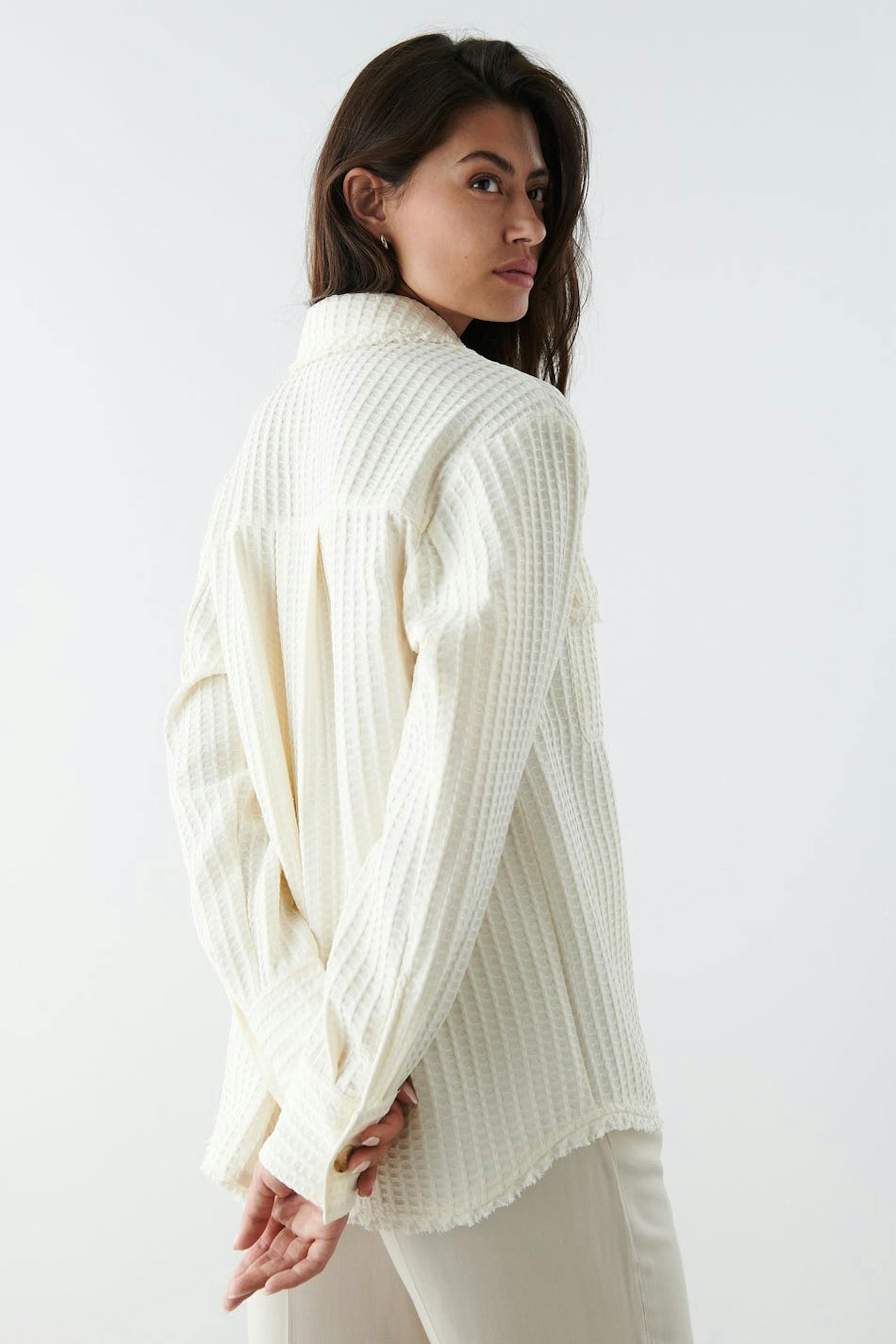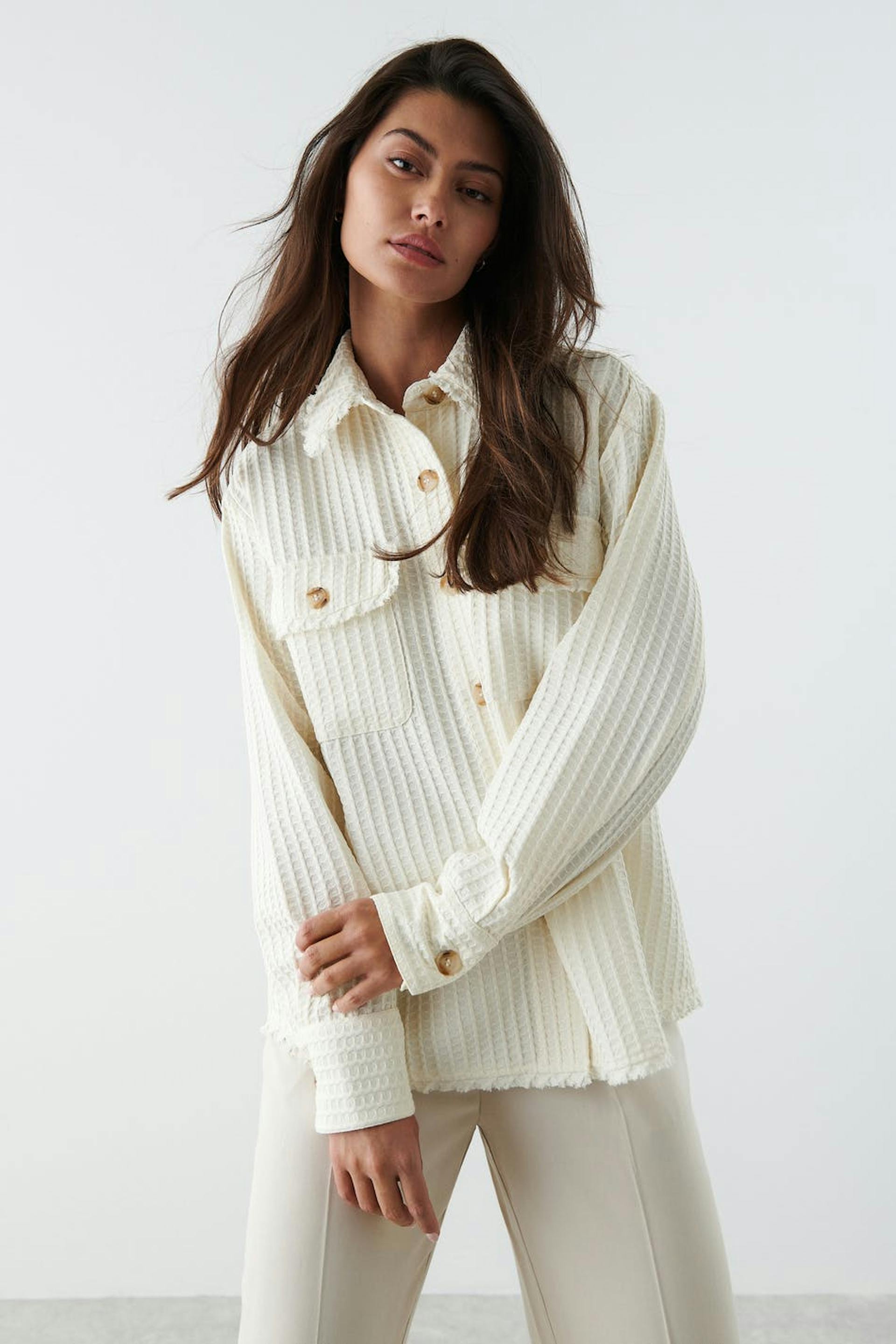 Hemdjacke mit einem Waffelmuster und weit-geschnittenen Style. Das Shacket ist weiβ und hat Brusttaschen. Es hat Seitentaschen und rohe Kanten.