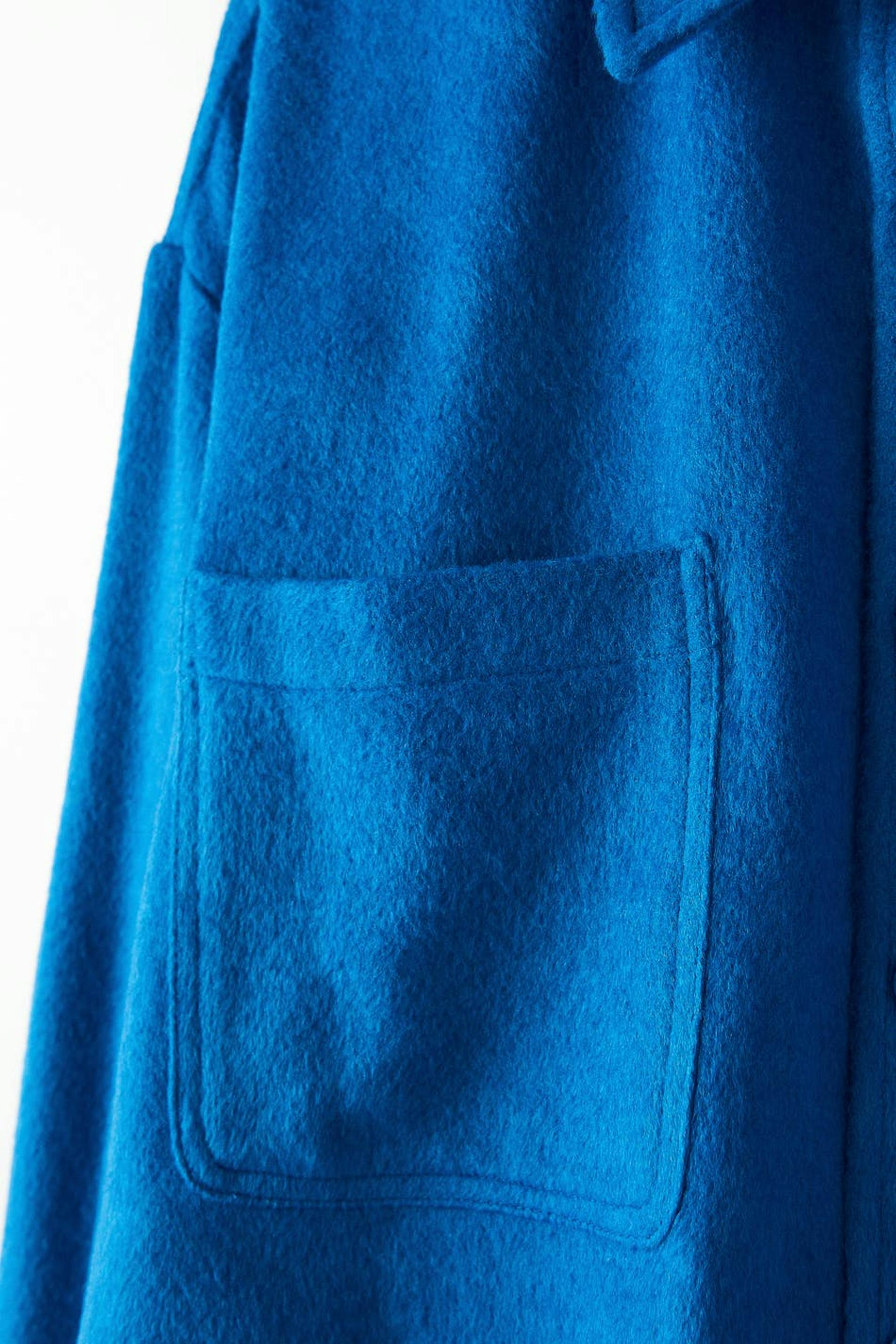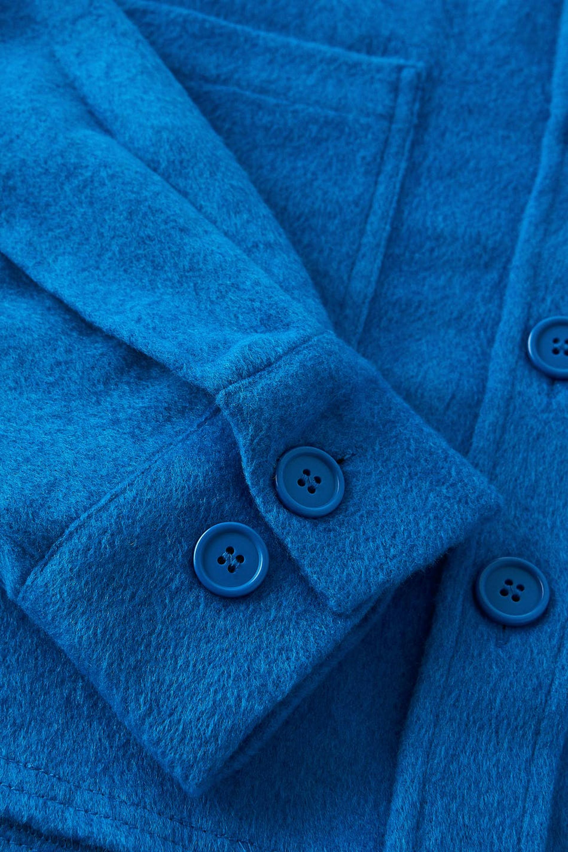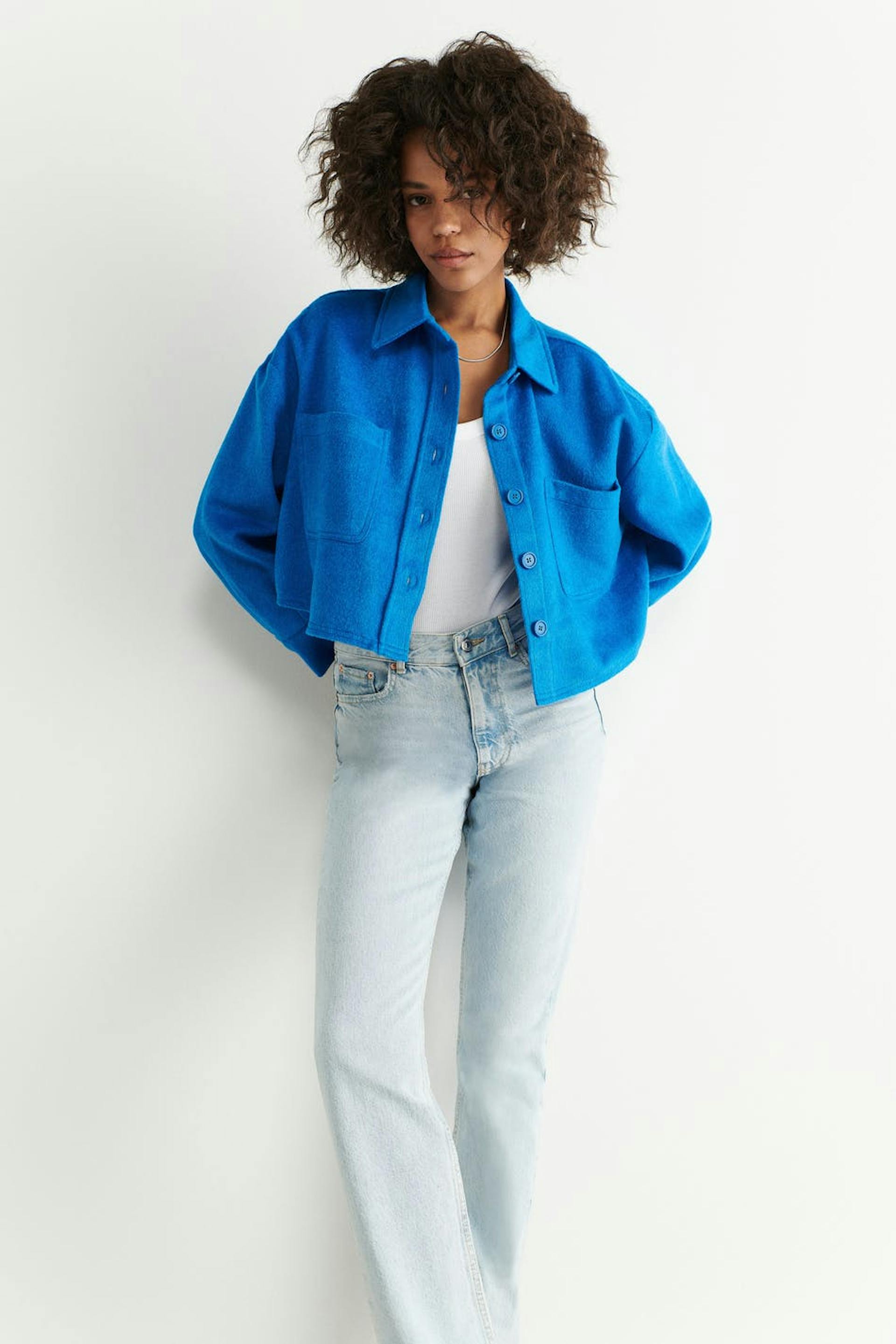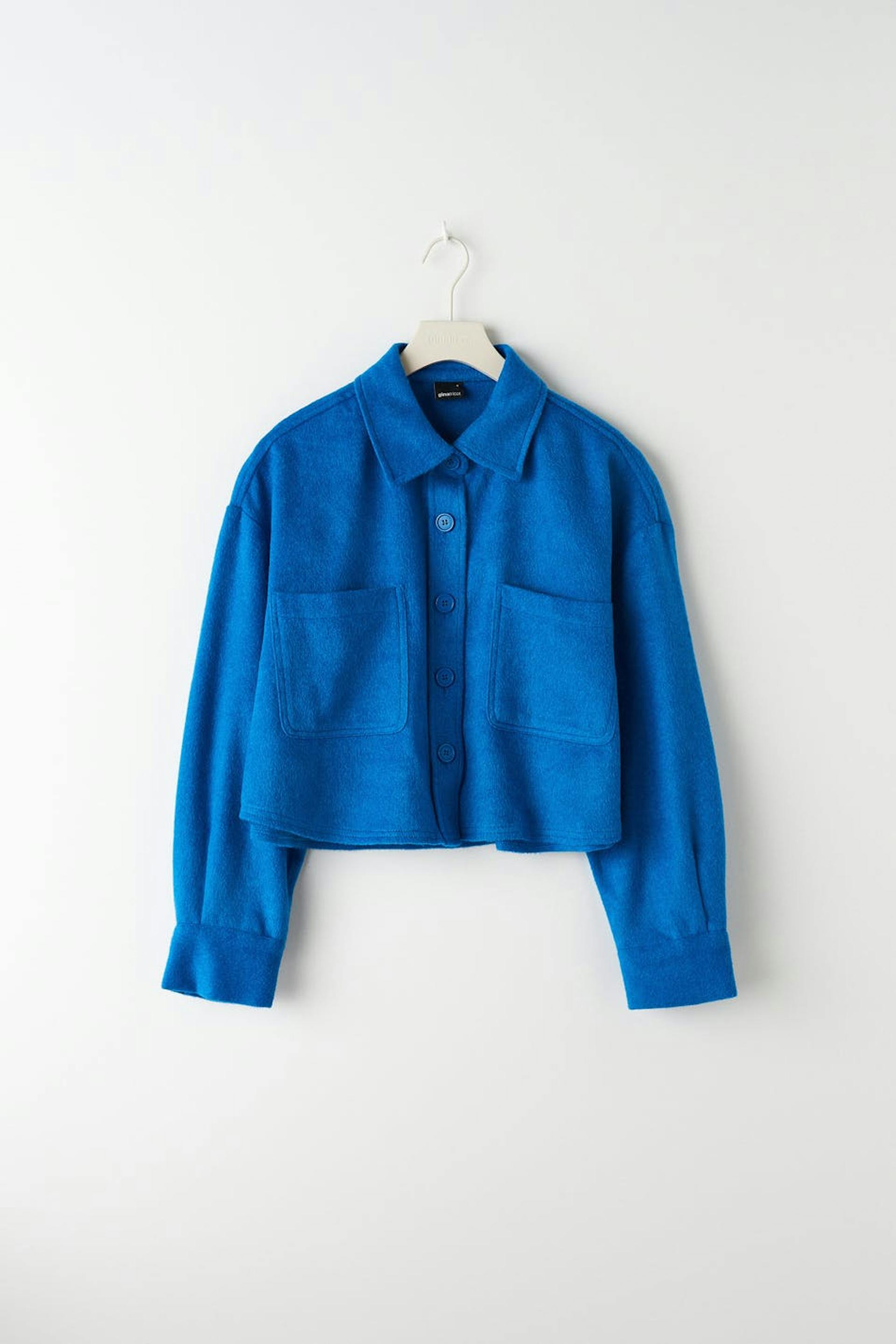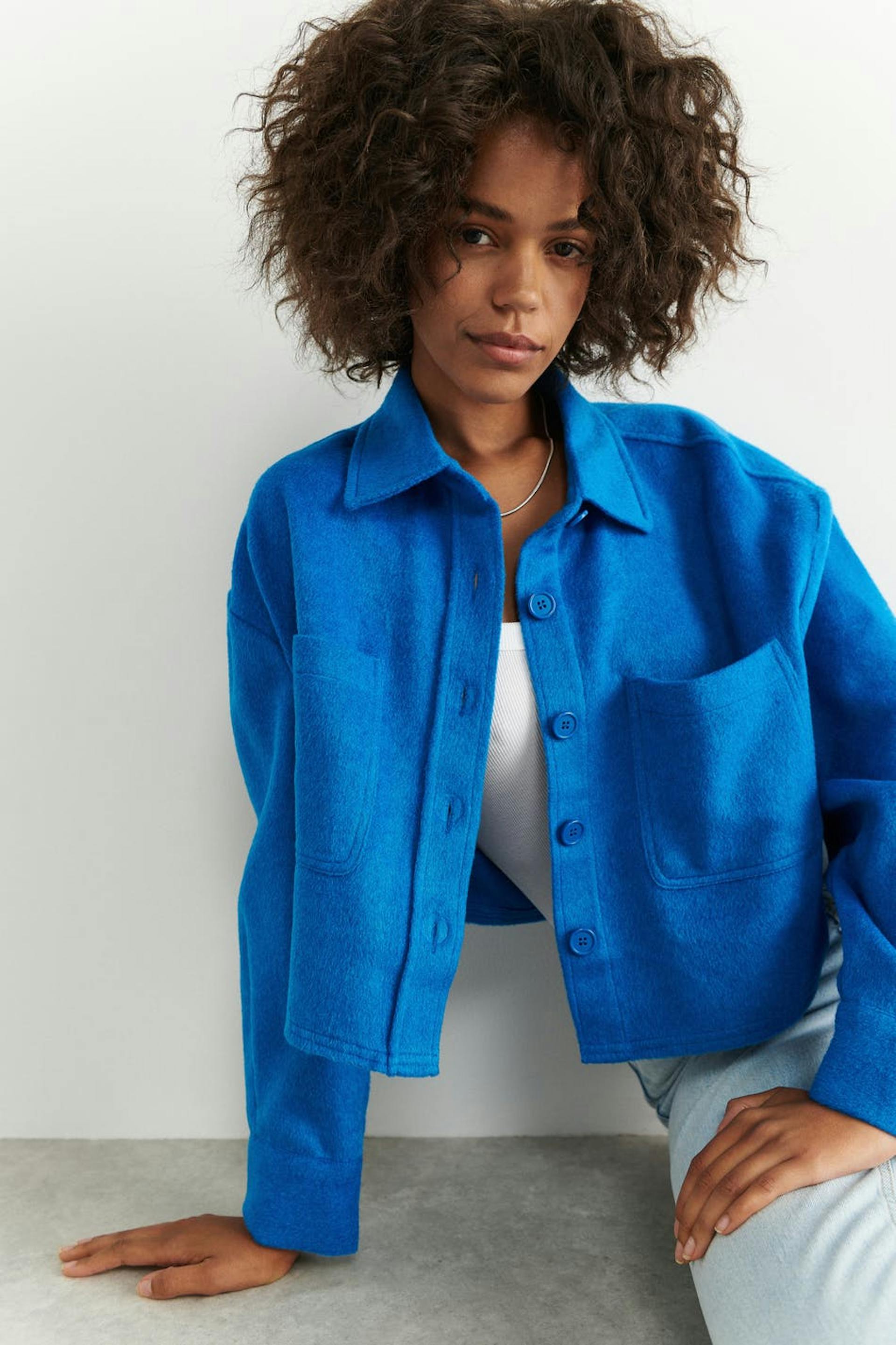 Kurze Hemdjacke aus Flanell mit einer Oversize-Passform. Das Shacket ist blau und hat Knopfleiste vorne. Es hat Kragen, Brusttaschen und Passe mit Falten hinten.