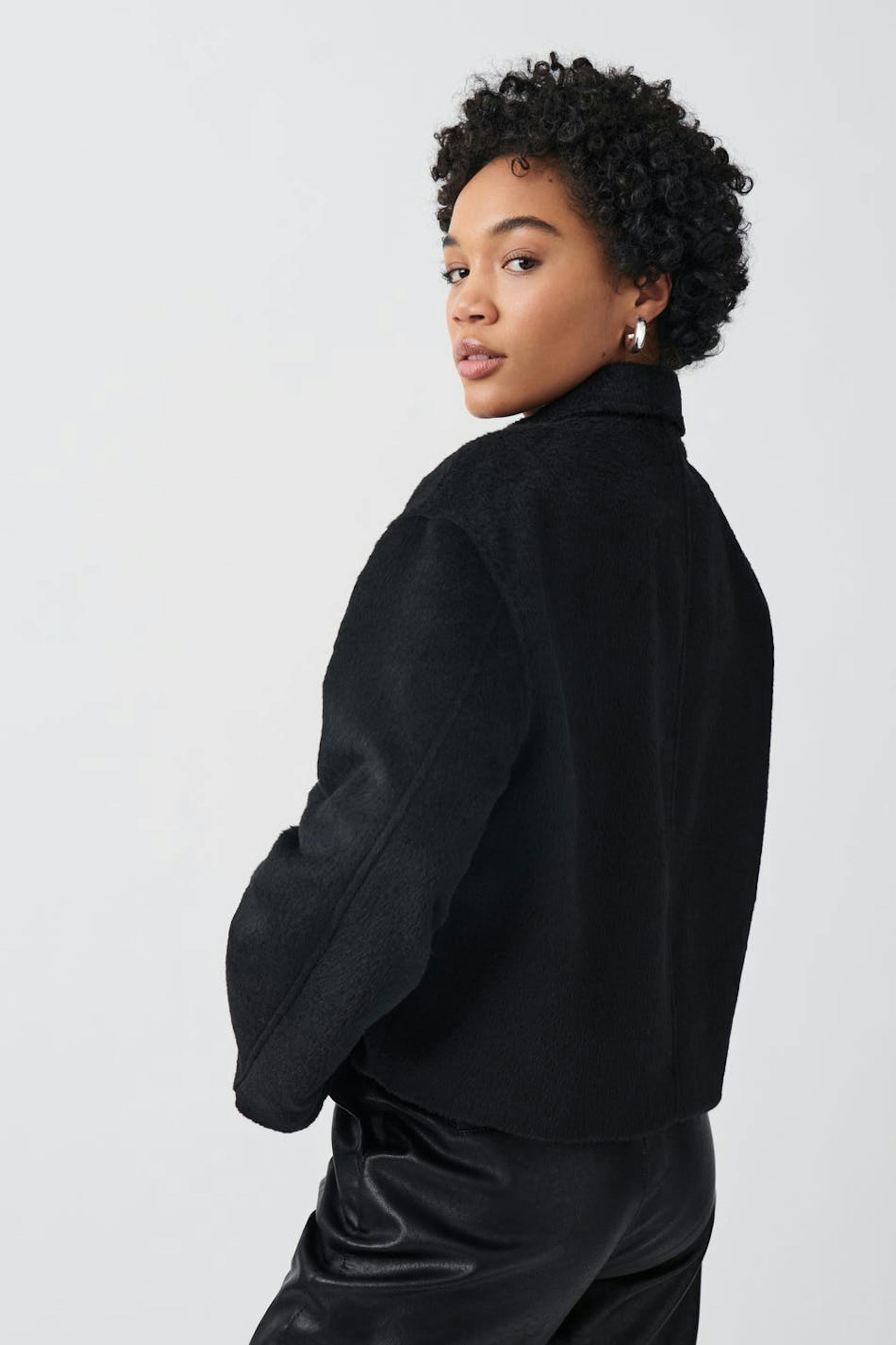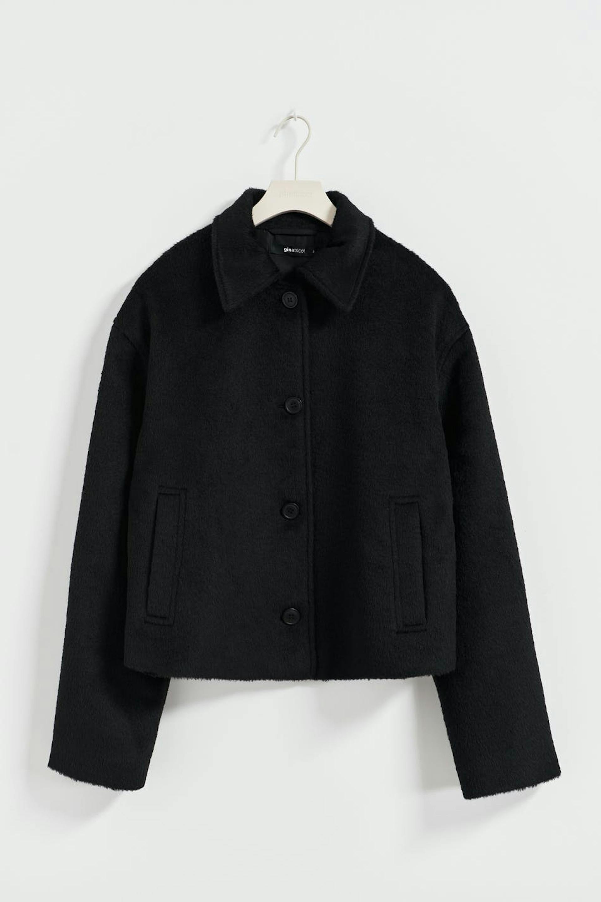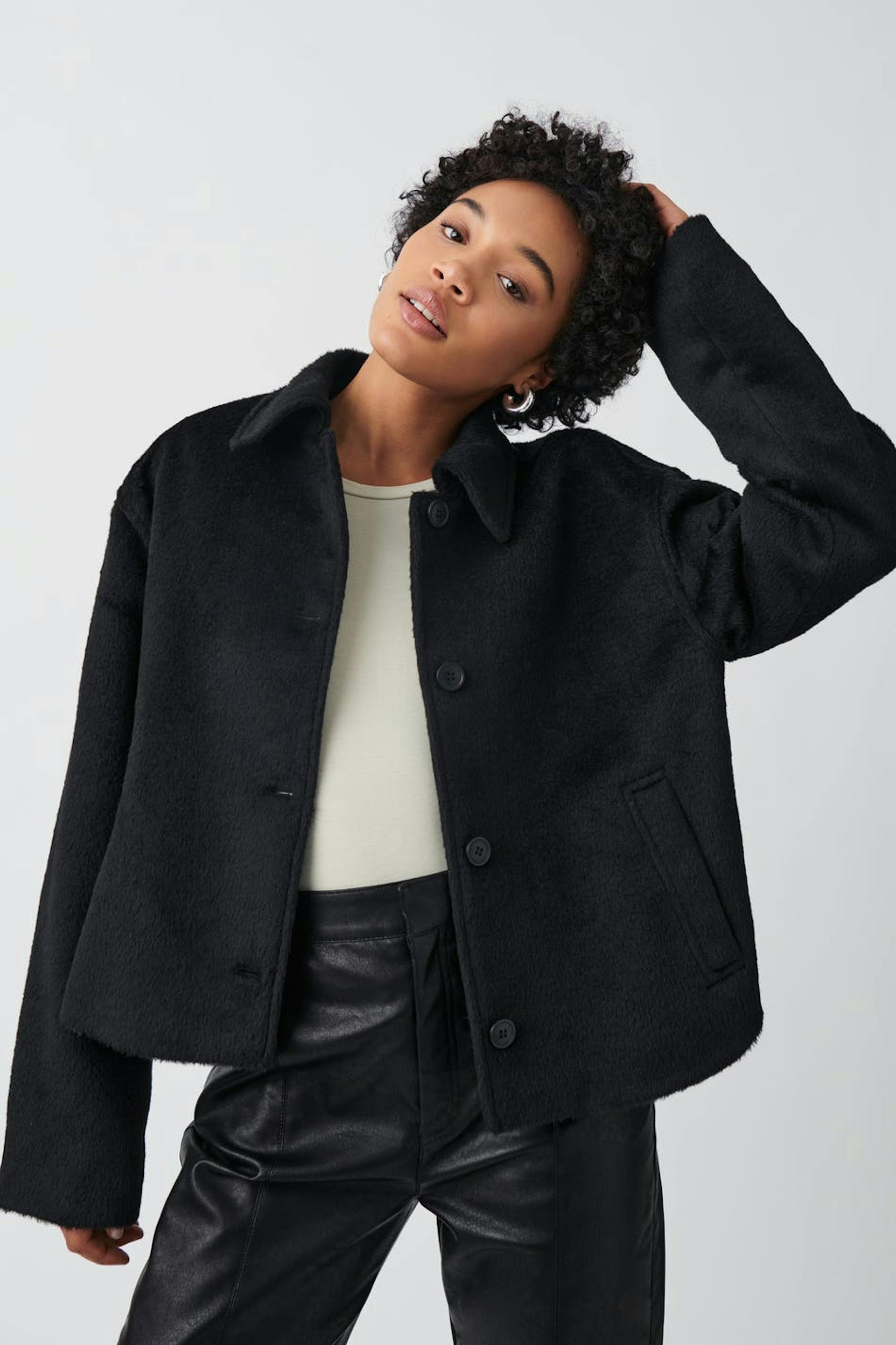 Kurze Jacke mit boxy Passform. Die Jacke ist schwarz und hat Knöpfung vorne. Sie hat gewebte Qualität, Kragen und Taschen in den Seiten.