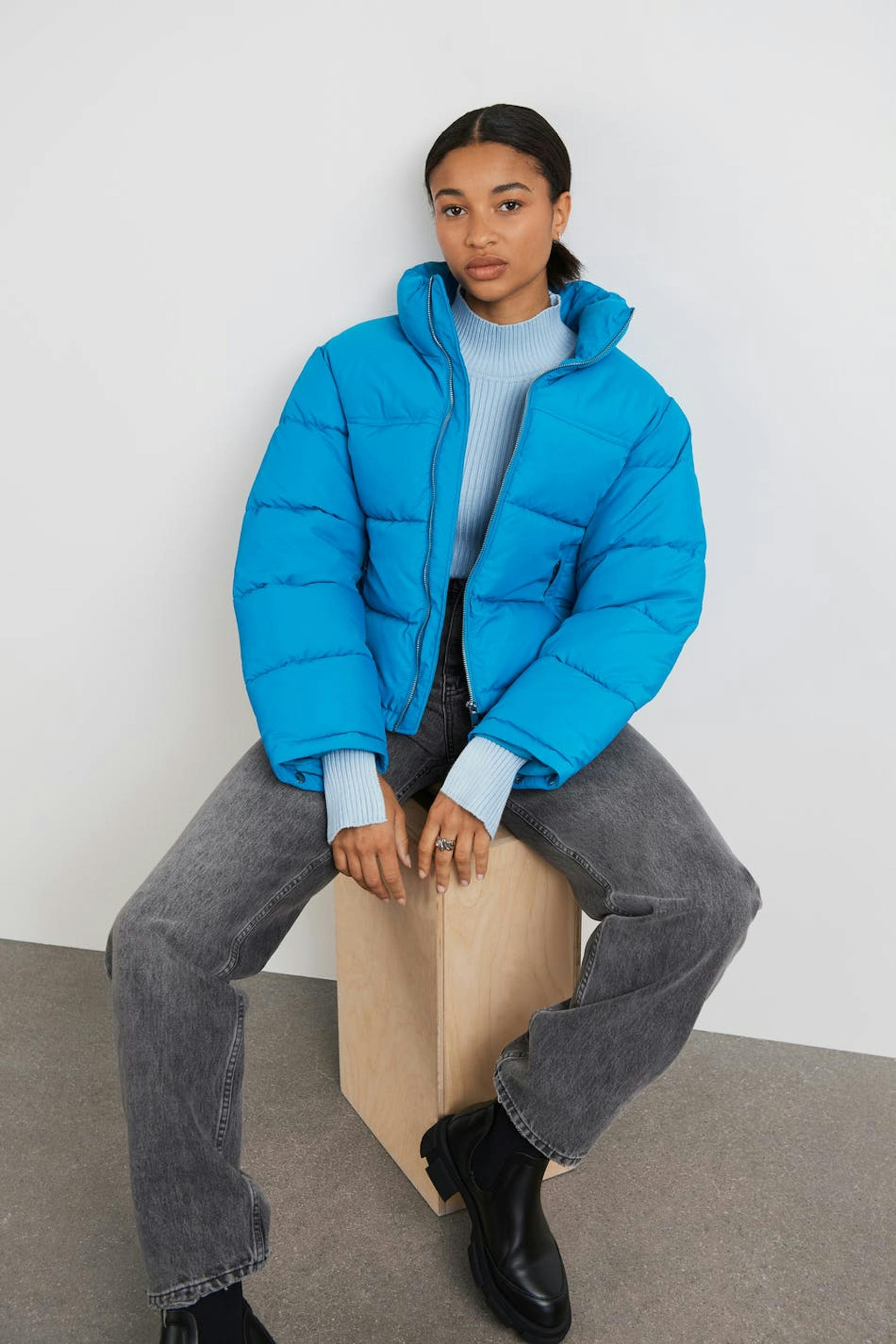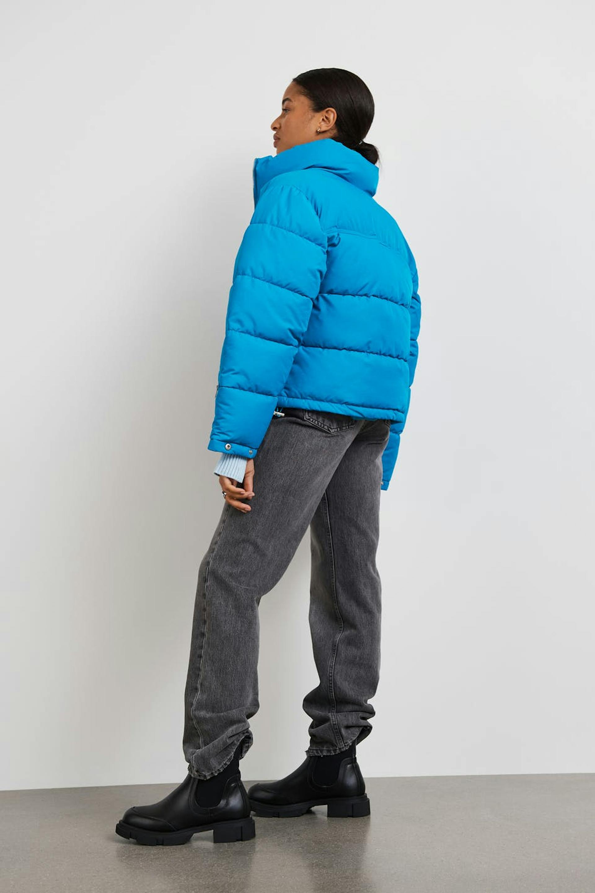 Puffer Jacke mit einer abgeschnittenen Länge. Die Jacke ist blau und hat einen Rollkragen. Sie hat Vordertaschen, einen Reißverschluss, Knopfleiste an den Ärmelenden und einstellbare Kordelzüge unten.