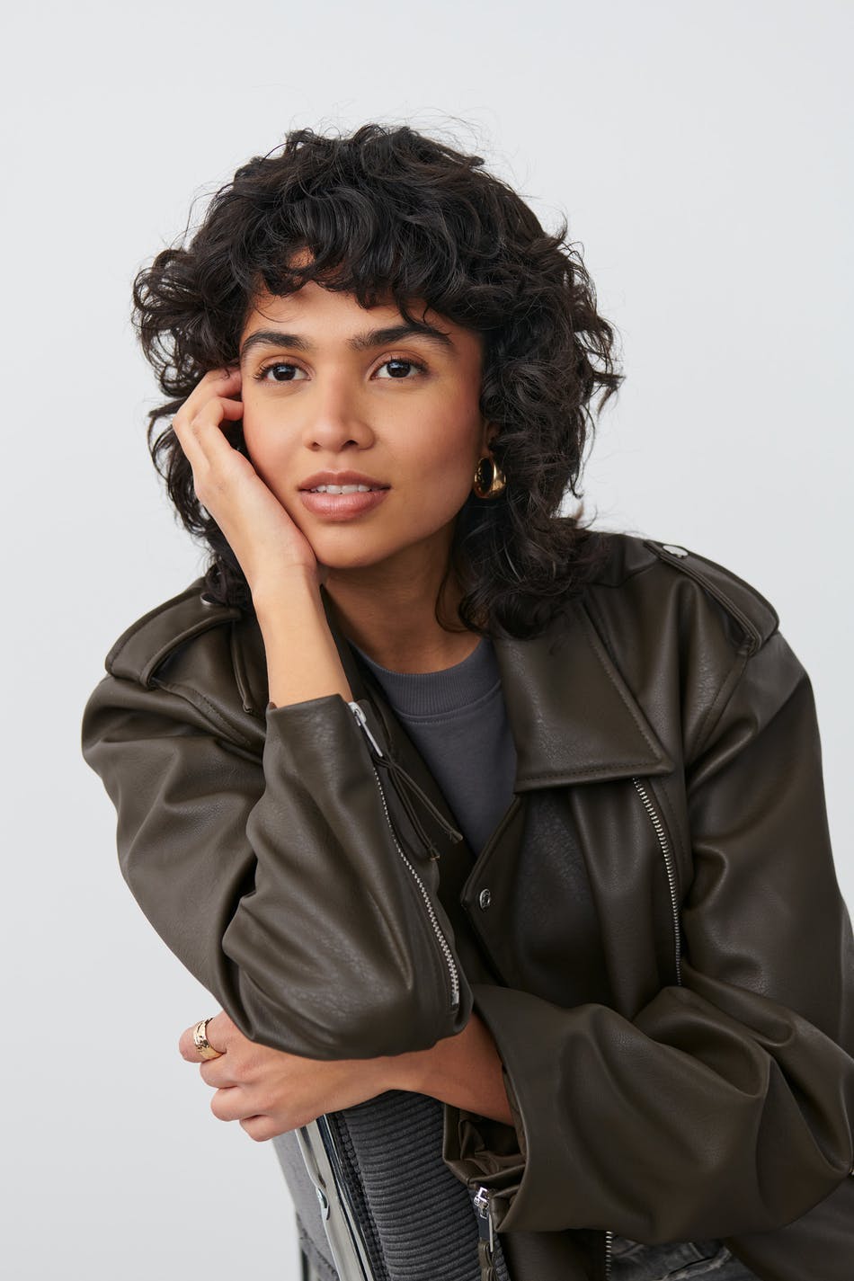 Oversize Lederjacke aus PU mit einstellbarem Gürtel. Die Jacke ist braun und hat diagonalen Reißverschluss vorne. Sie hat Kragen, Reißverschlusstaschen in den Seiten, Schulterklappen, Revers mit dekorativen Knöpfen und Reißverschluss an den Ärmelenden.