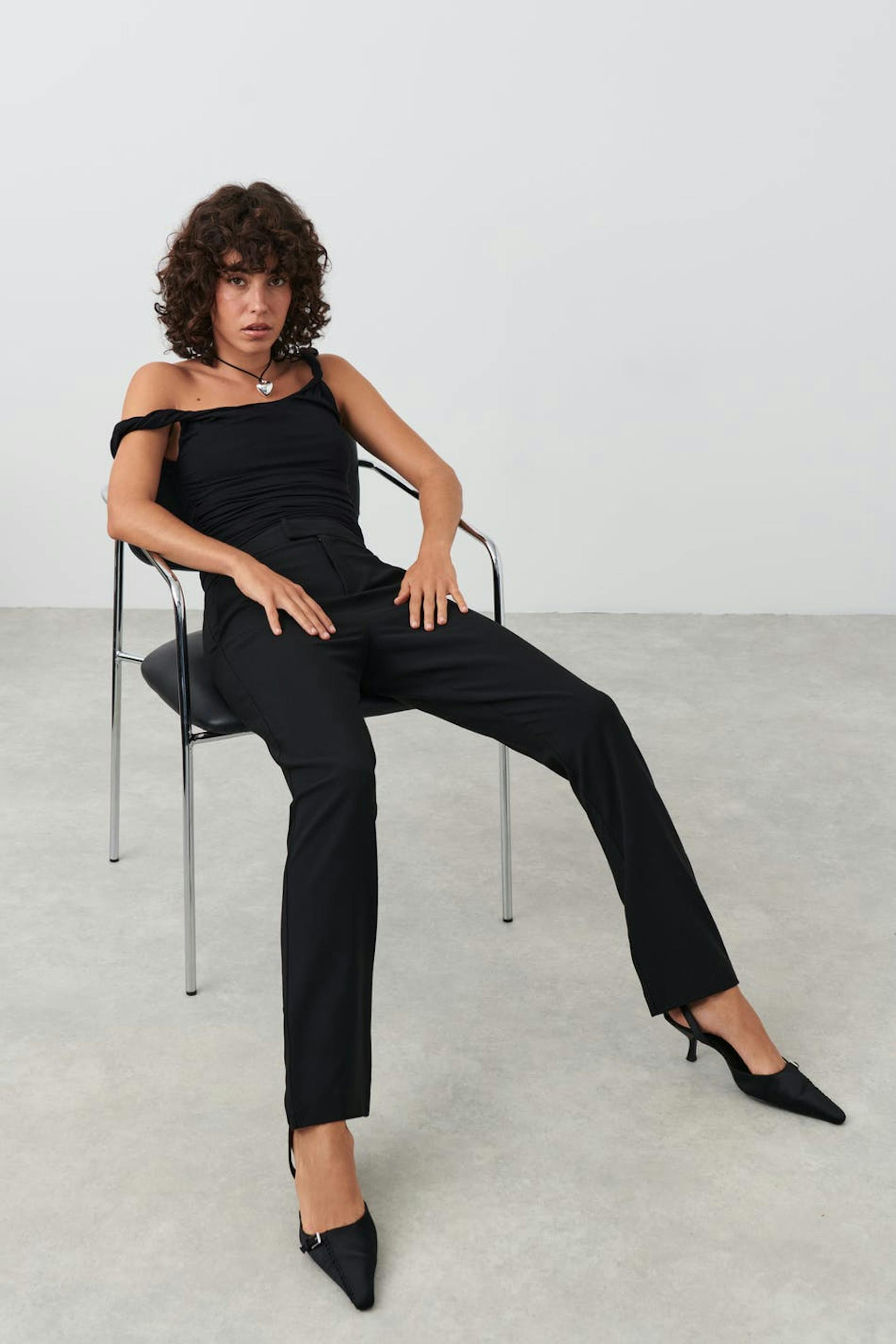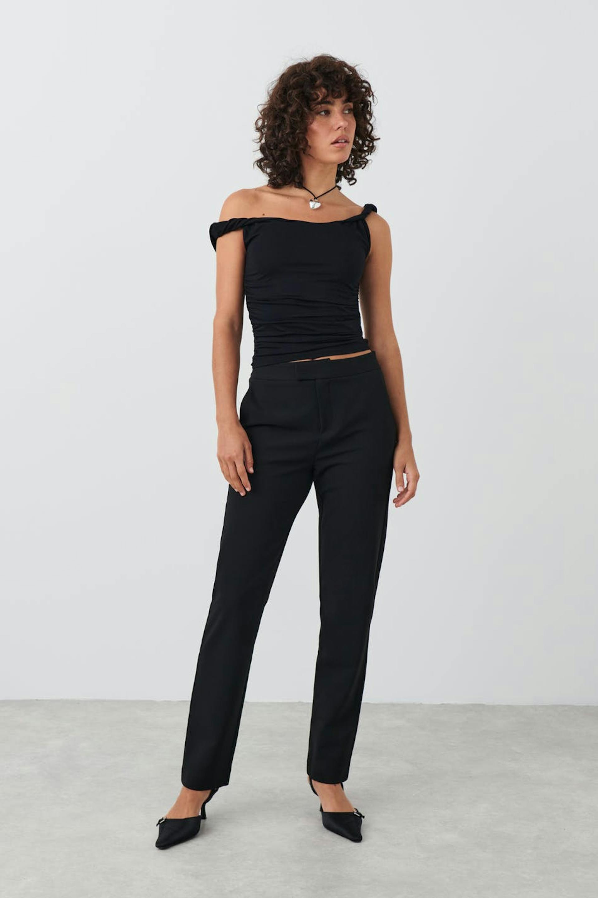 Anzughosen mit figurbetonter Passform. Die Hosen sind schwarz und haben hohen Bund. Sie haben elastische Qualität, konische Beine, Seitentaschen und Reißverschluss.