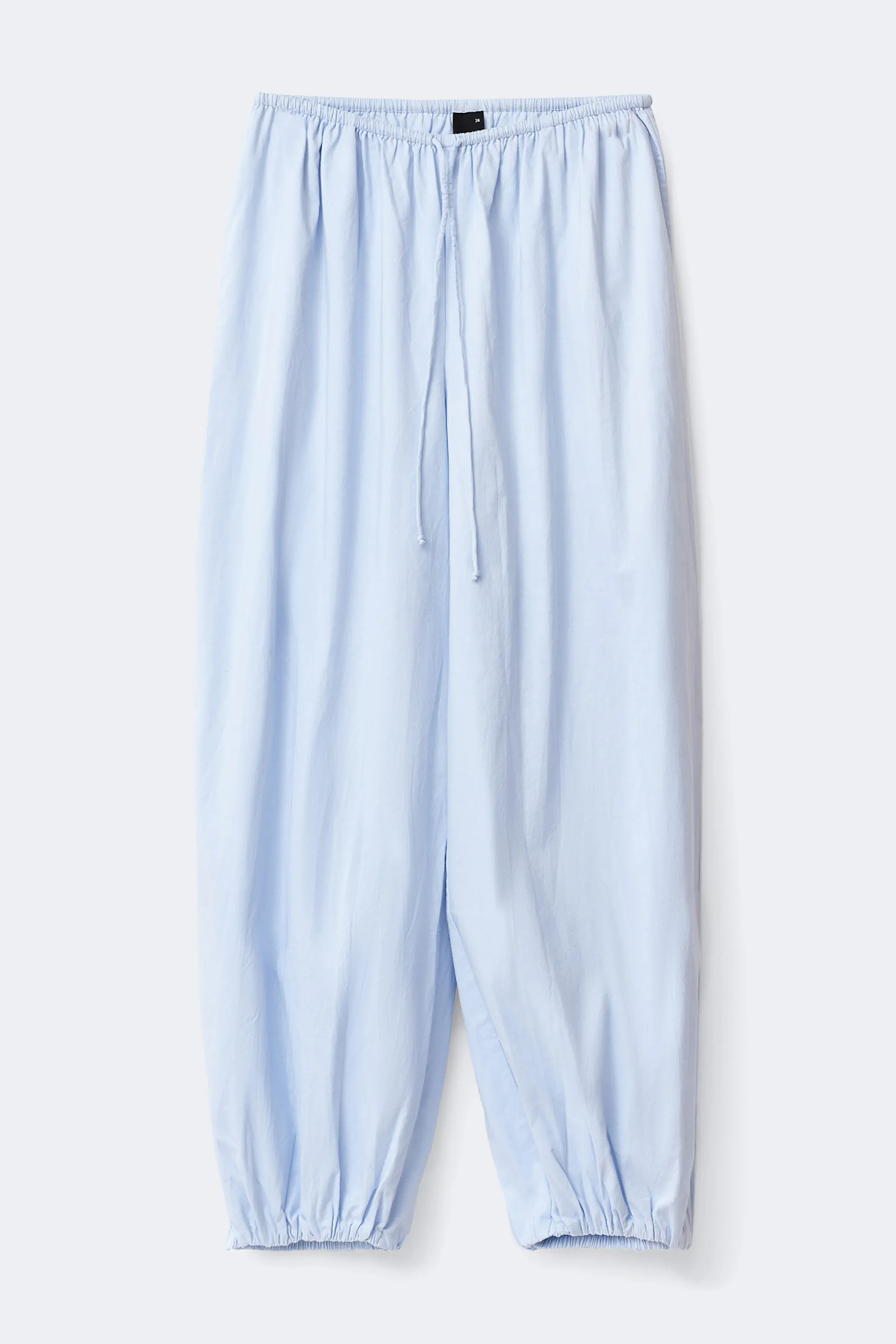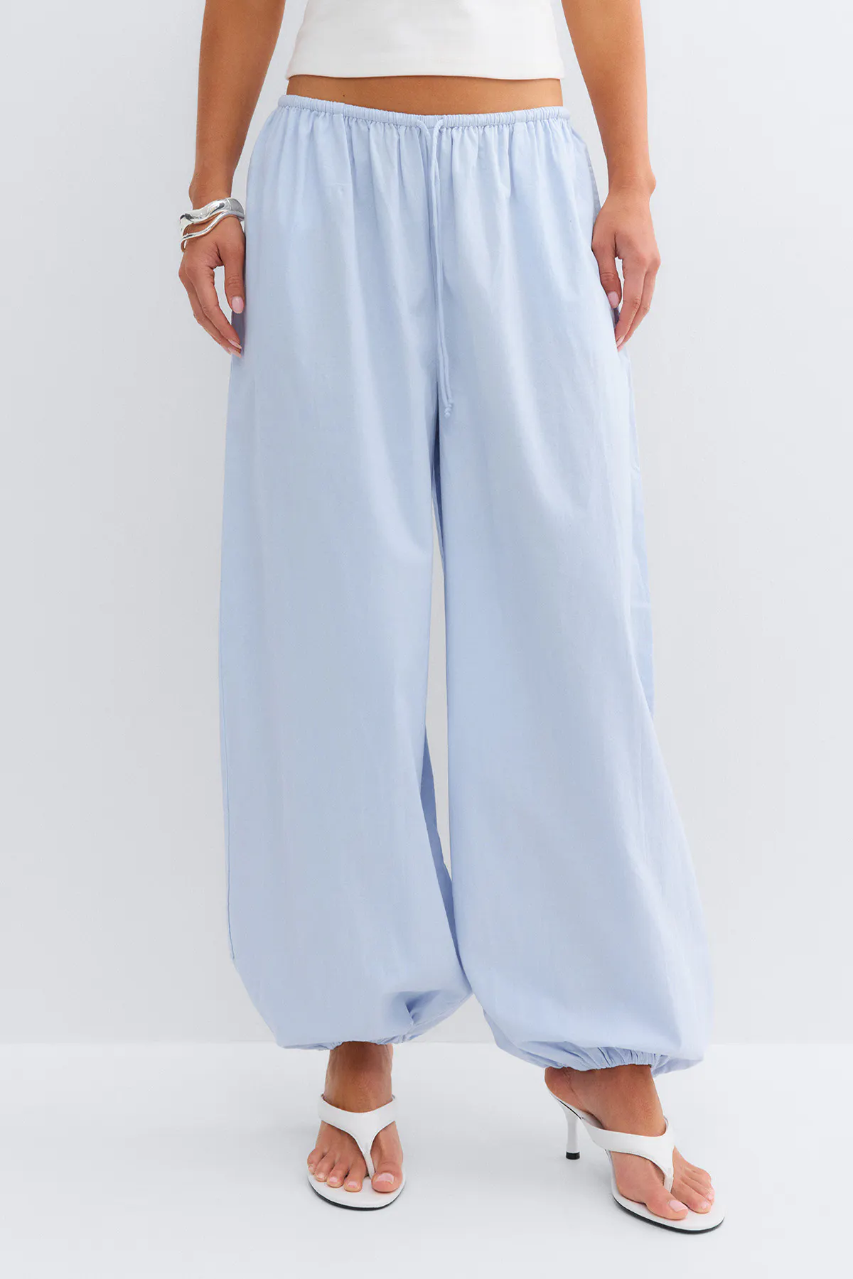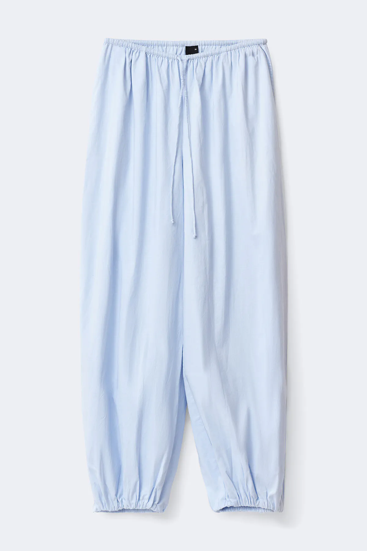 Ballonhosen aus 100% Baumwolle mit elastischer mittlerer Taille. Die Ballonhosen sind hellblau und haben Selbstbindung in der Taille. Sie haben Seitentaschen, großzügige Passform und normale Länge.