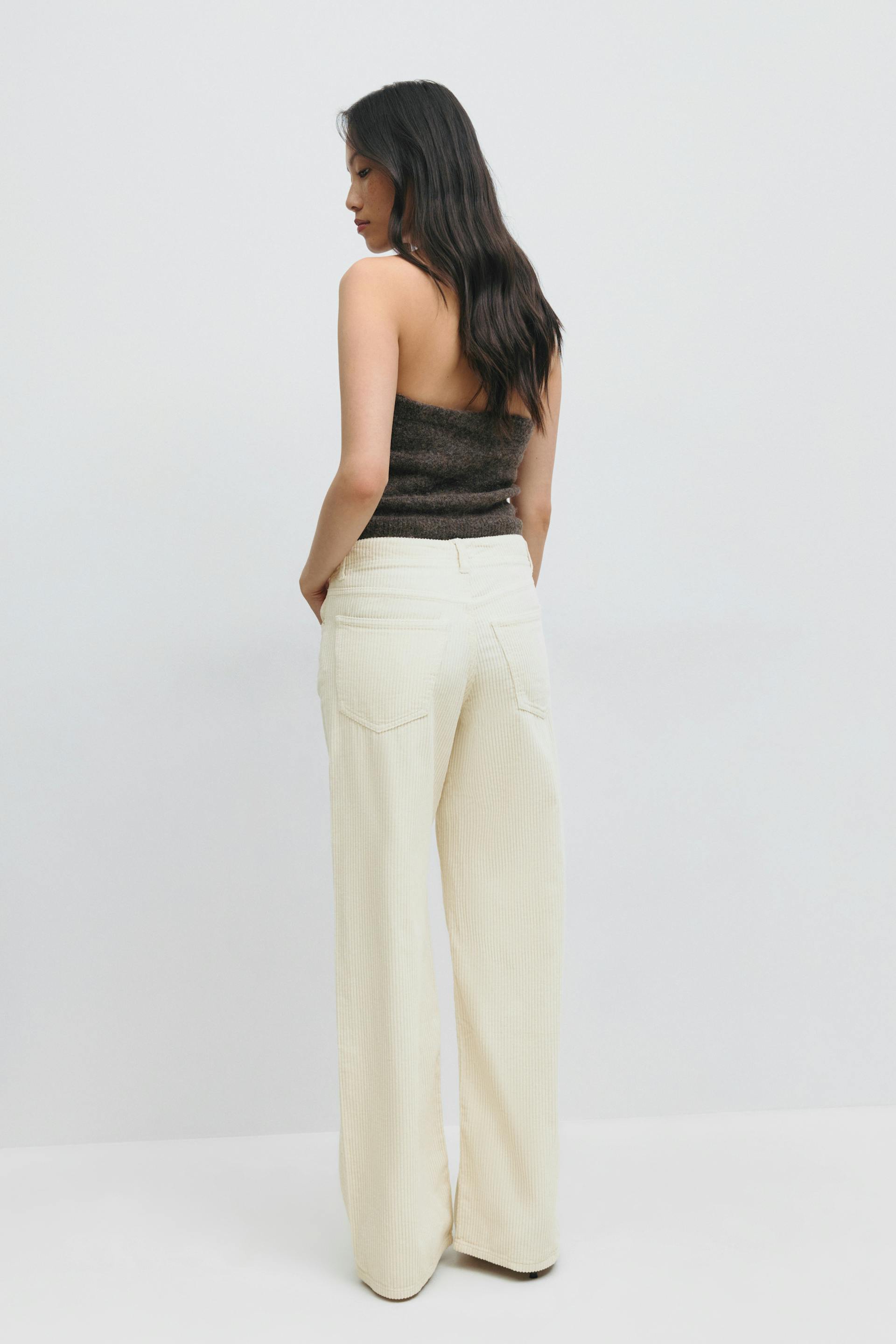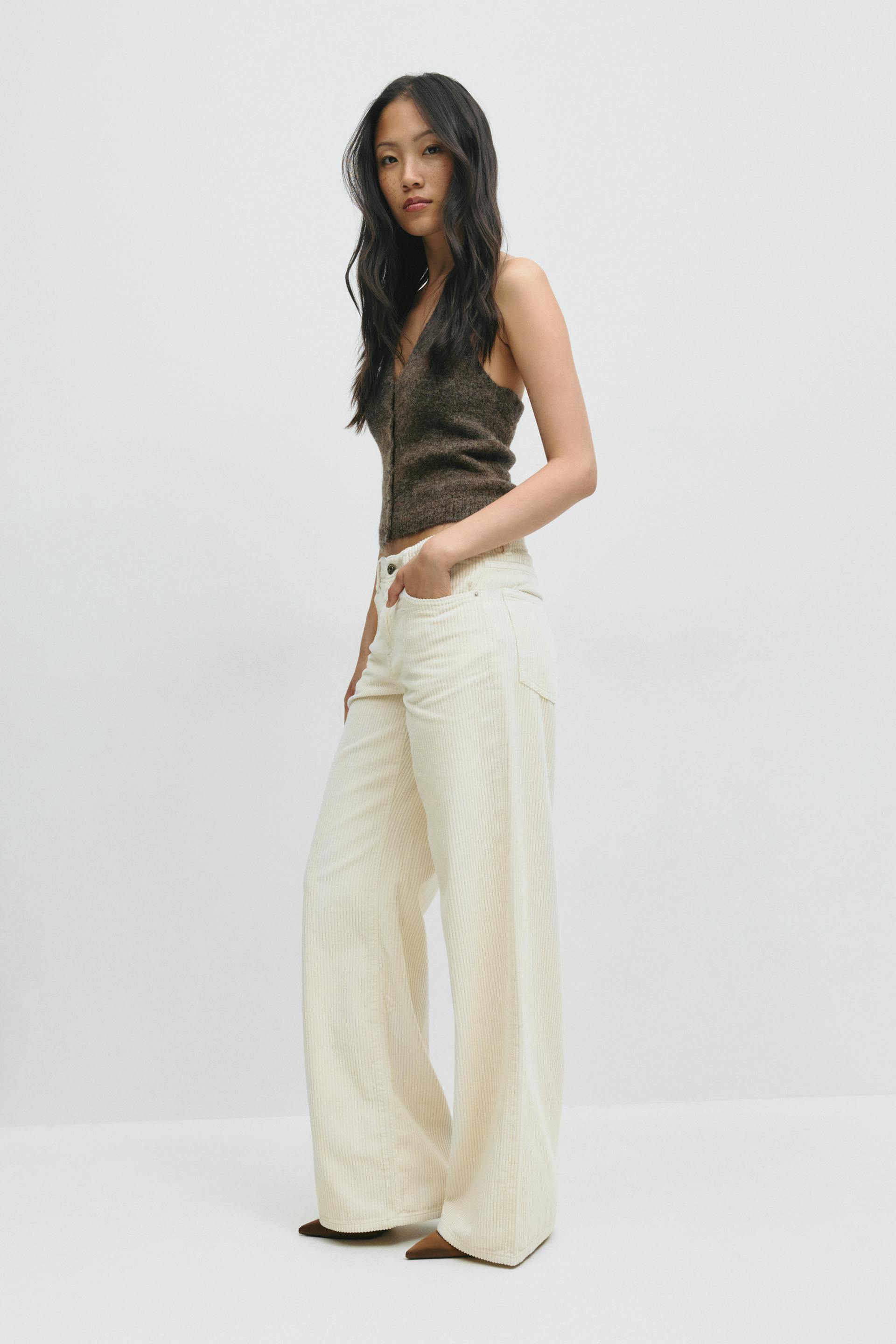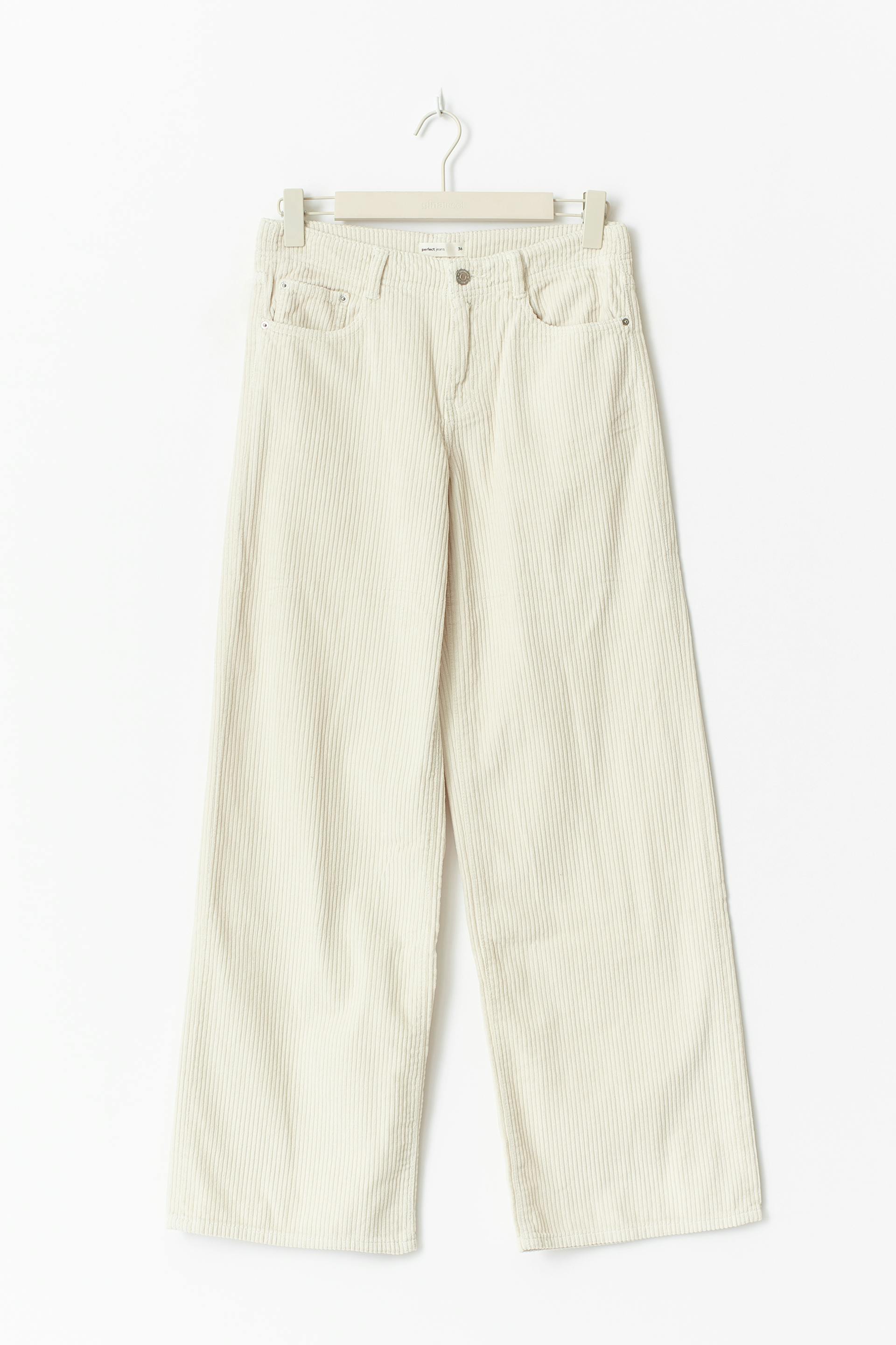 Manchester-Hosen mit tiefer Taille. Die Hosen sind weiβ und haben breite Beine. Sie haben normale Passform, Reißverschluss, Gürtelschlaufen und Taschen vorne und hinten.