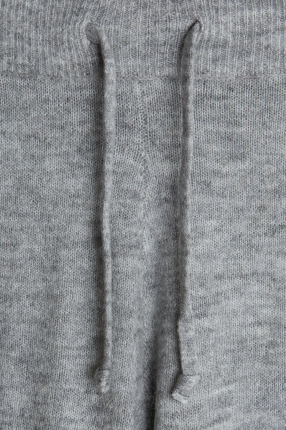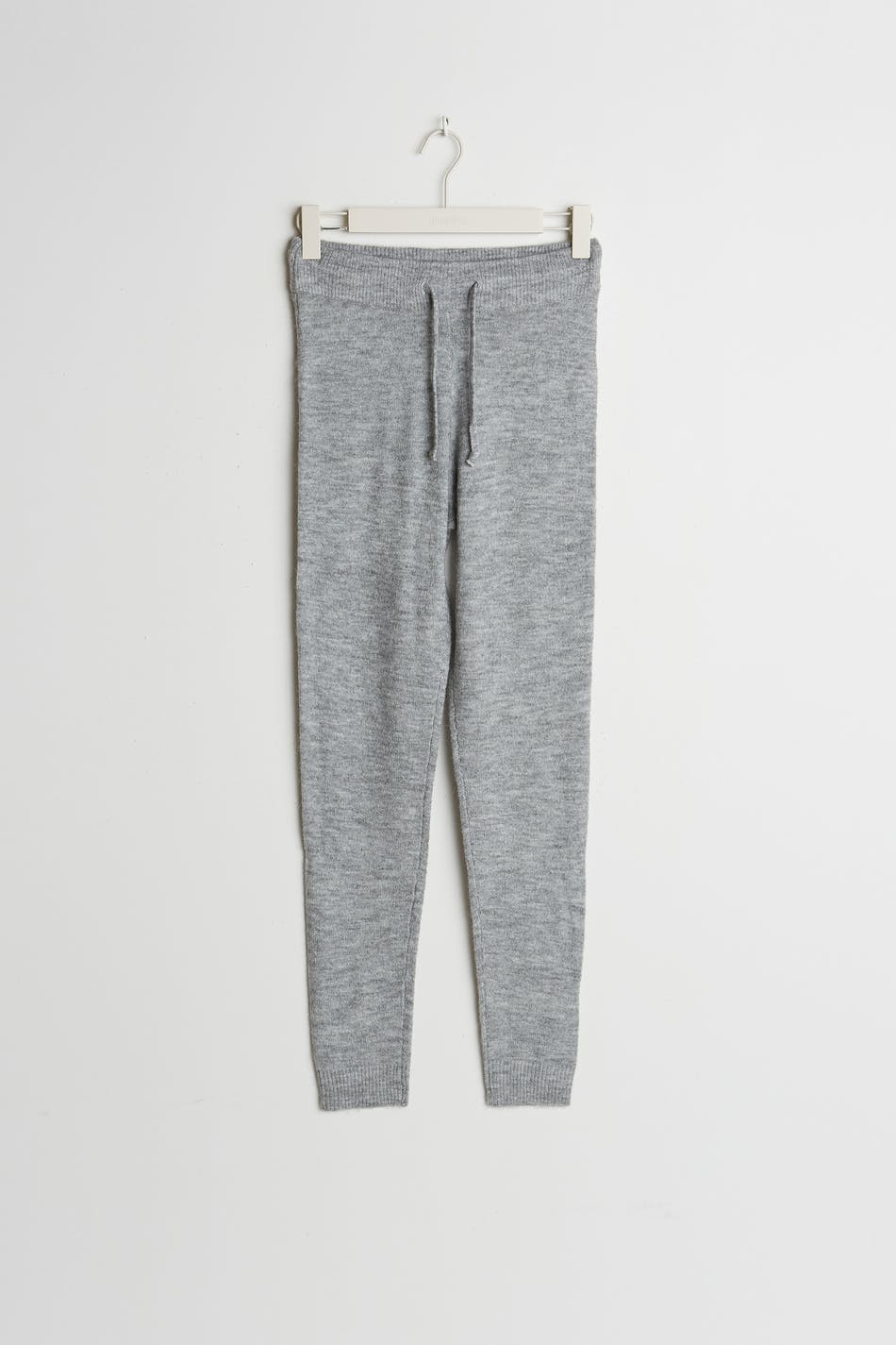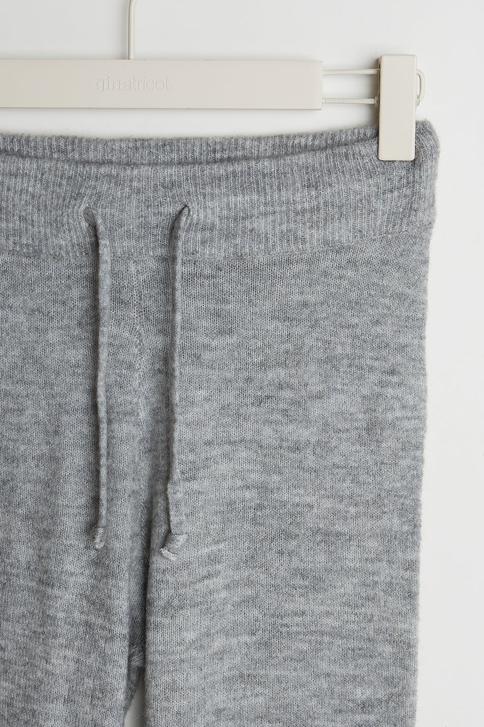 Gestrickte Hosen mit einem Kordelzug in der Taille. Die Hosen sind grau und weich und haben eine gerippte Manschette am Beinende und in der Taille.
