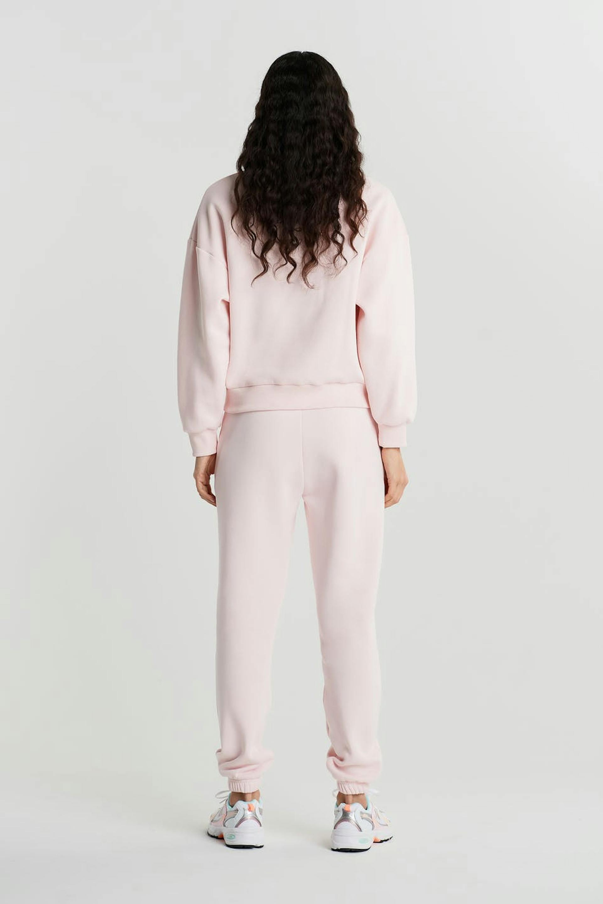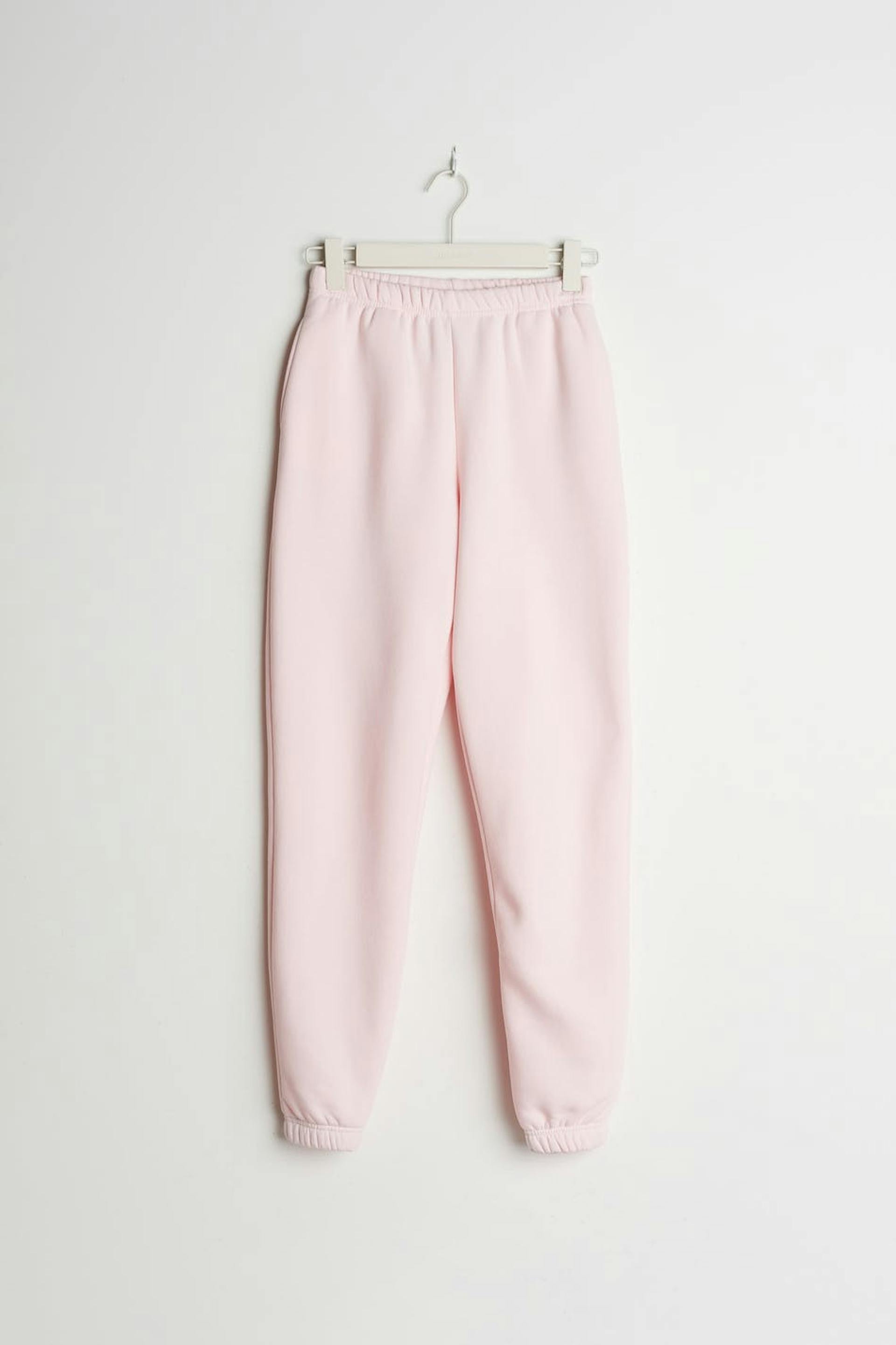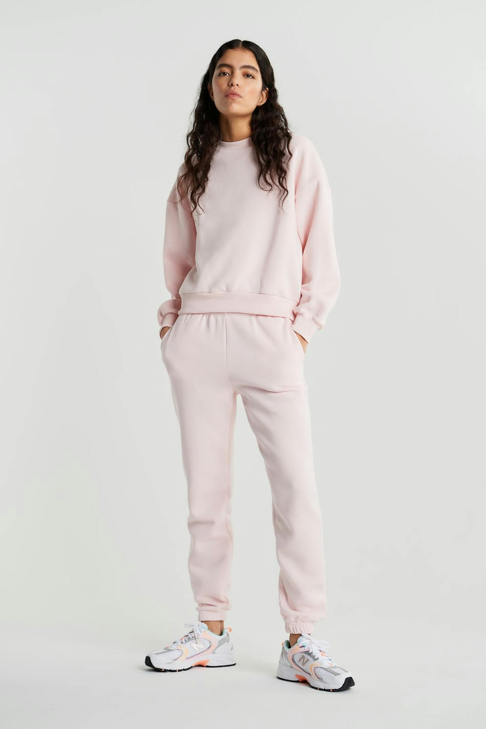 Jogginghosen mit einer normaler Passform. Die Hosen sind rosa und haben ein Gummiband in der Taille und am Beinende.