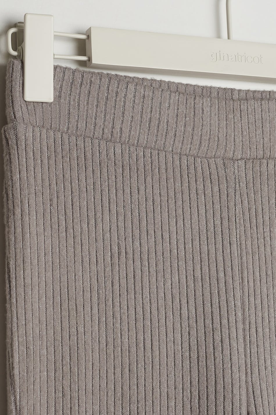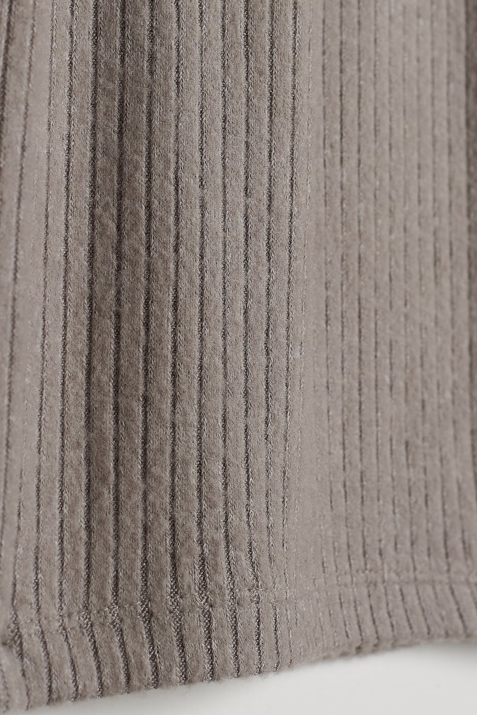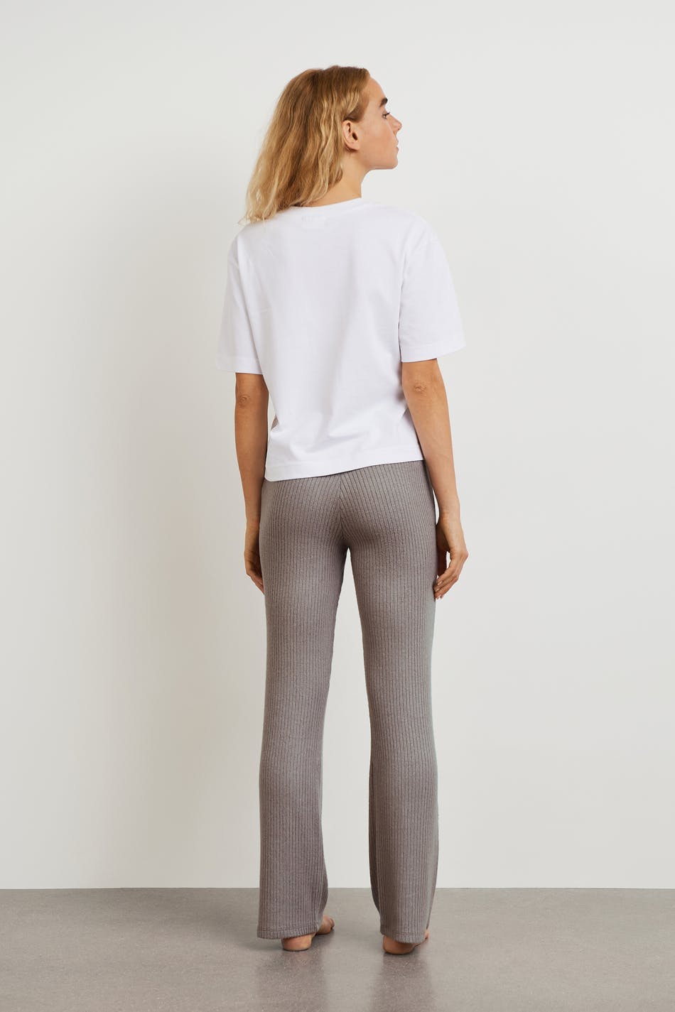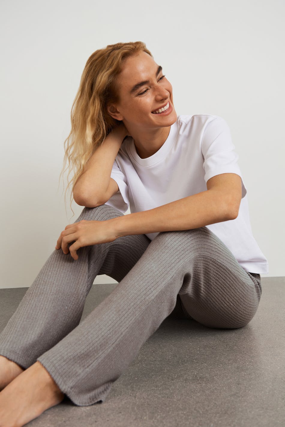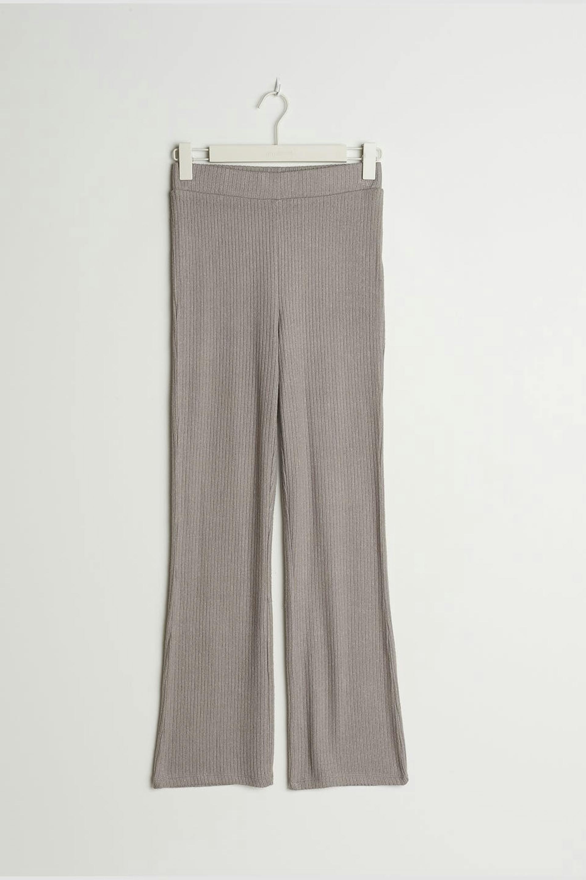 Hosen mit einer normalen Passform. Die Hosen sind grau und haben eine weiche Qualität mit einem Rippenstrick. Sie haben ein weiches Gummiband in der Taille und gerade, lange Hosenbeine.