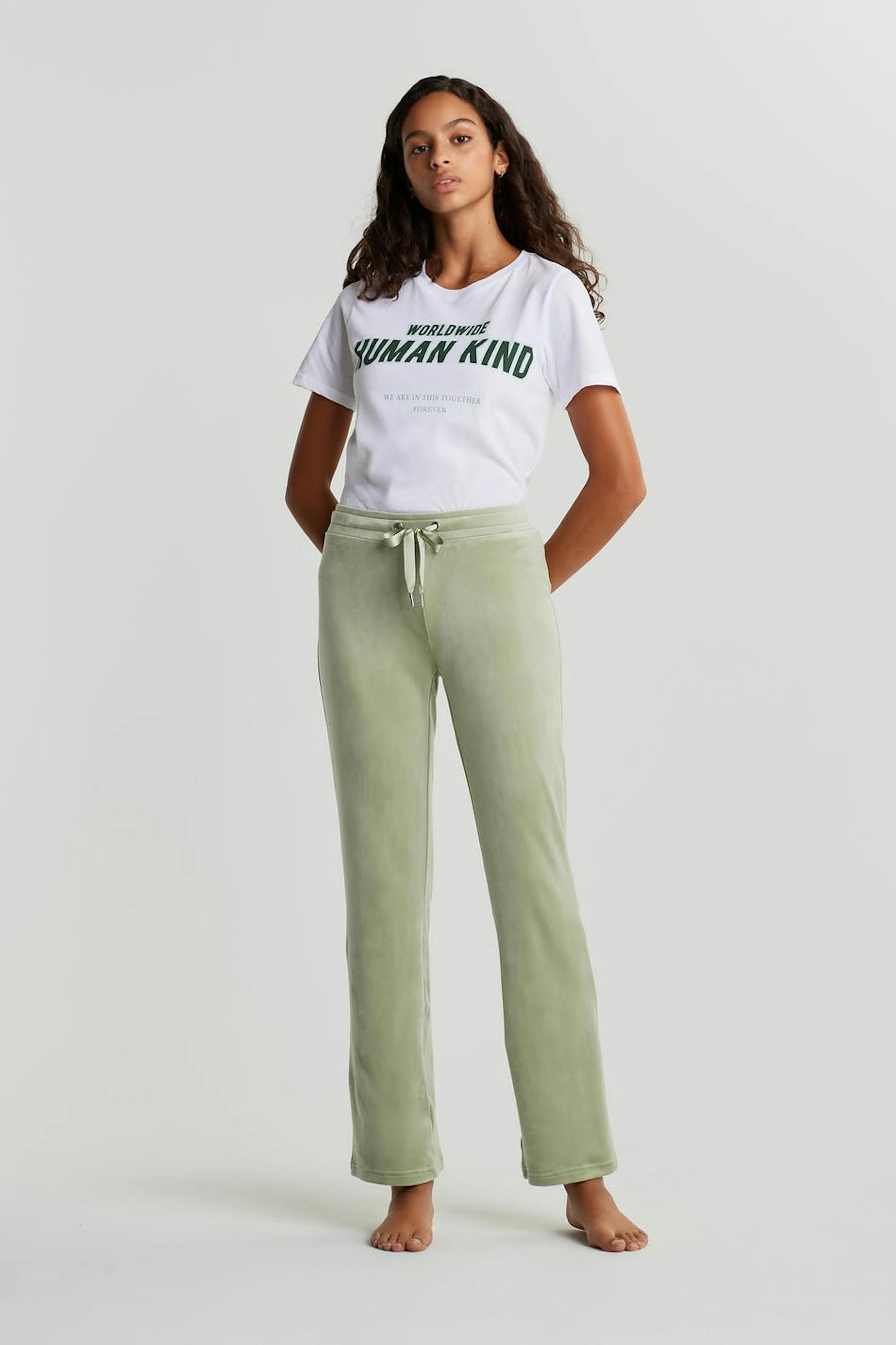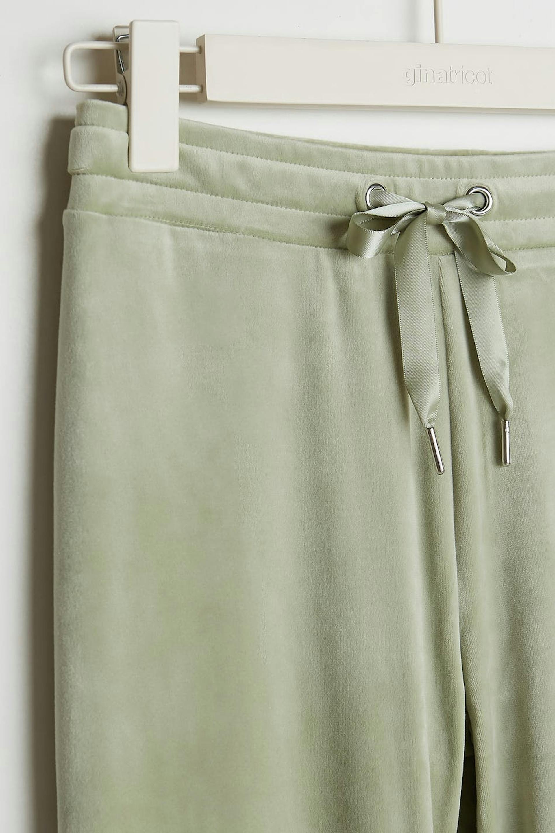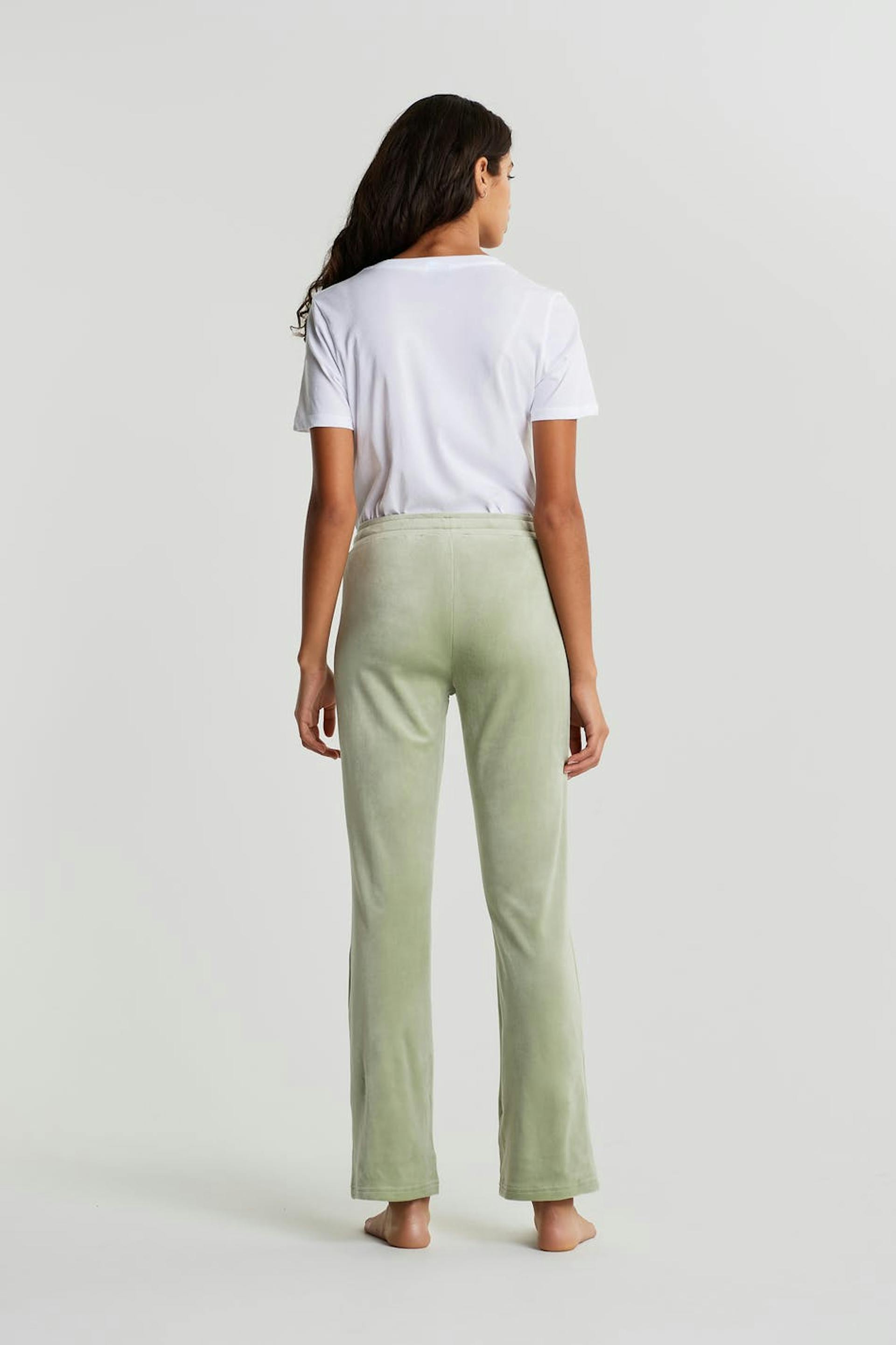 Jogginghose mit gerade geschnittenen. Die Hose ist hellgrün und hat eine Taille mit einem elastischem Gurt und einem Kordelzug. Sie ist hergestellt aus Velours. Von Feuerquellen fernhalten.