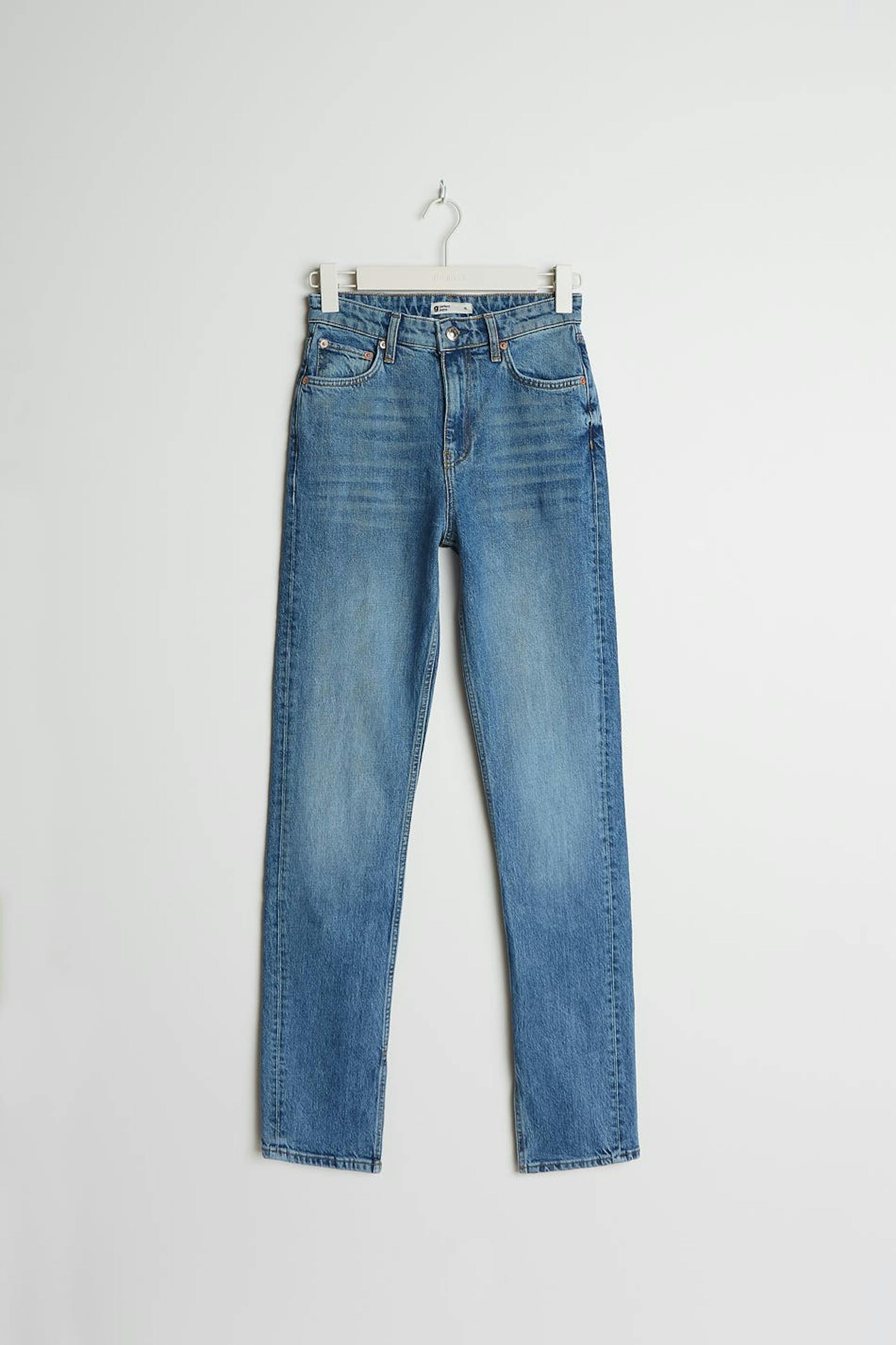 Gerade Jeans mit einem hohem Bund. Die Jeans ist blau und hat eine schlanke Passform. Sie hat einen Schlitz an den Beinöffnungen und tiefen Stretch.