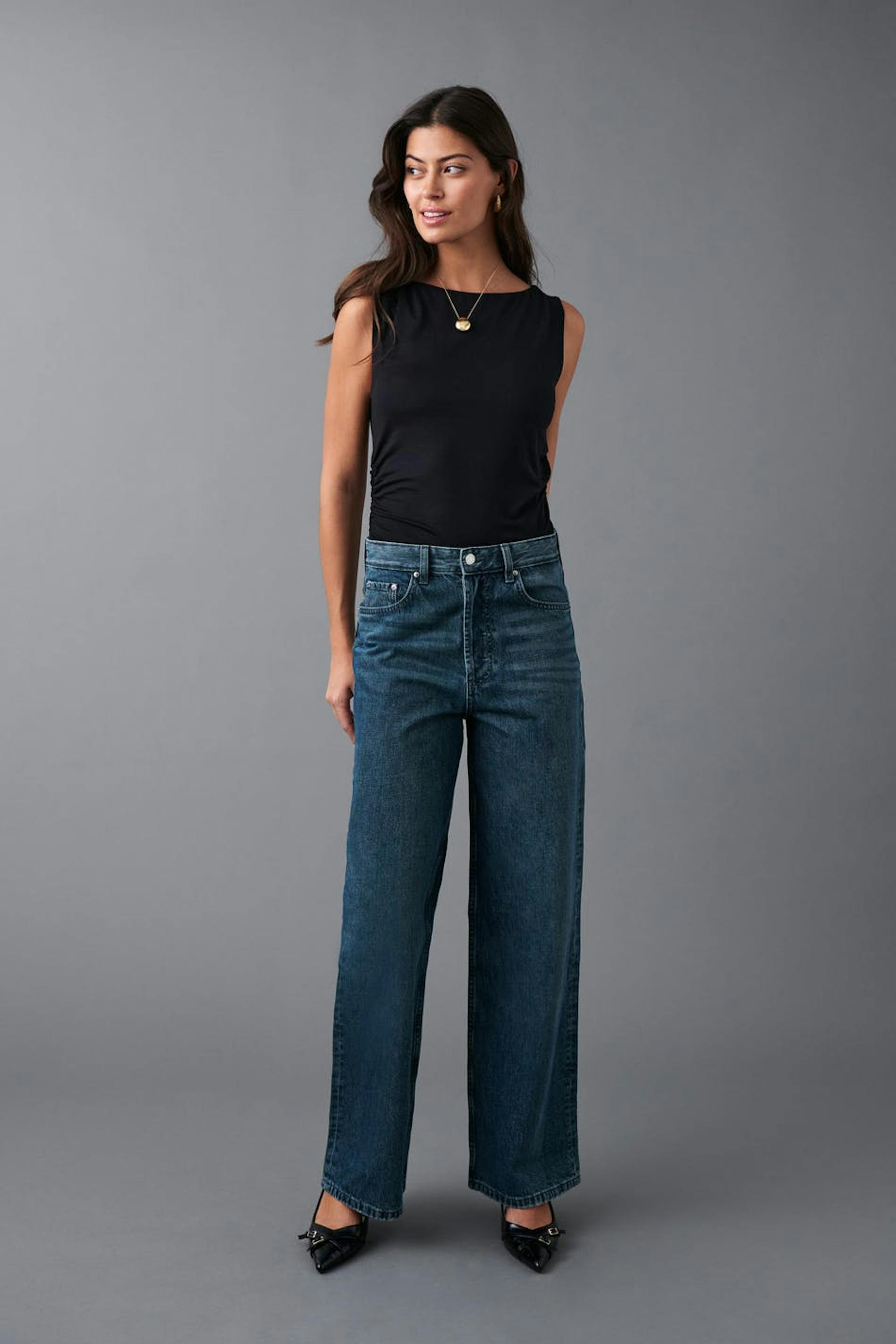 Baggy Jeans mit hohem Bund aus nicht dehnbarem Denim. Die Jeans ist blau und hat breite Beine mit voller Länge. Sie hat weit-geschnittenen Style, Knopfverschluss und Taschen vorne und hinten. Benutze unsere Größentabelle, um deine Größe zu finden.