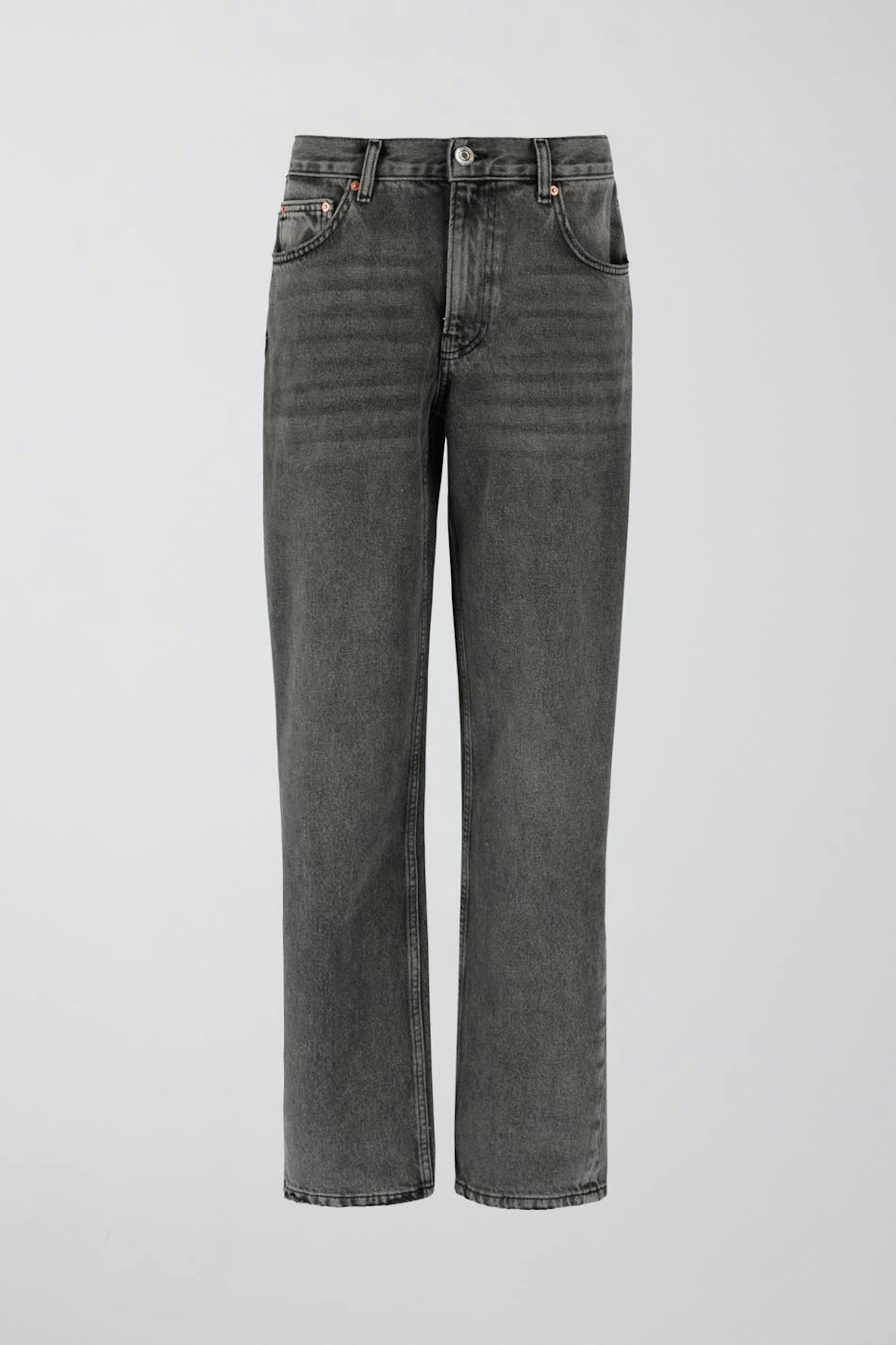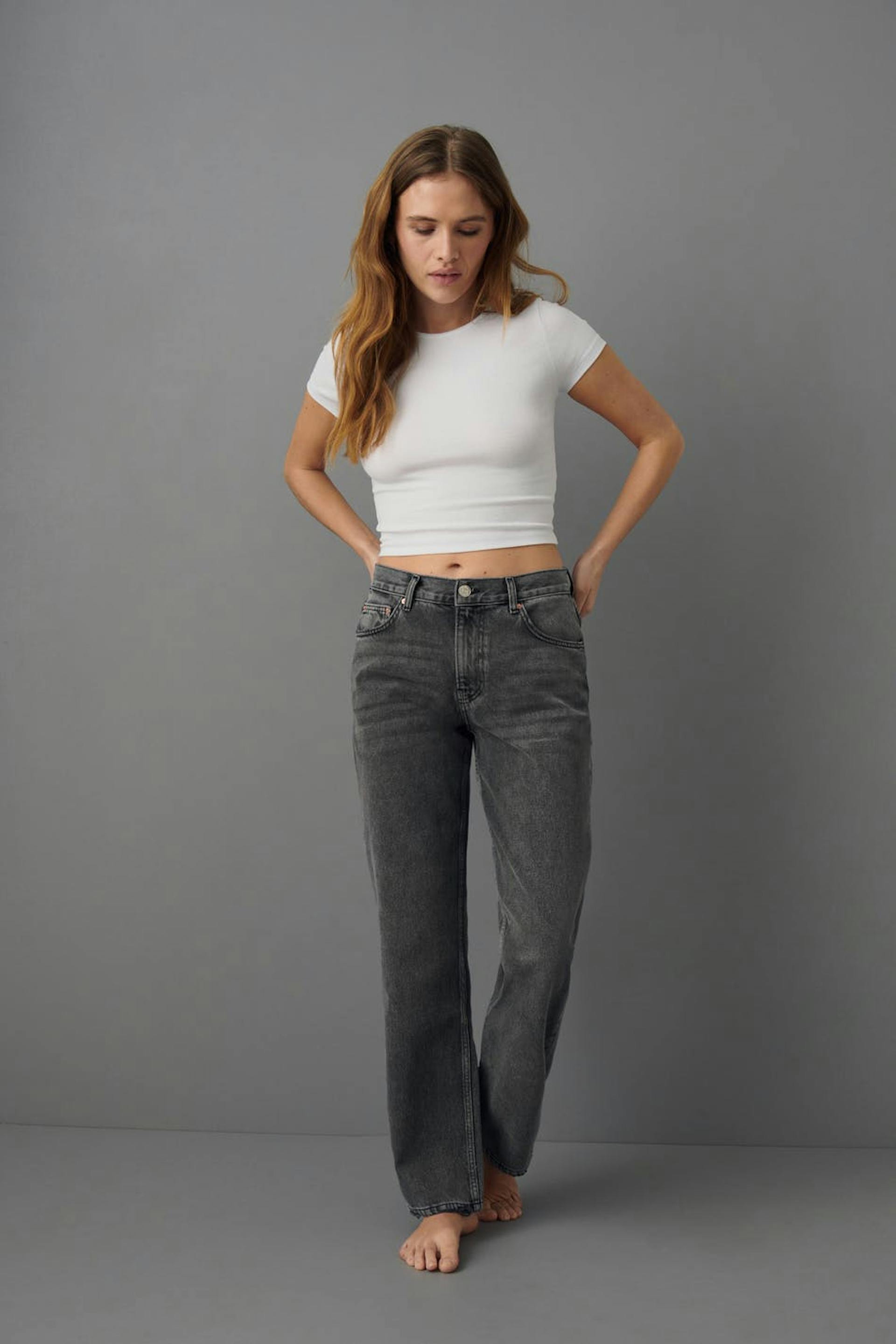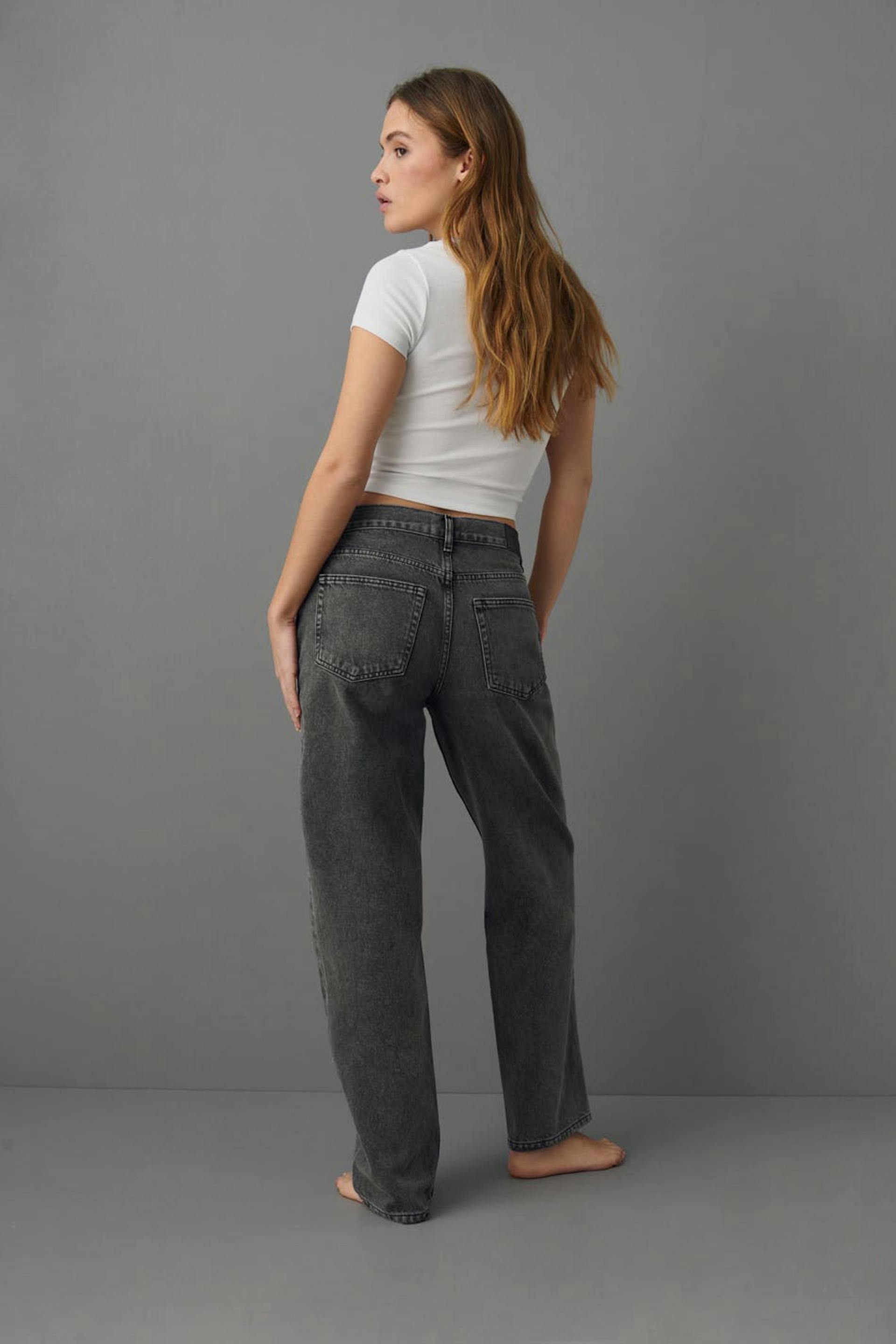 Boyfriend-Jeans mit tiefer Taille. Die Jeans ist grau und hat eine lockere, gerade Passform aus weichem nicht dehnbarem Denim. Sie hat Reißverschluss, Hosenbeine mit voller Länge und Taschen vorne und hinten. Benutze unsere Größentabelle, um deine Größe zu finden.