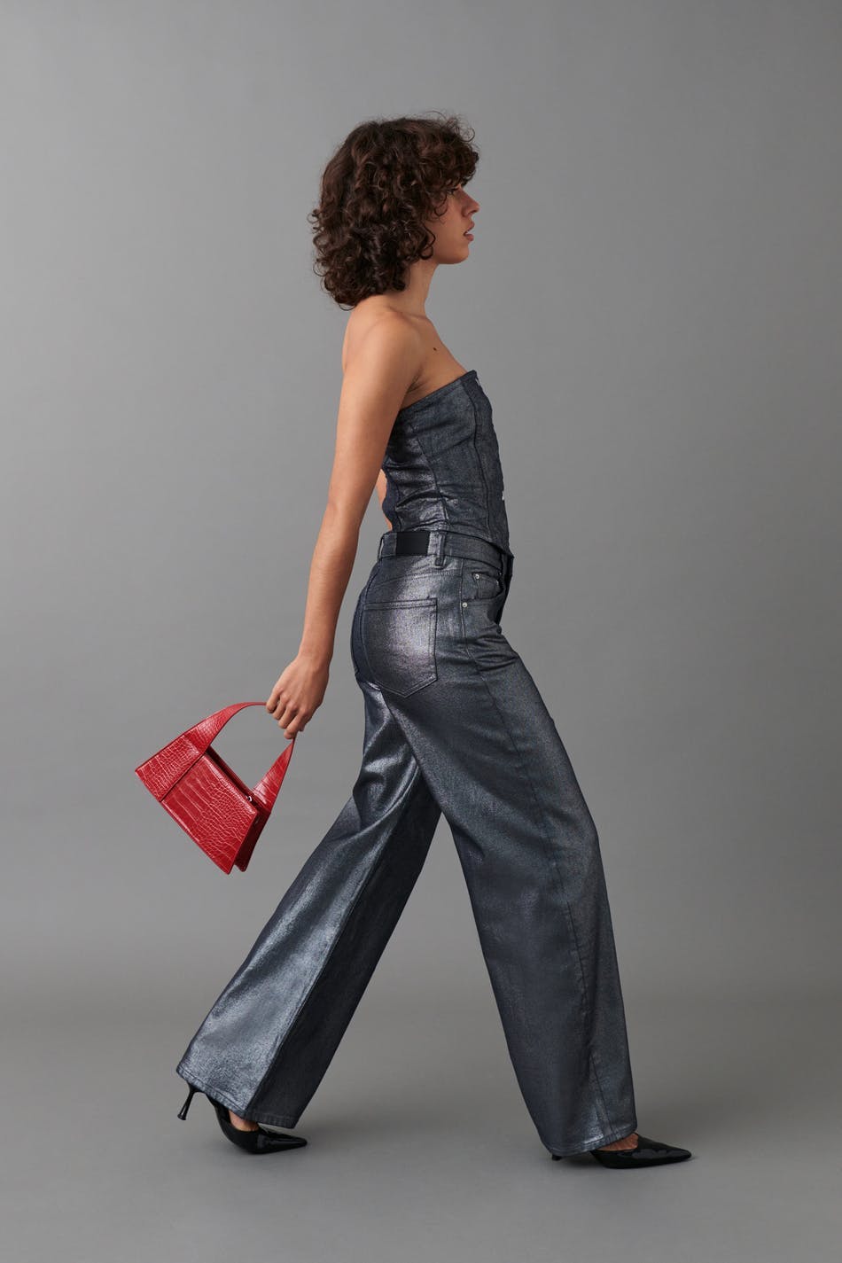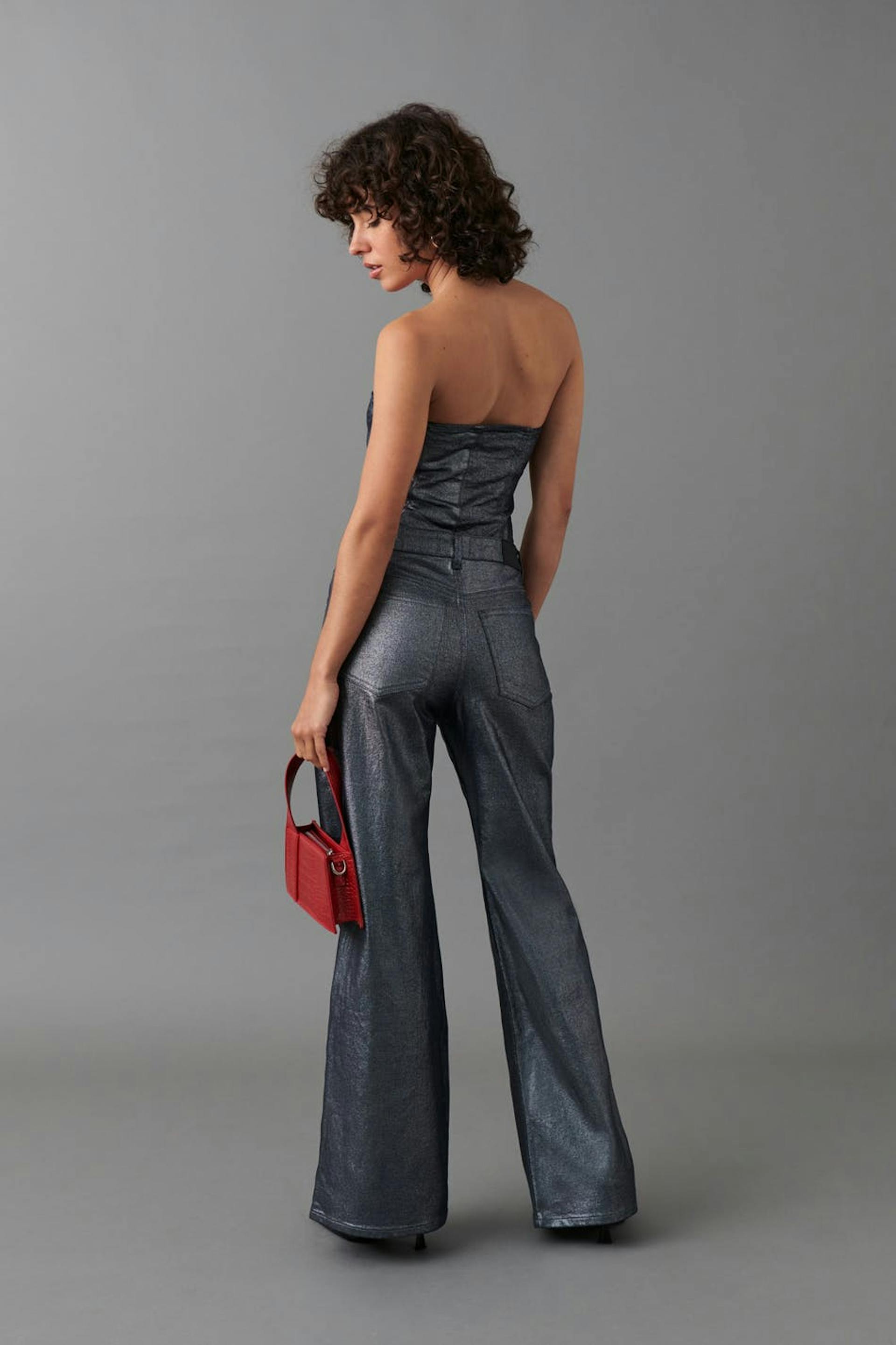 Glänzende Jeans mit hohem Bund. Die Jeans ist silbern und hat breite Beine mit voller Länge. Sie hat leichten Stretch und Taschen vorne und hinten. Benutze unsere Größentabelle, um deine Größe zu finden.