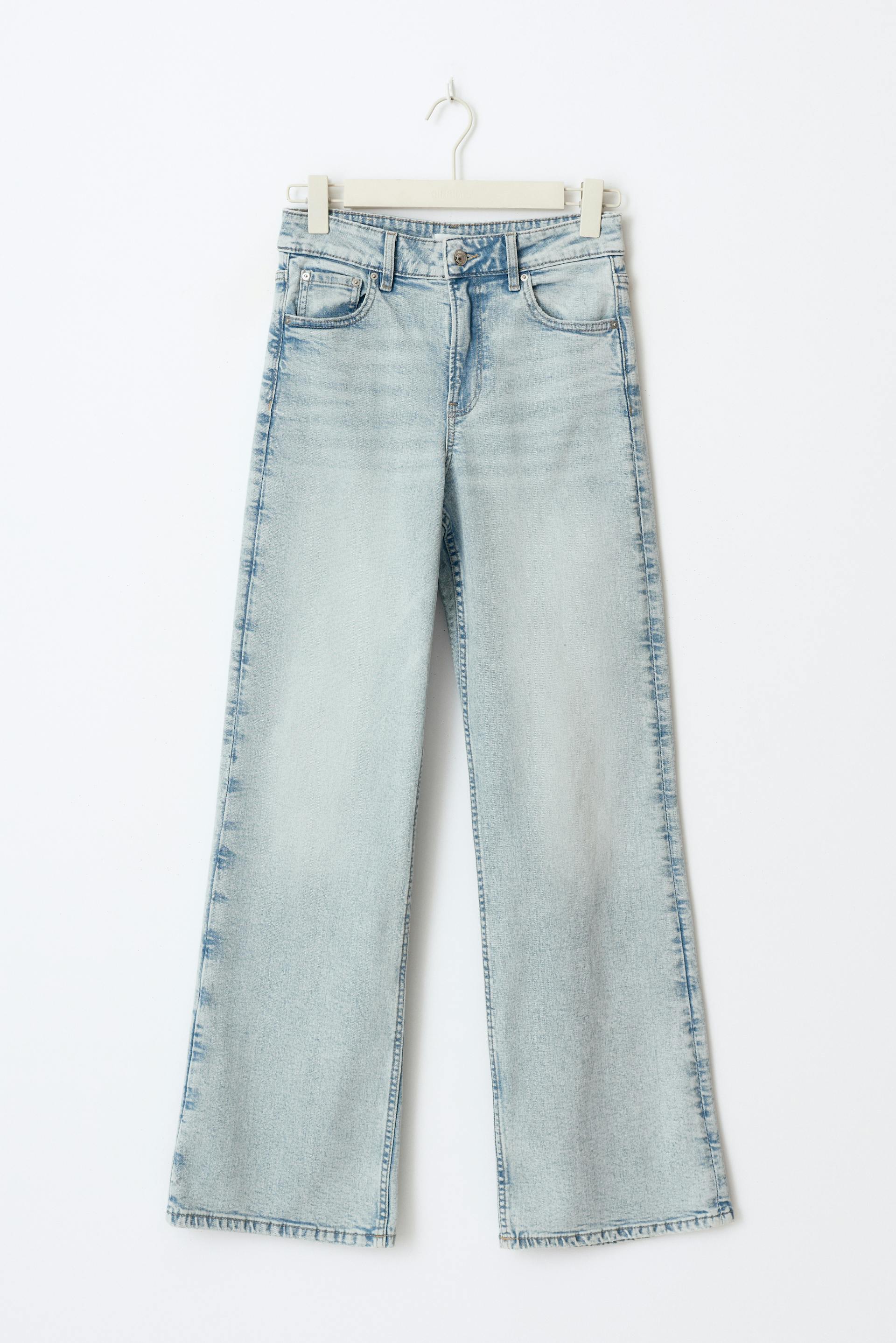 Weite Jeans mit extralangen Beinen. Die Jeans ist hellblau und hat hohen Bund. Sie hat Reißverschluss, elastische Qualität und Taschen vorne und hinten. Ideal bei einer Körpergröße ab 1,75 m. Benutze unsere Größentabelle, um deine Größe zu finden.