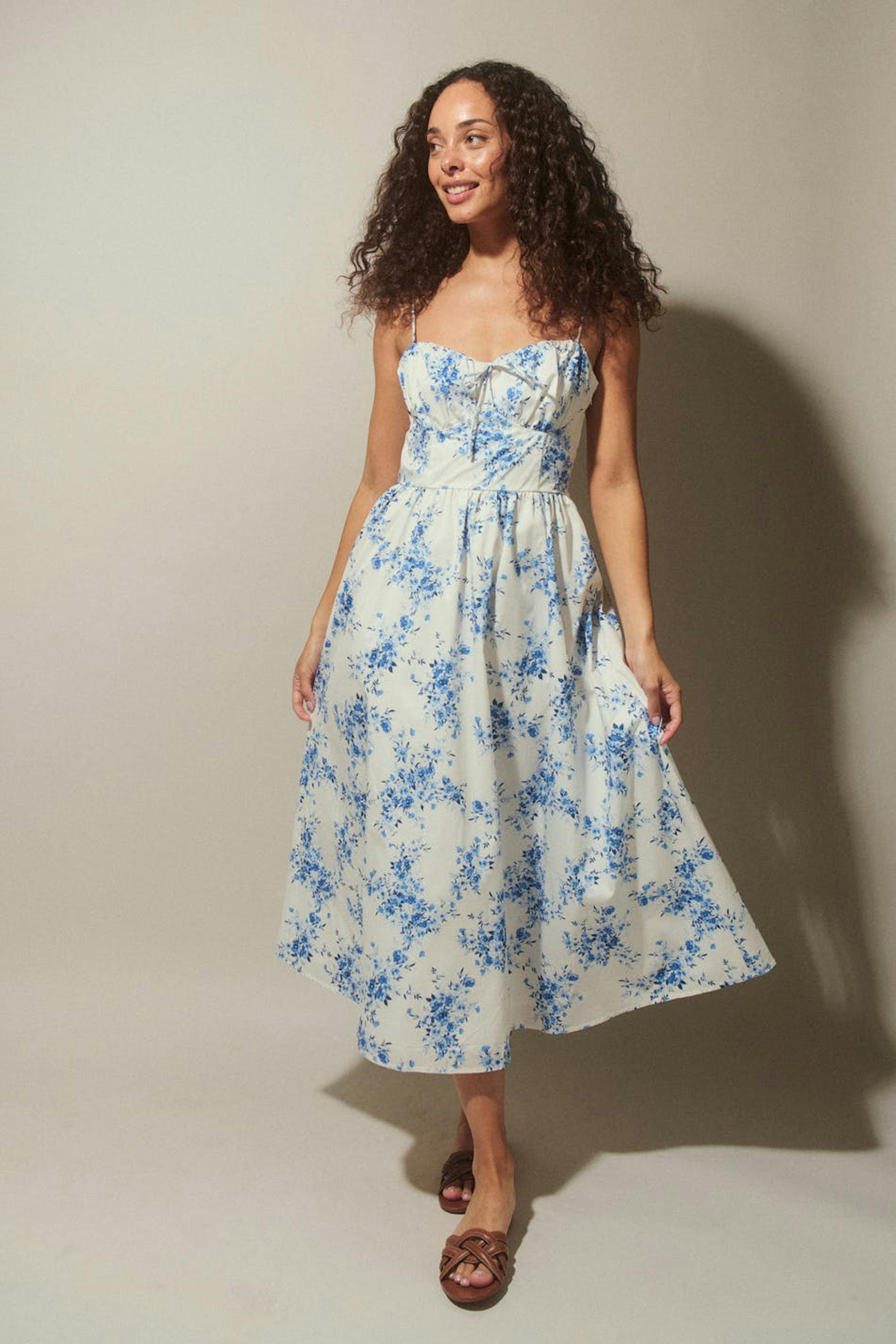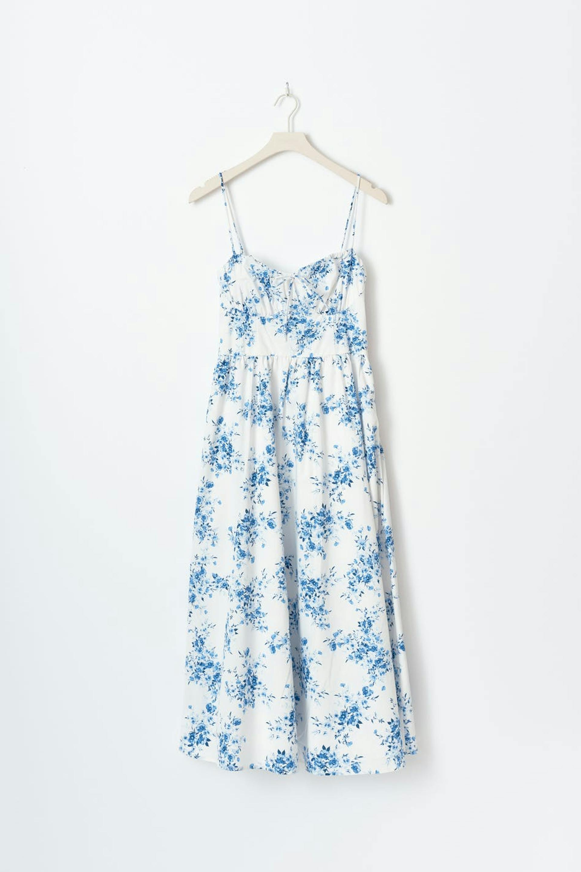 Blumiges Kleid mit Schnürung am Rücken. Das Kleid ist blau, weiβ und ärmellos. Es hat Reißverschluss an der Seite, Schleifen-Detail vorne, verstellbare Trägerbänder, Raffnähte in der Taille und Midi-Länge.