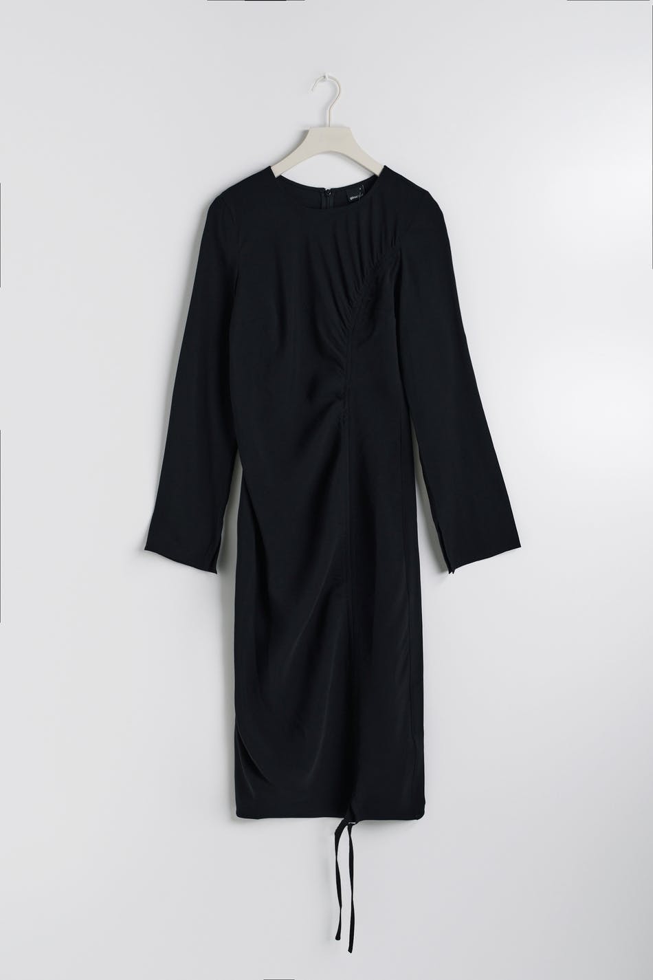 Langärmliges Kleid mit gesammeltem Kordelzug unter der Seite. Das Kleid ist schwarz und hat Rundhalsausschnitt. Es hat Reißverschluss auf der Rückseite und Schlitz an den Ärmelenden.