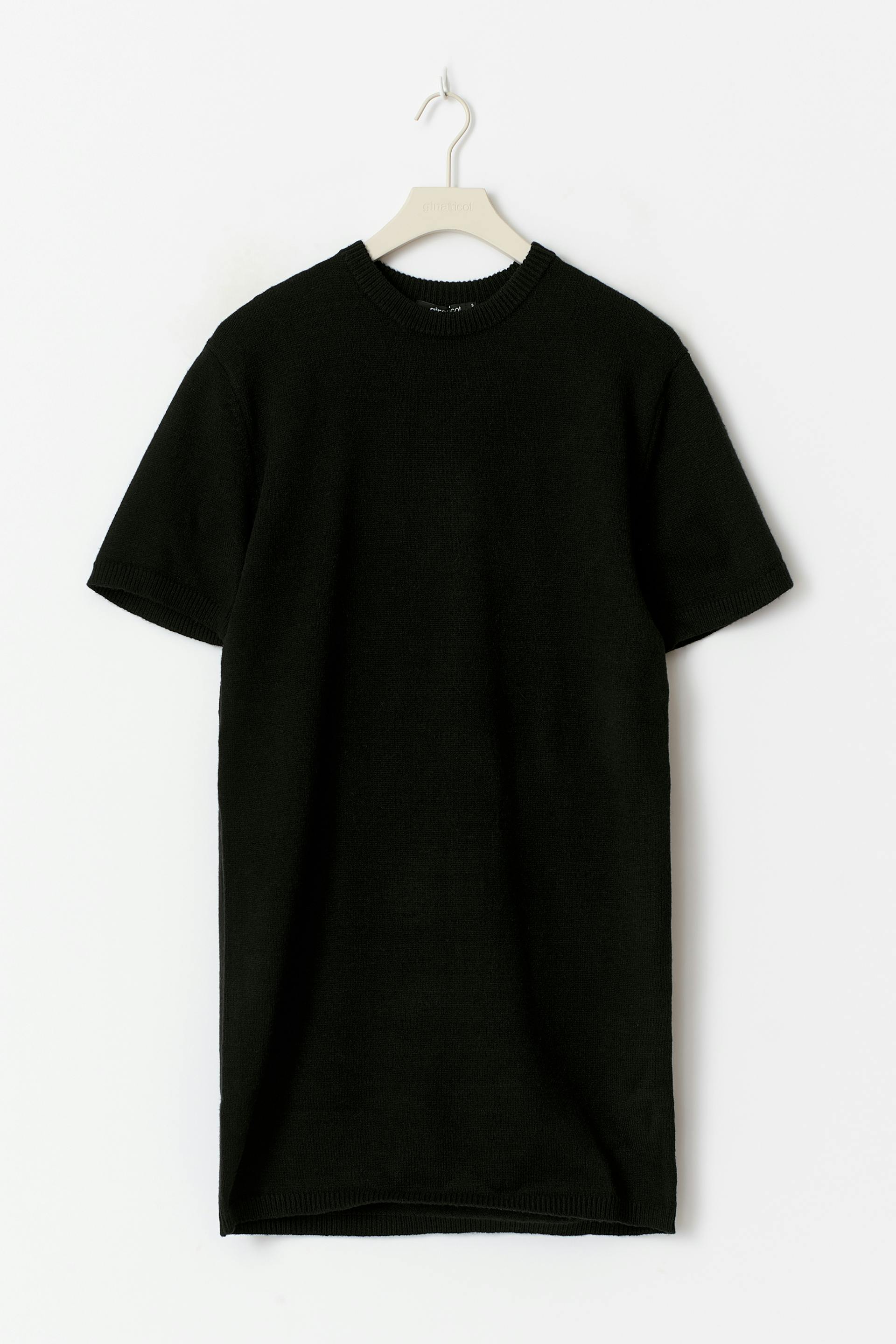 Gestricktes Kleid mit Rundhalsausschnitt. Das Kleid ist kurz, kurzärmlig und schwarz. Es hat normale Passform.