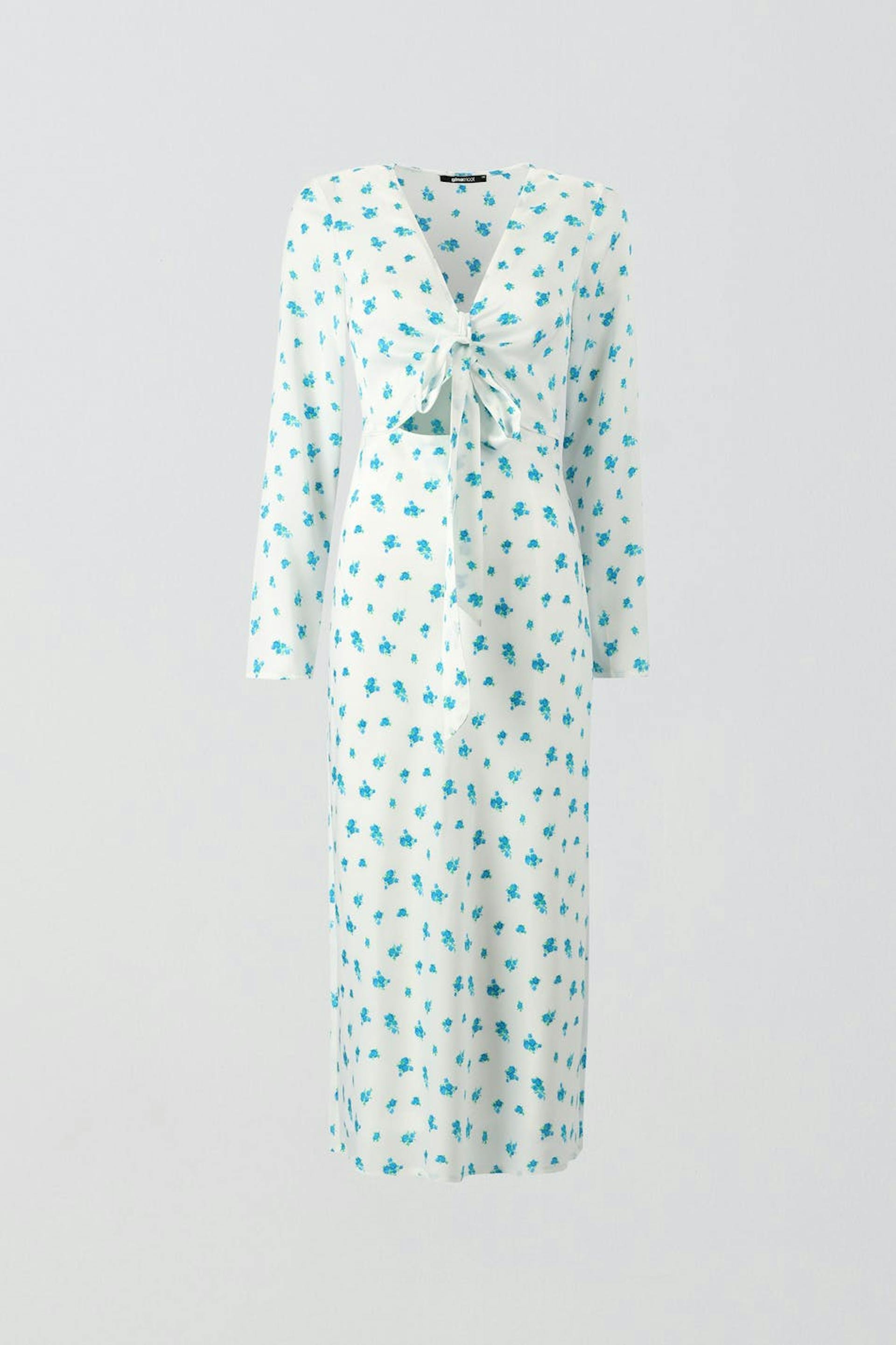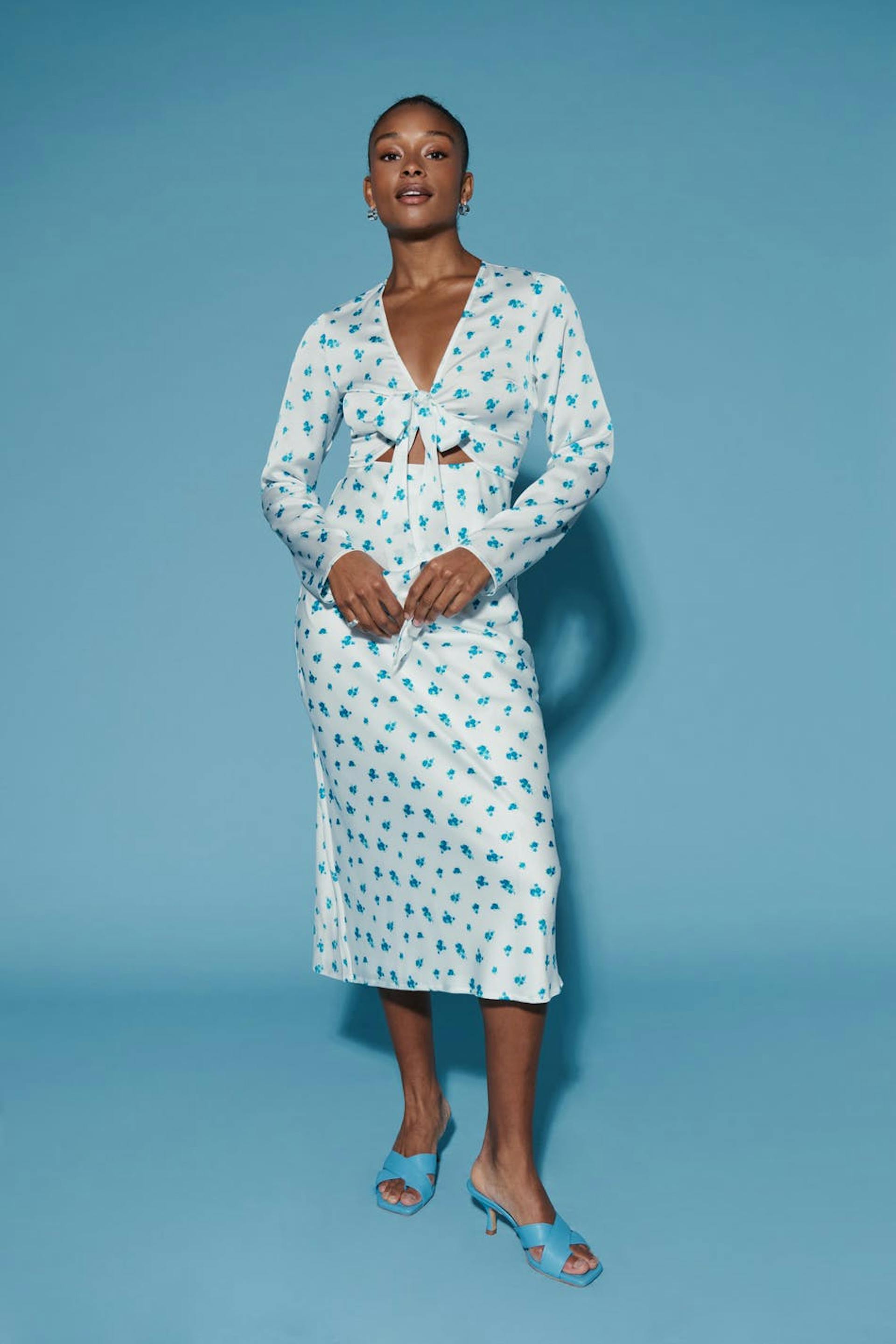 Blumiges Midikleid aus Satin mit Knotenverschluss vorne. Das Kleid ist blau, weiβ und langärmlig. Es hat eine weiche, glänzende Qualität, ausgeschnittenes Detail vorne, V-Ausschnitt, Reißverschluss in der Seitennaht und taillierte Taille.