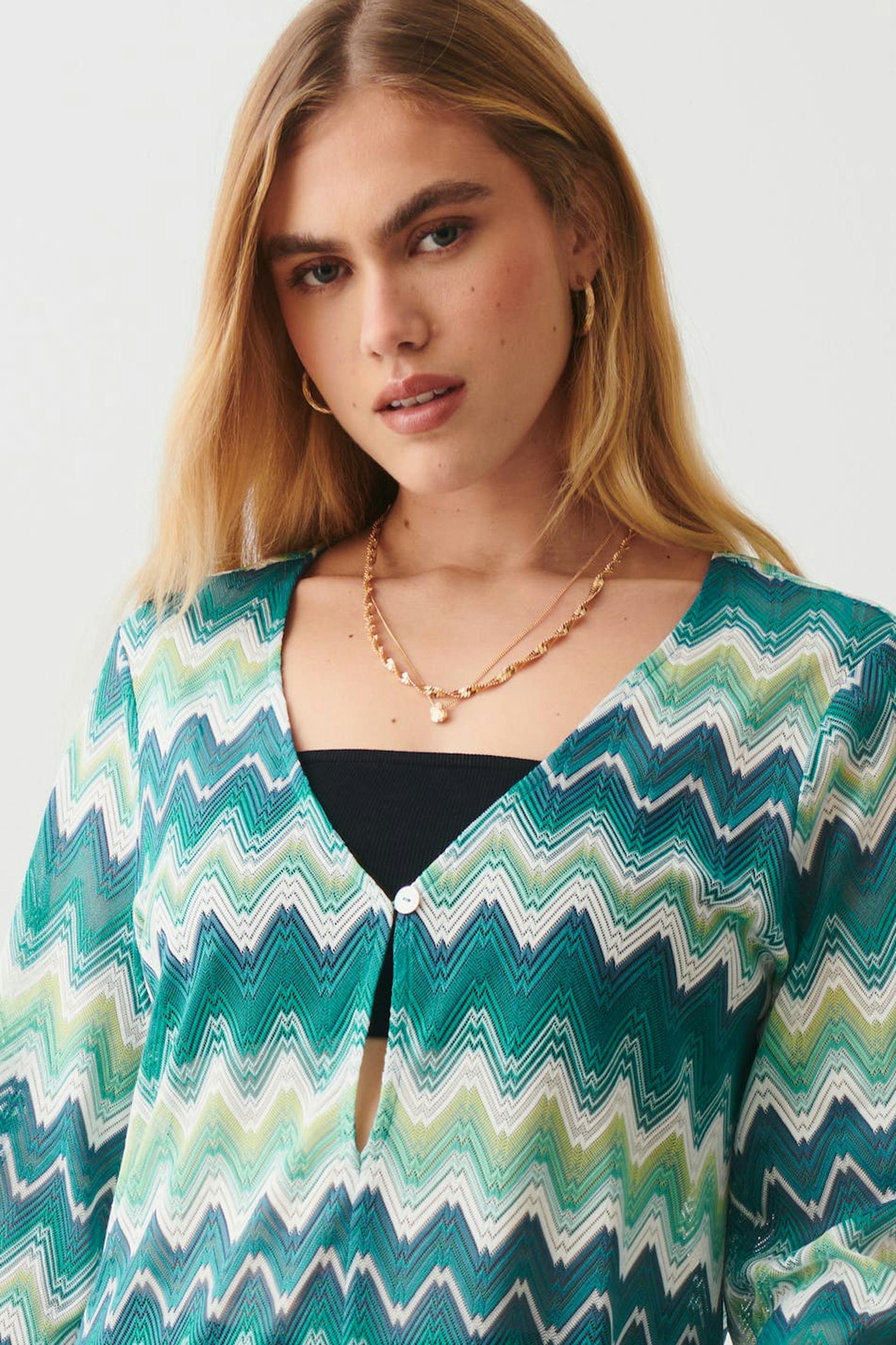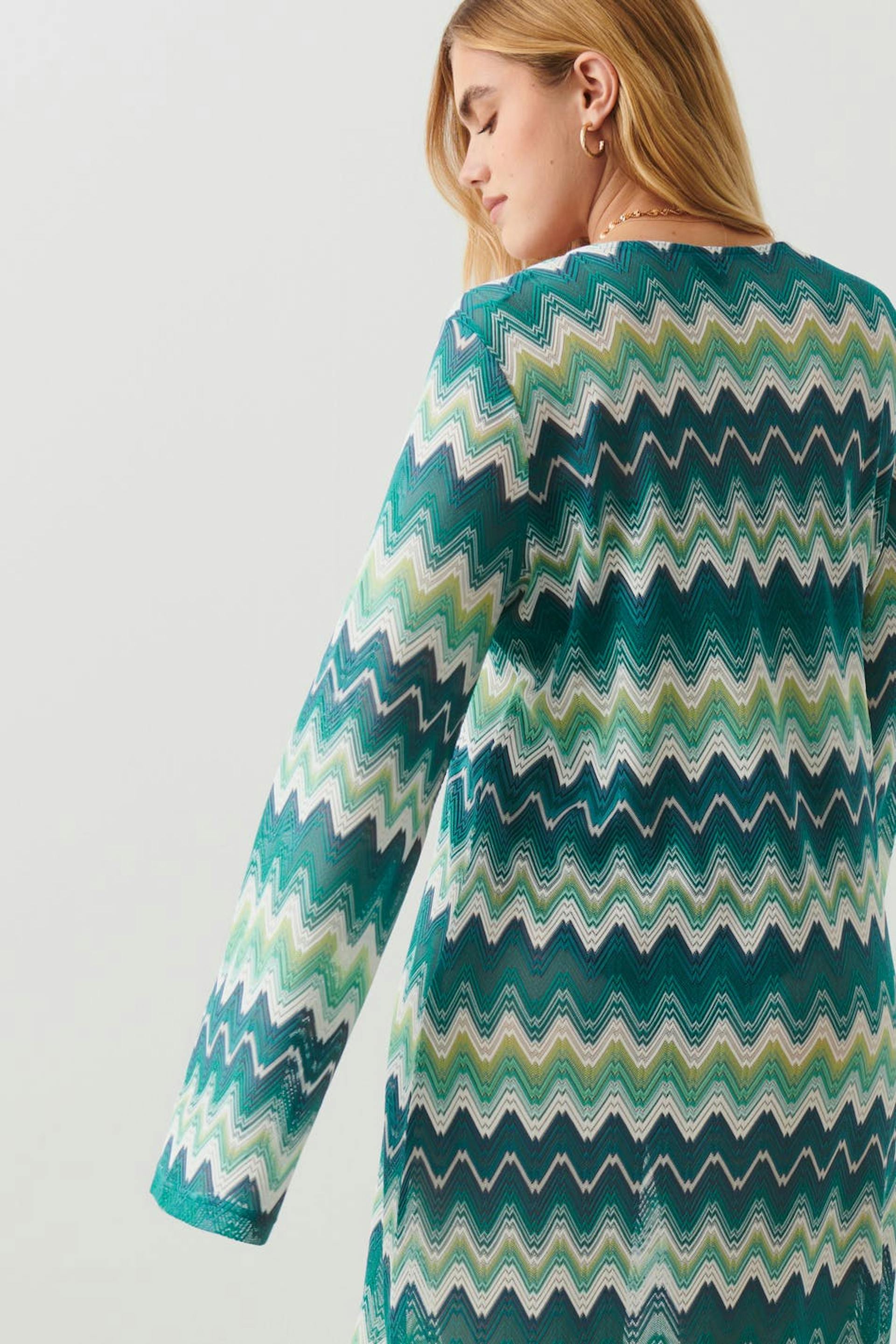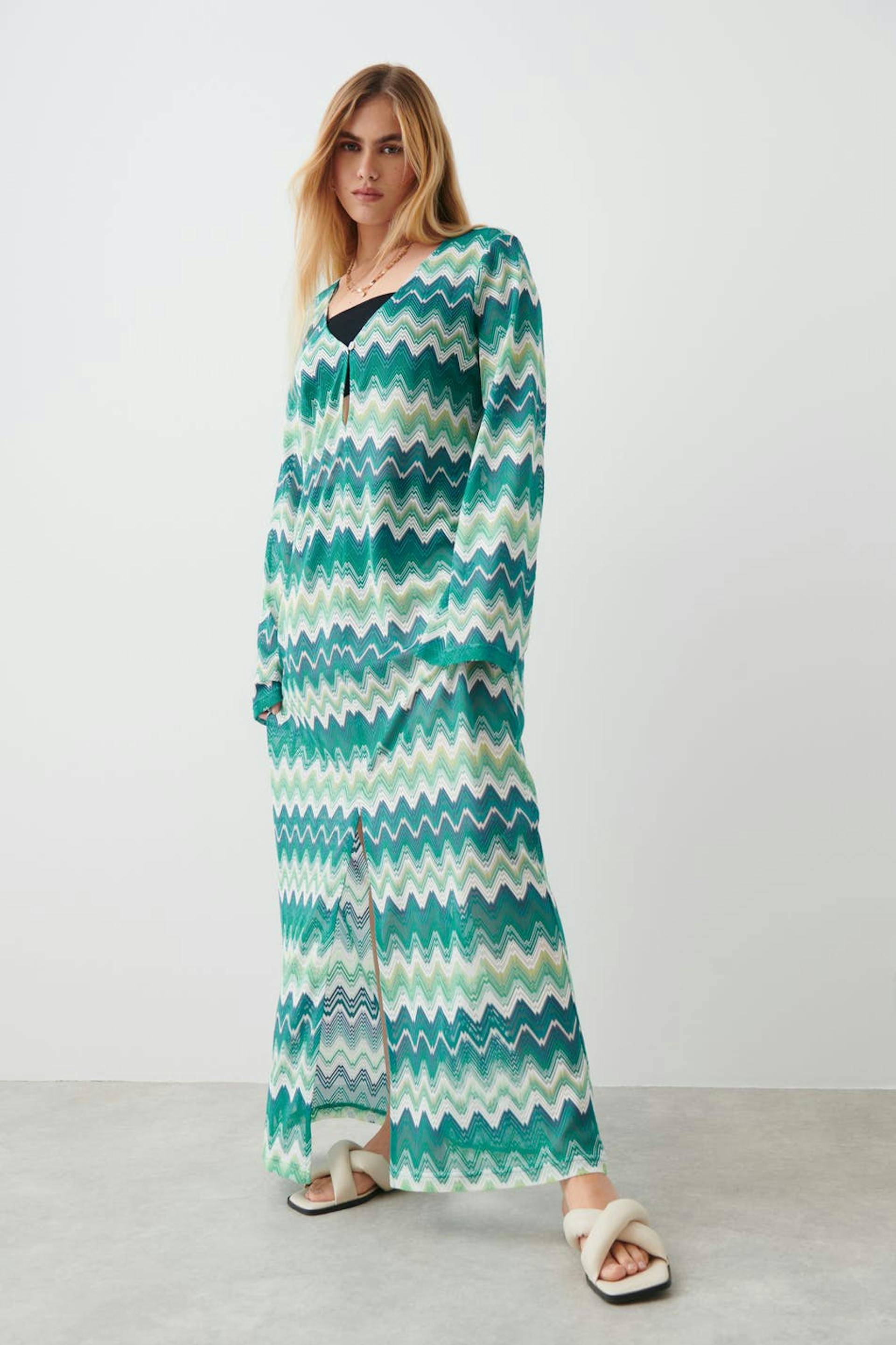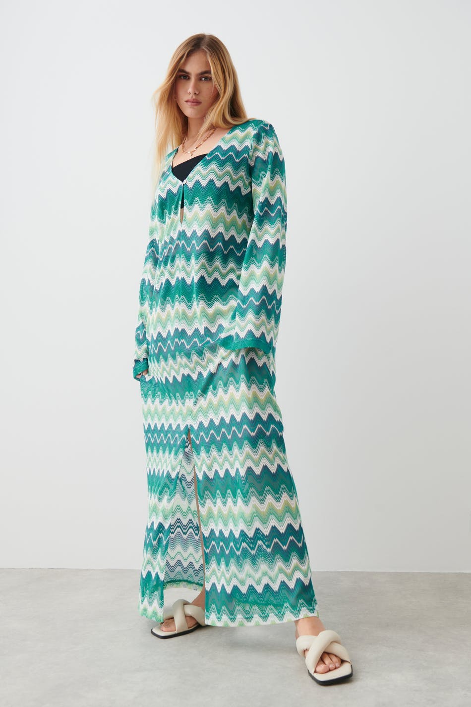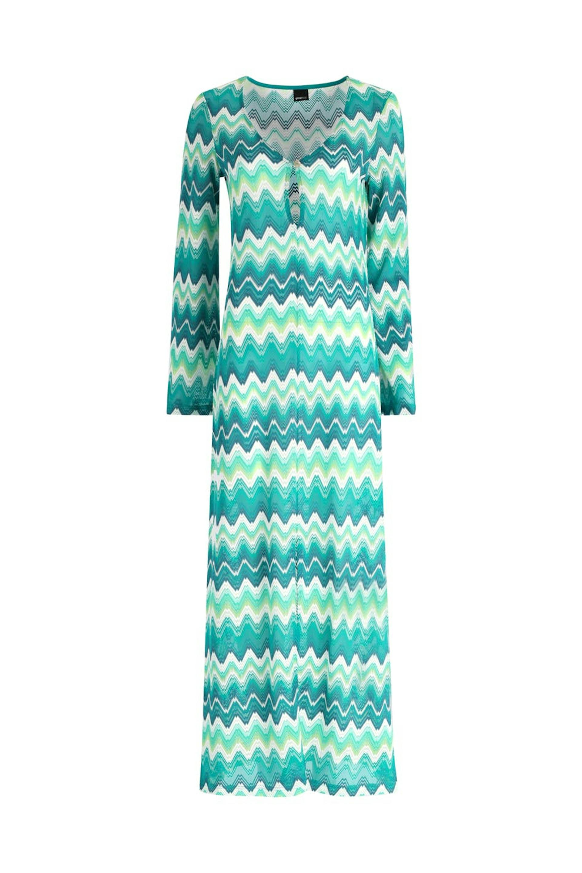 Langärmliges Maxikleid aus Jersey mit Schlitz vorne. Das Kleid ist blau, gemustert und weiβ. Es hat normale Passform und V-Ausschnitt mit Knopf und Schlüssellochöffnung.