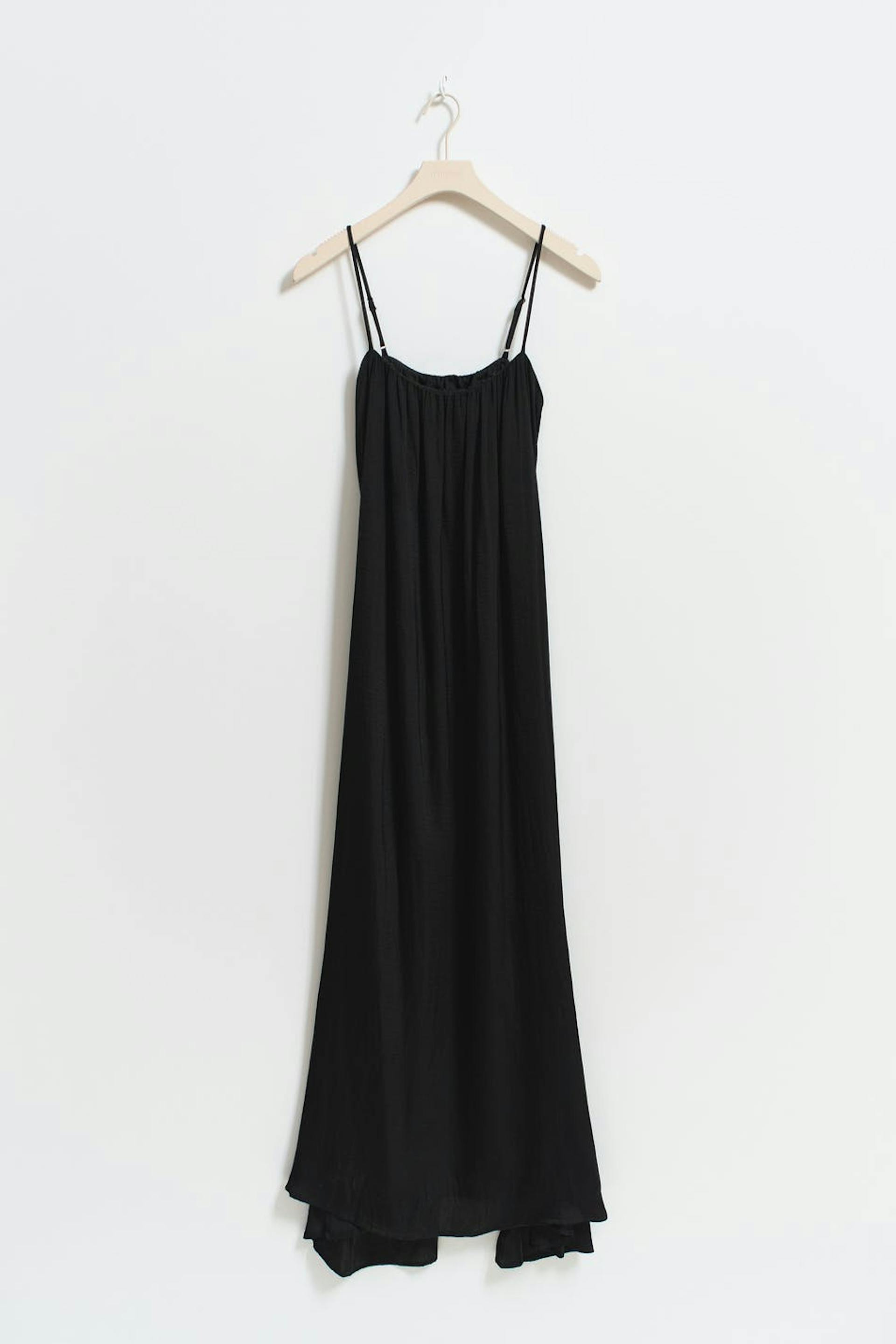 Ärmelloses Maxikleid mit weit-geschnittenen Style. Das Kleid ist schwarz und hat weiche Qualität mit Drapierung. Es hat schmale, verstellbare Trägerbänder, Gummiband an der Oberkante und extralange Passform. Ideal bei einer Körpergröße ab 1,75 m.