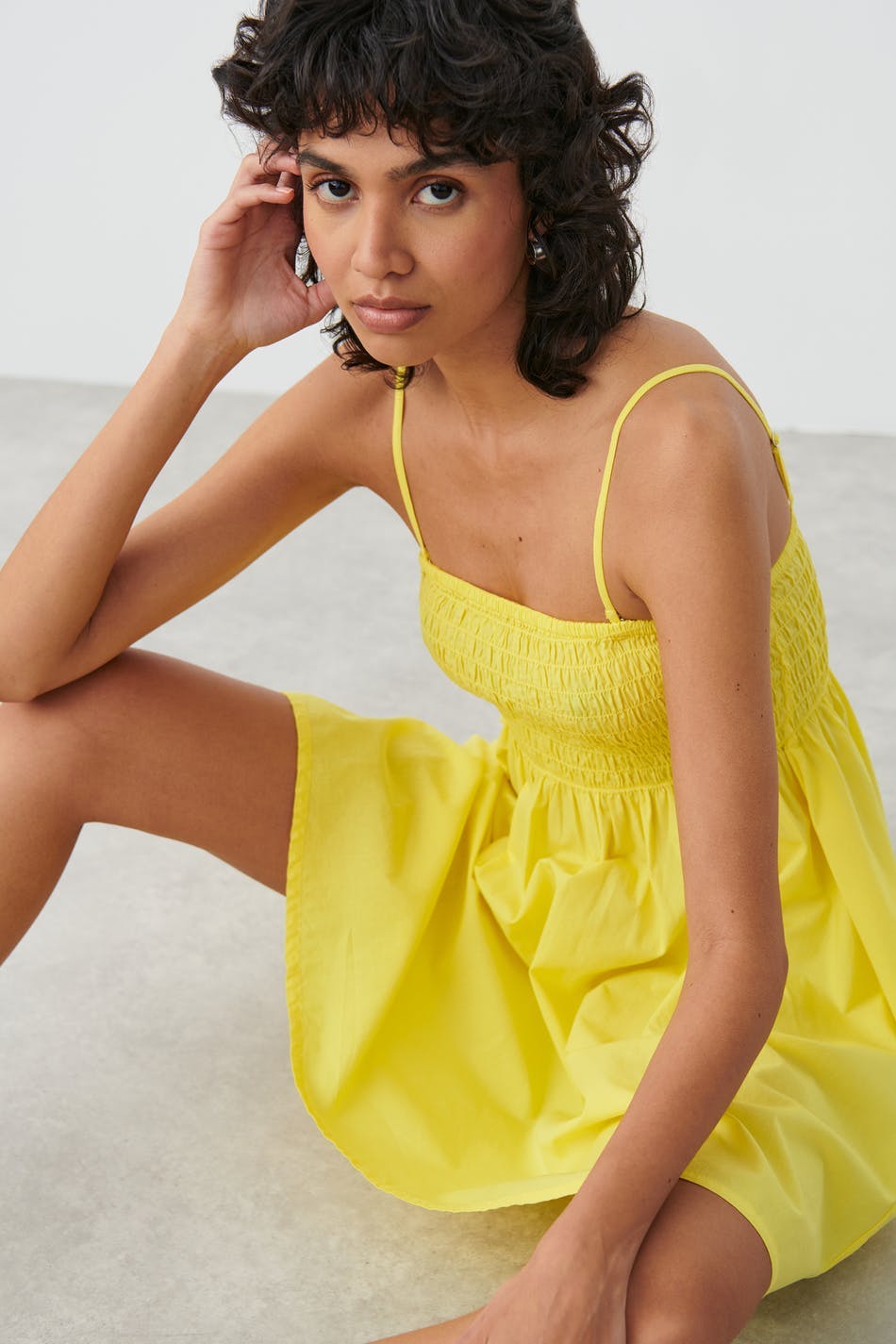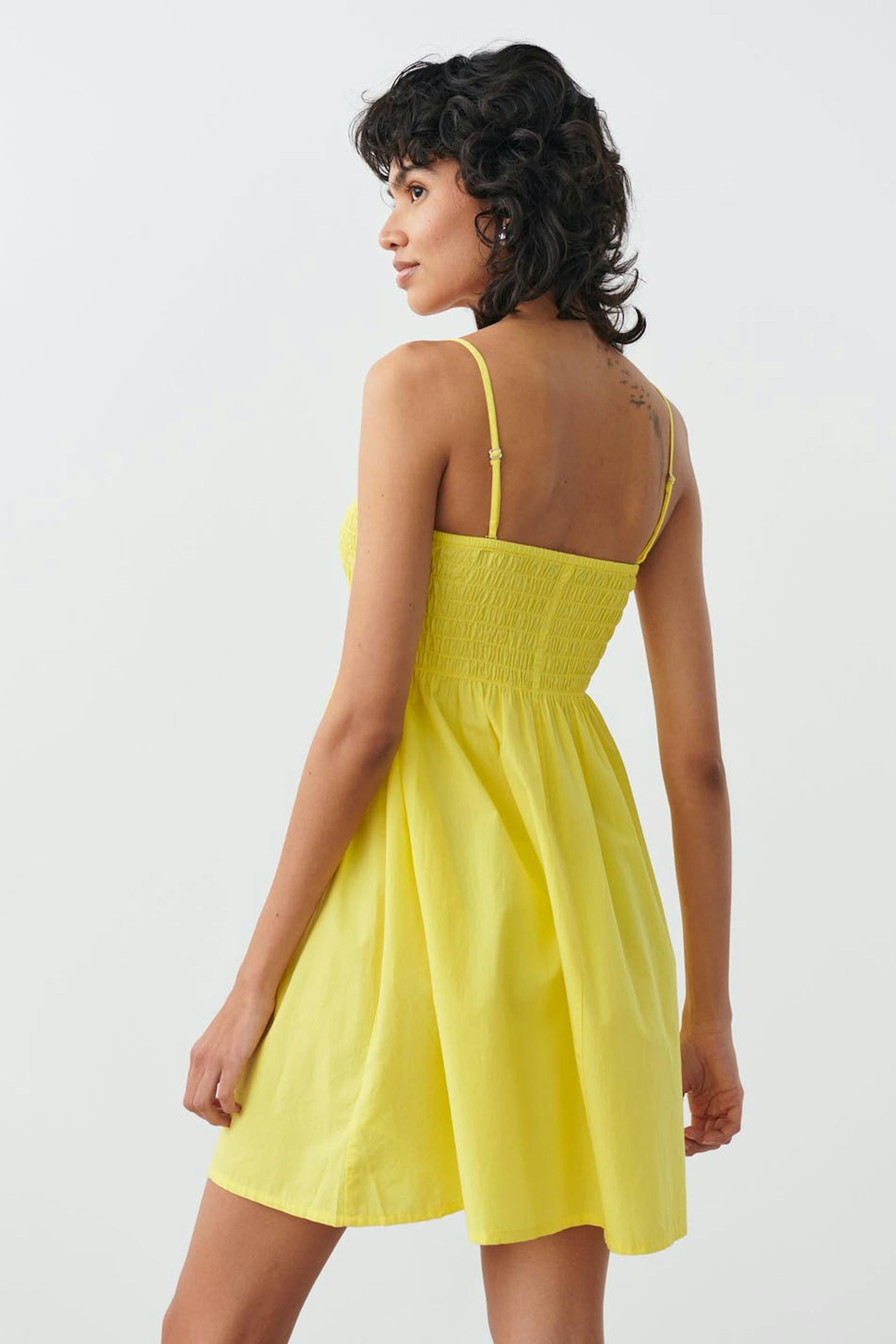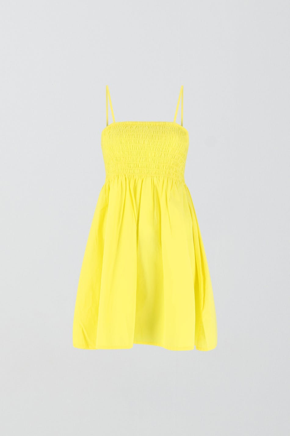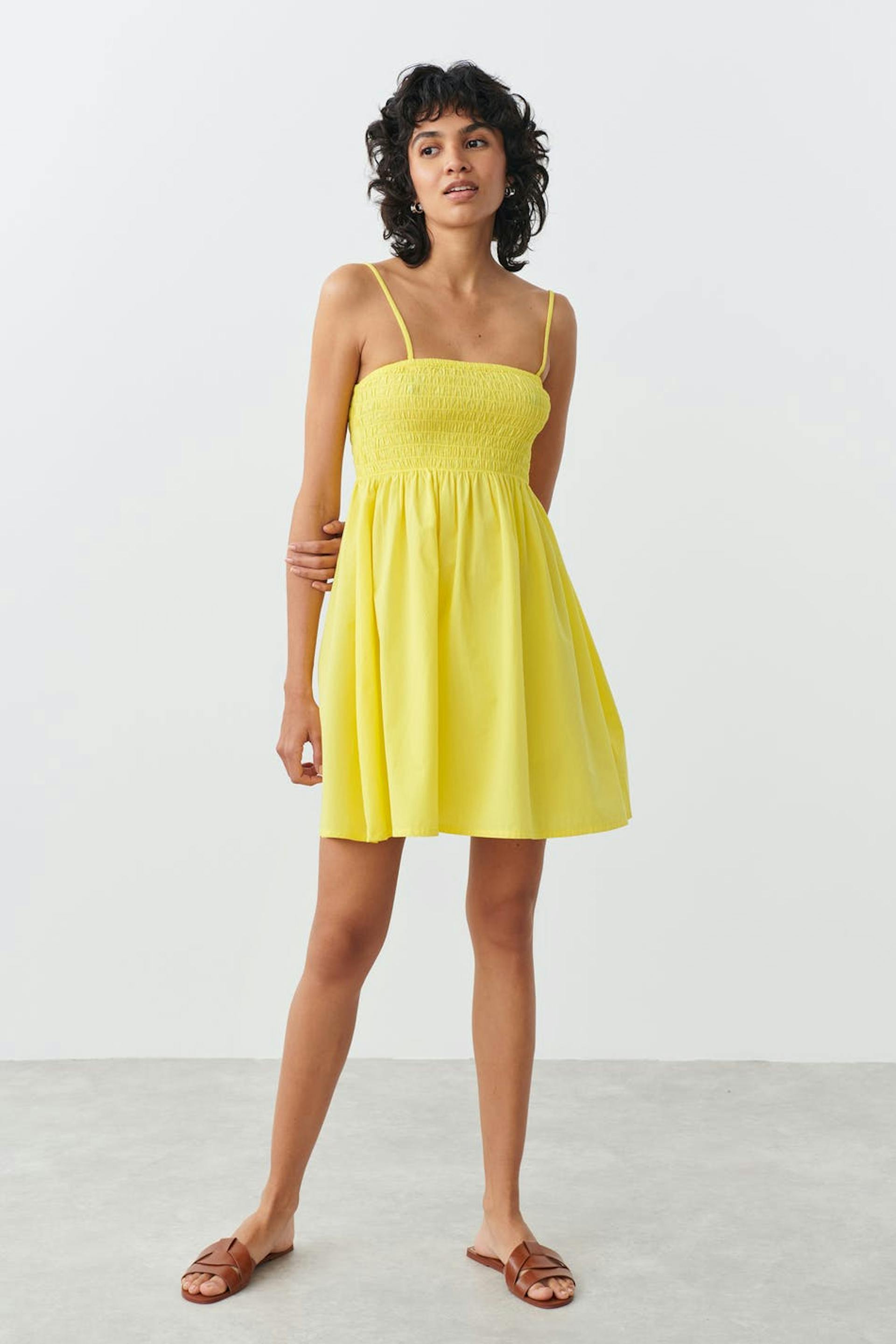 Kurzes Kleid mit schmalen, einstellbaren Trägerbändern. Das Kleid ist gelb und hat einen Rüschenrock unten. Es hat gewebte Qualität.